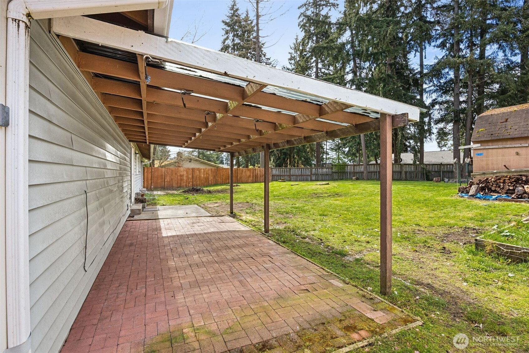 Welcome to this charming rambler located on a spacious .3-acre lot in The Meadows neighborhood. This home boasts laminate flooring throughout. The inviting living room features a cozy wood-burning fireplace and a large window that provides an abundance of natural light. The updated kitchen is equipped with stainless steel appliances, including a double oven, a stylish tile backsplash, and painted cabinets. The primary bedroom offers a closet with custom built-ins and a convenient 3/4 bathroom. Two additional guest rooms provide ample space for guests or a home office, and are complemented by a full guest bathroom. Enjoy the added convenience of a washer and dryer that are included with the home. The extra-large 2-car garage is a true standout, featuring shelves and a workbench for all your storage and hobby needs. Large, fully fenced backyard that includes a firepit, gazebo, shed, garden beds, and a covered patio area – perfect for year-round enjoyment. Additionally, you'll find RV parking, offering plenty of room for your recreational vehicles. With vinyl siding and forced air heating, this home is both low maintenance and efficient!