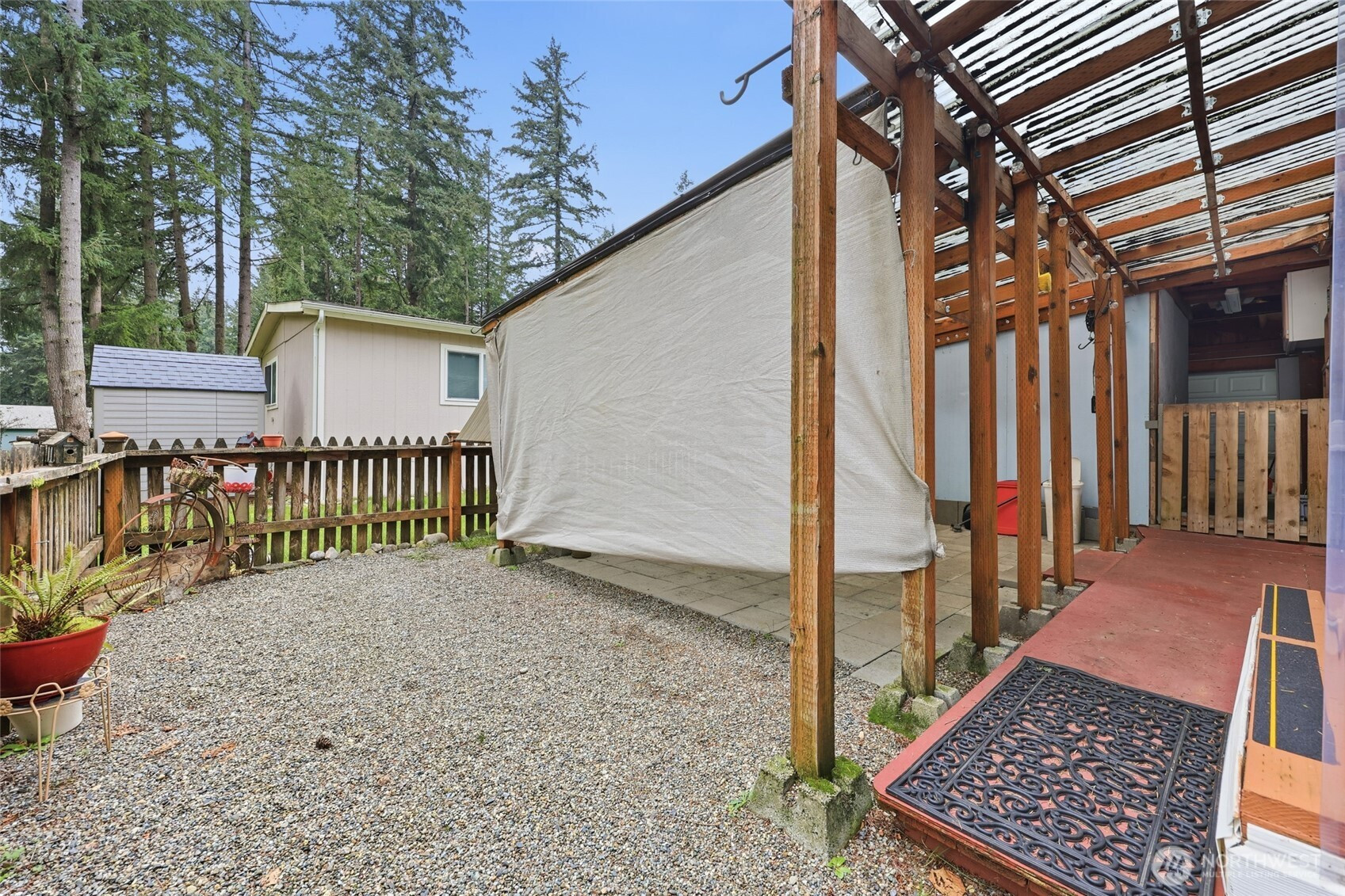 Have it all at an affordable price. Manufactured home with yard, storage sheds and 2 car enclosed carport in the lovely park of Whispering Woods. Enjoy country living away from the bustle of city traffic, yet live just minutes from shopping, dining and I-5 for commutes. 2 bedroom home with den/office, living room, updated ample sized kitchen with newer appliances and soft close cabinets. Split bedroom floor plan, primary bathroom with double sinks, soaker/jetted tub. Loads of storage space inside and out. 2025 roof with 40 year transferable warranty. 2016 forced air furnace w/AC. No age restrictions, pets allowed. Park fees are a manageable $665 per month which covers water, sewer and garbage. All appliances stay!