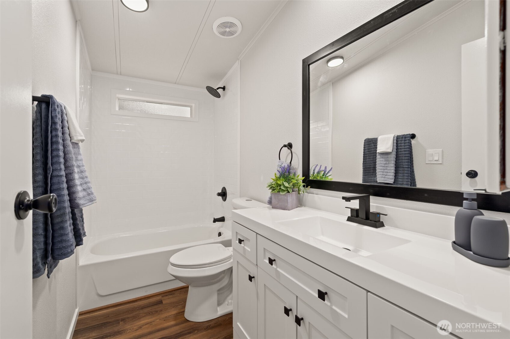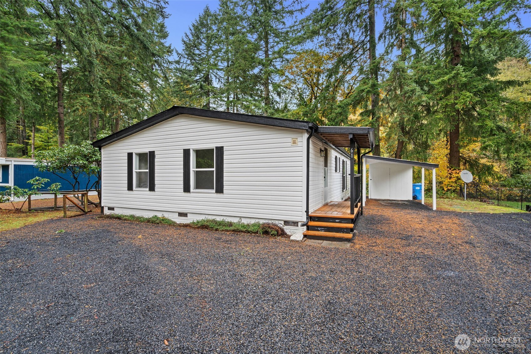 Don't miss your chance to live in Whisperings Woods, one of the areas most sought after manufactured home parks. Bring your belongings- this home is ready for move-in! The chef of the house will love the brand new kitchen, including all new shaker cabinets, quartz countertops, sink, fixtures & stainless steel appliances. New waterproof luxury vinyl plank flooring in all the high traffic areas & upgraded carpet in the bedrooms. New windows, bath fixtures & fresh paint on the inside & out. New baseboards, trim & led lighting throughout. The heat pump will keep you warm in the winter months & cool (AC) in the summertime. Grab that favorite beverage & head out onto your new deck & enjoy the serenity of Whisperings Woods. Only mins from I-5.