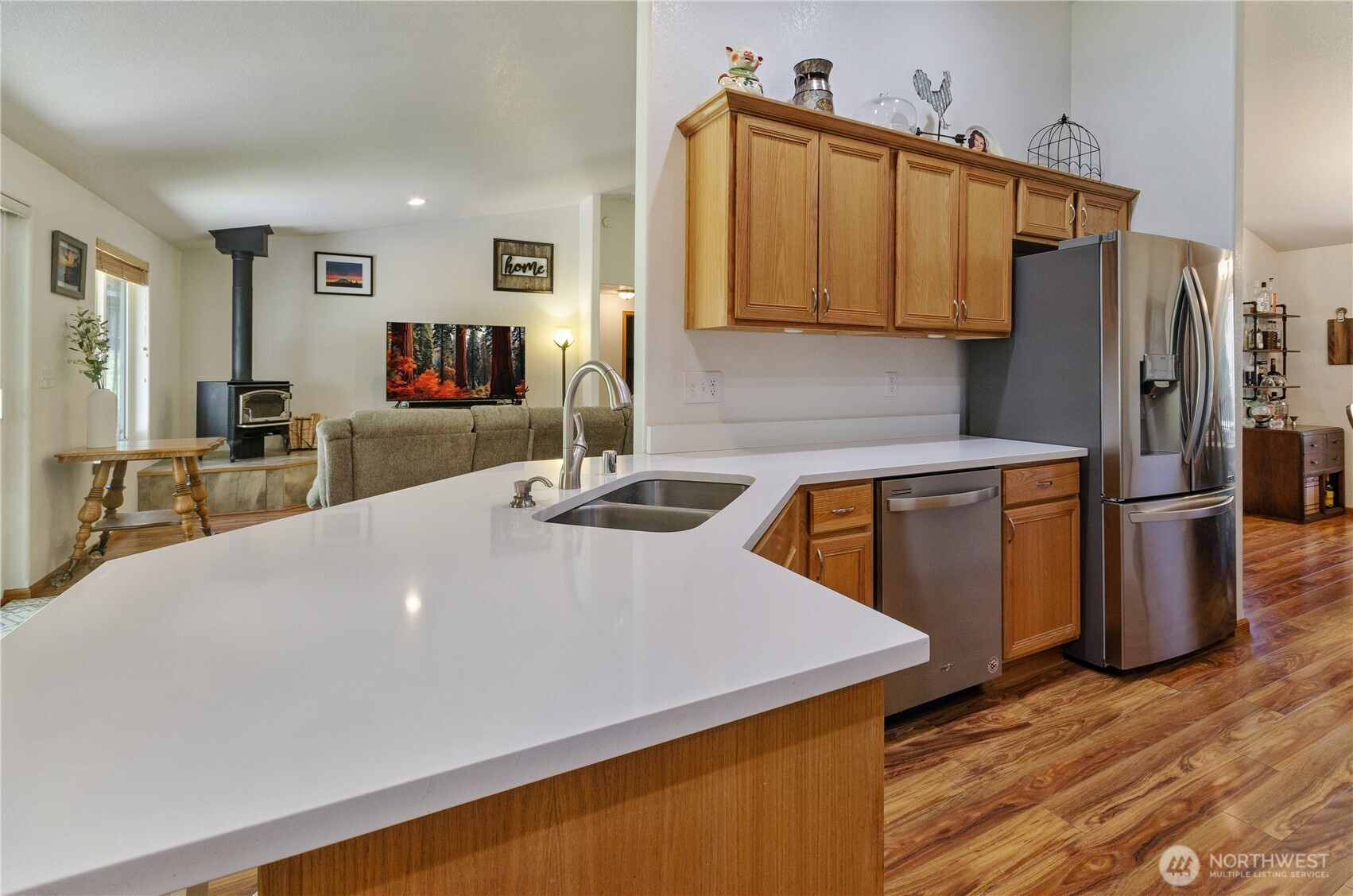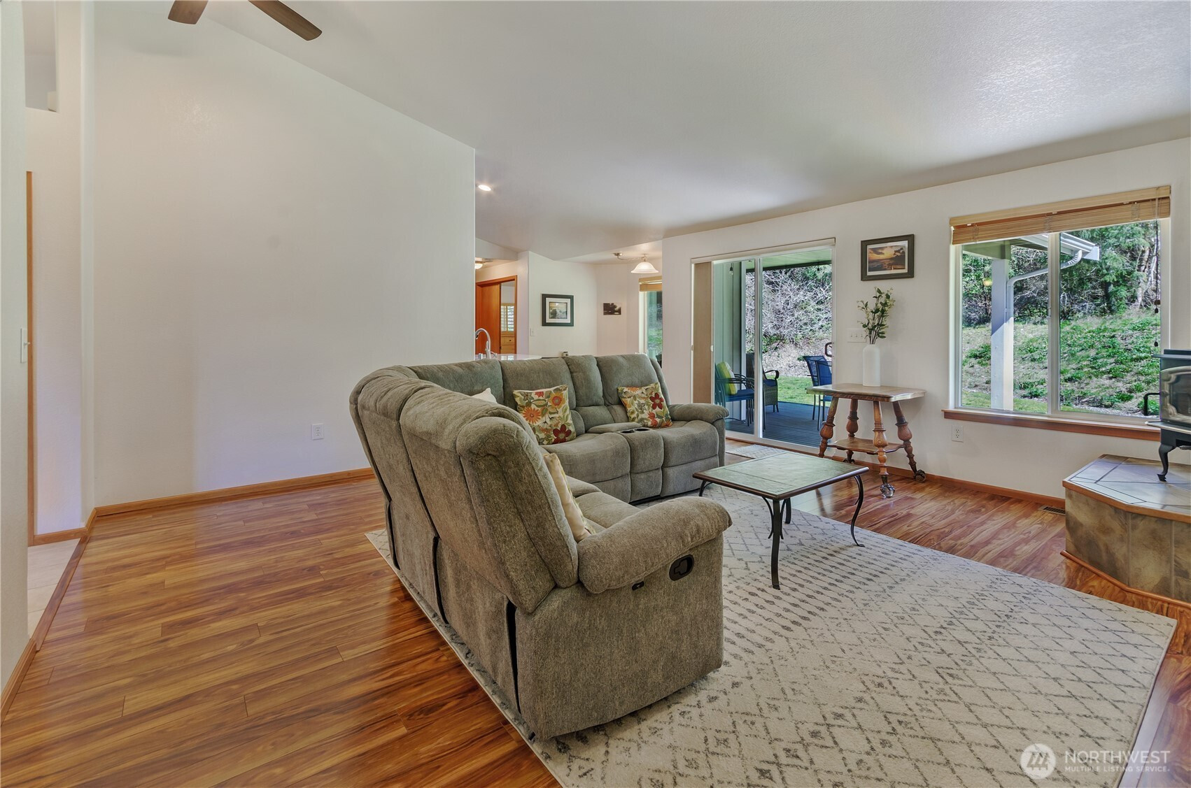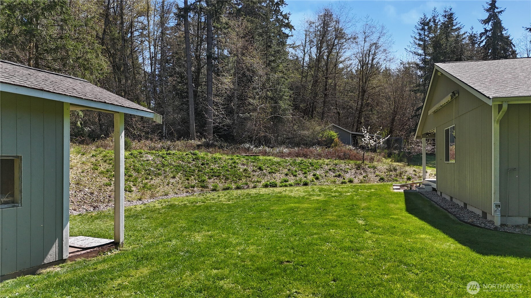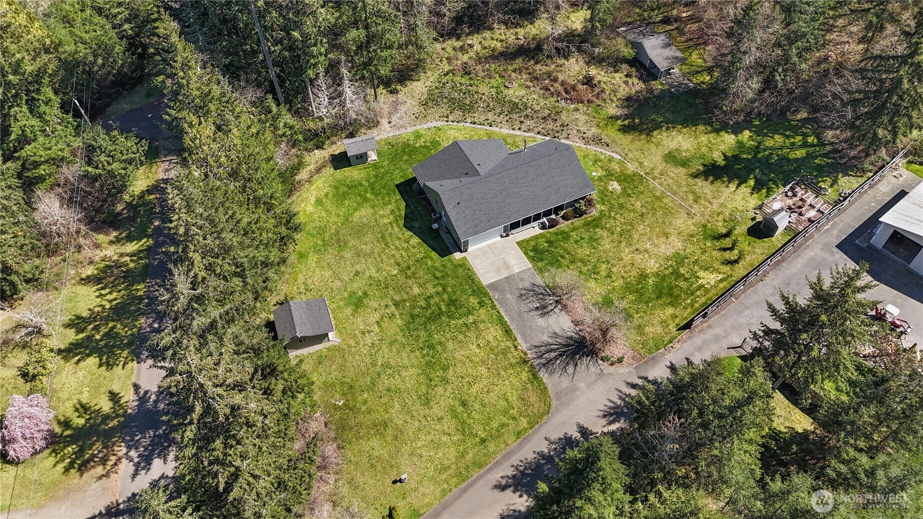 Set in the quiet beauty of the Maytown countryside, this well-cared-for rambler offers comfortable living on 2.25 acres w/ a thoughtful & functional layout. Vaulted ceilings enhance the sense of space in the main living areas, where a wood-burning stove creates a warm, inviting focal point. Kitchen designed for everyday ease, featuring hard surface counters, newer stainless steel appliances, breakfast bar & nook. Off entry, a flexible bonus space across from the dining area provides options for your needs: home office, den, game room? Primary suite is a private retreat, separated from additional bedrooms by common areas. Primary features 5-piece ensuite w/ walk-in closet, linen storage, plantation shutters, & direct access to covered back porch. Year-round comfort delivered via a heat pump, & key system updates: including a NEW ROOF (2025), newer HVAC (2020), generator & UV water treatment system w/ charcoal filtration (2020) add confidence for years to come. Outdoors, enjoy a level, usable yard surrounded by mature trees & rolling natural landscape. Two outbuildings offer exceptional versatility - one fully finished w/ power (ideal for a gym or studio), & another suited for workshop or storage needs. Bonus additional woodshed stocked for cozy fires! Covered front & back porches extend your living space into the serene outdoors, where wildlife sightings & seasonal blooms complete your PNW oasis experience. A rare opportunity to enjoy quiet country living w/ modern comforts!