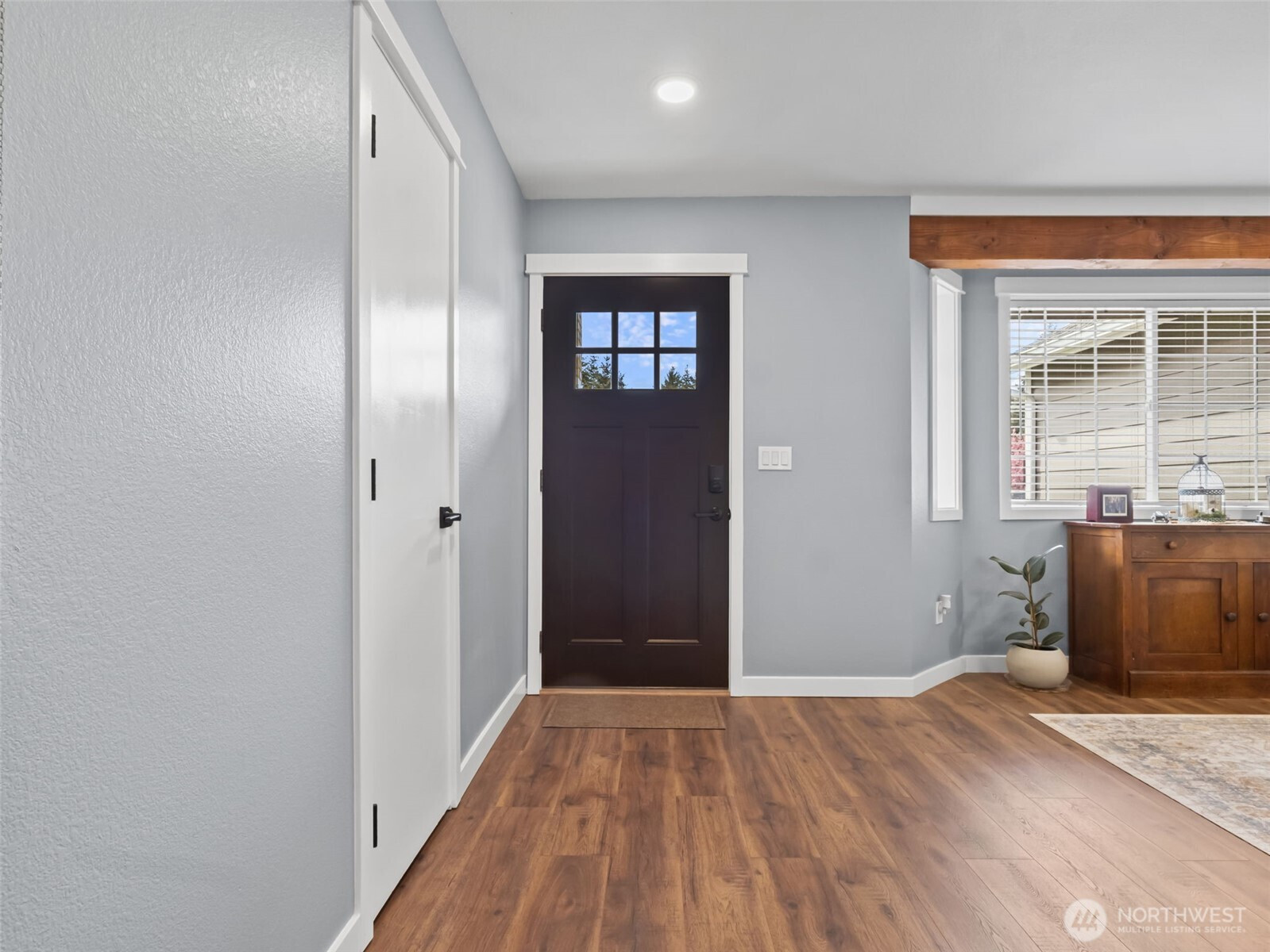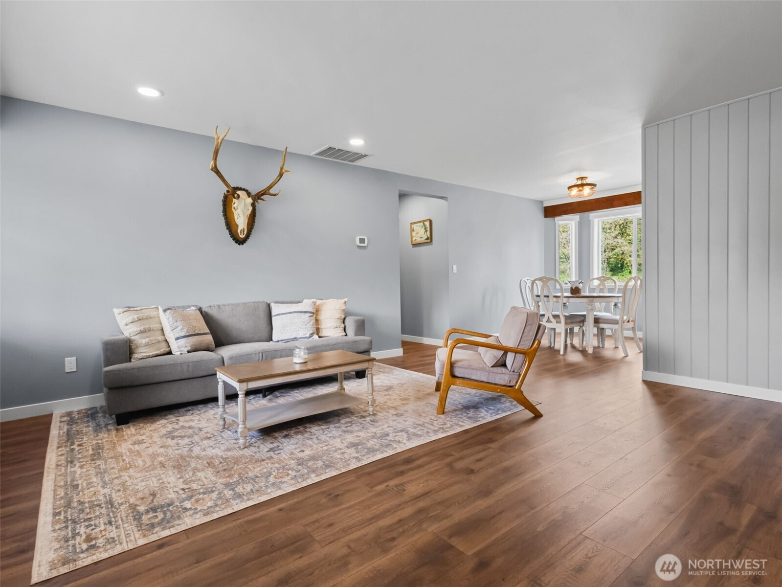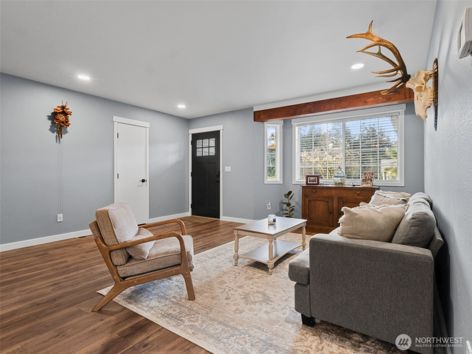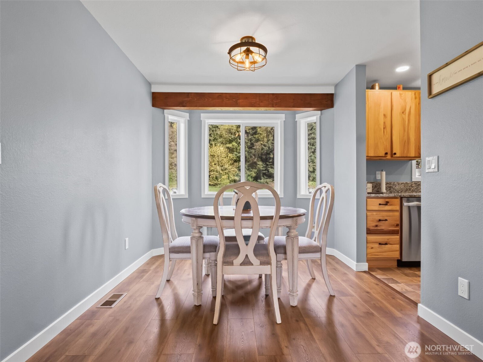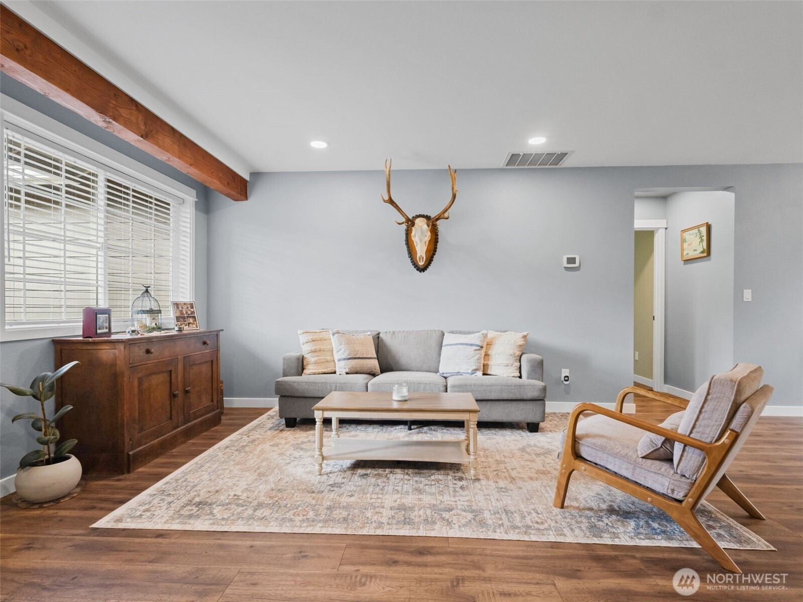 Come see this beautifully updated home just minutes from I-5, offering the perfect blend of convenience and peaceful country living. Set on 1+ acres, this property provides privacy and space to enjoy the outdoors. Extensive recent updates include new Pergo XP flooring throughout, all new interior trim, fresh interior and exterior paint, updated lighting, and remodeled bedrooms and bathrooms. The home features exposed beams in the living and dining areas, adding warmth and character, along with a beautifully updated kitchen with hickory cabinets and quartz countertops. Enjoy the flexibility of multiple living spaces, including a welcoming front living room and an additional living area—perfect for relaxing or creating separate spaces for everyday living. Stay comfortable year-round with A/C and take advantage of the outdoor space featuring a fire pit area and a covered BBQ area for year-round use. A detached shop offers excellent space for storage, hobbies, or projects, while the attached two-car garage adds everyday convenience. Additional updates include a new front door, new hot water tank, and a recently pumped and inspected septic system. Move-in ready with modern upgrades—don’t miss this one!