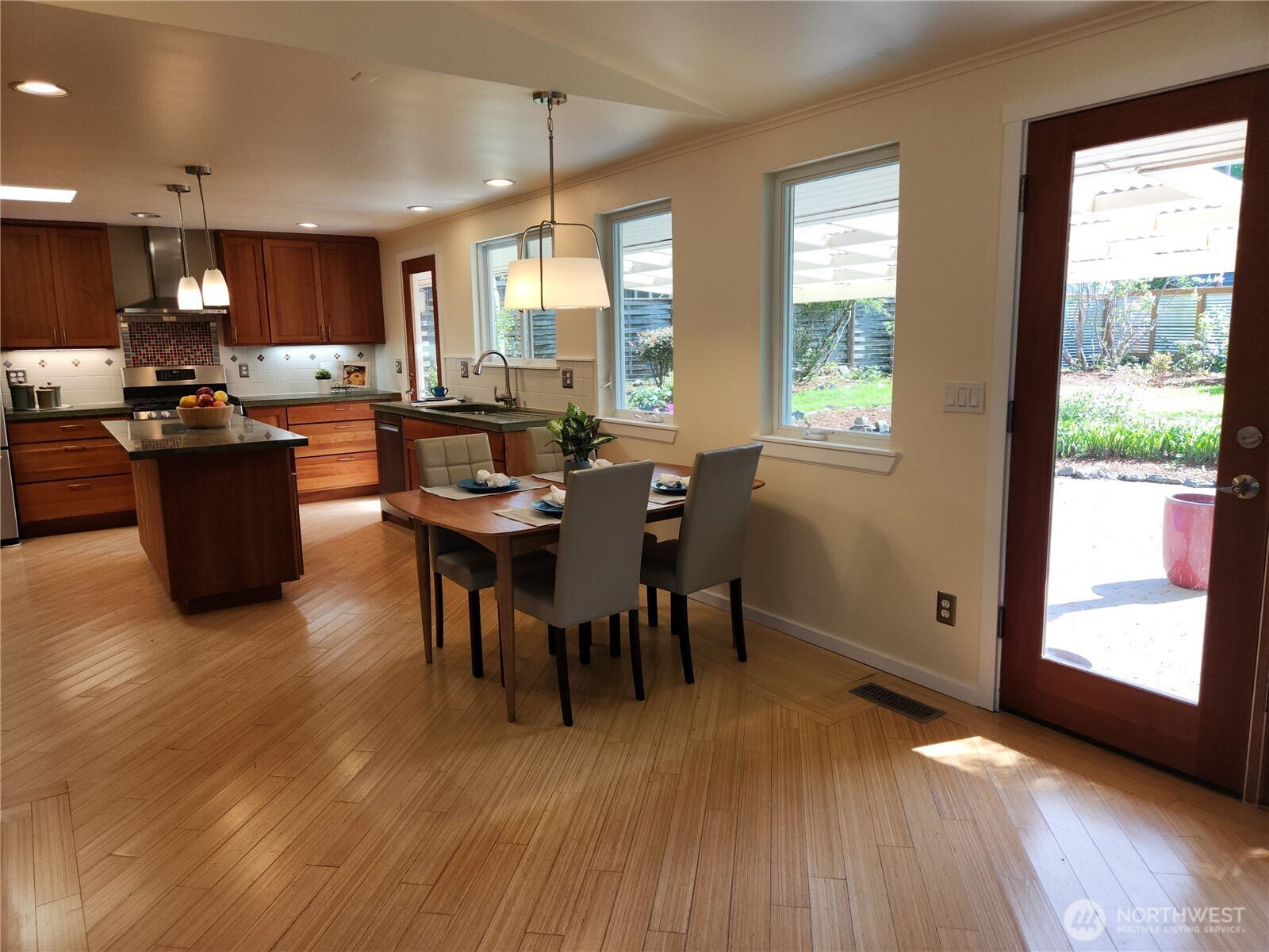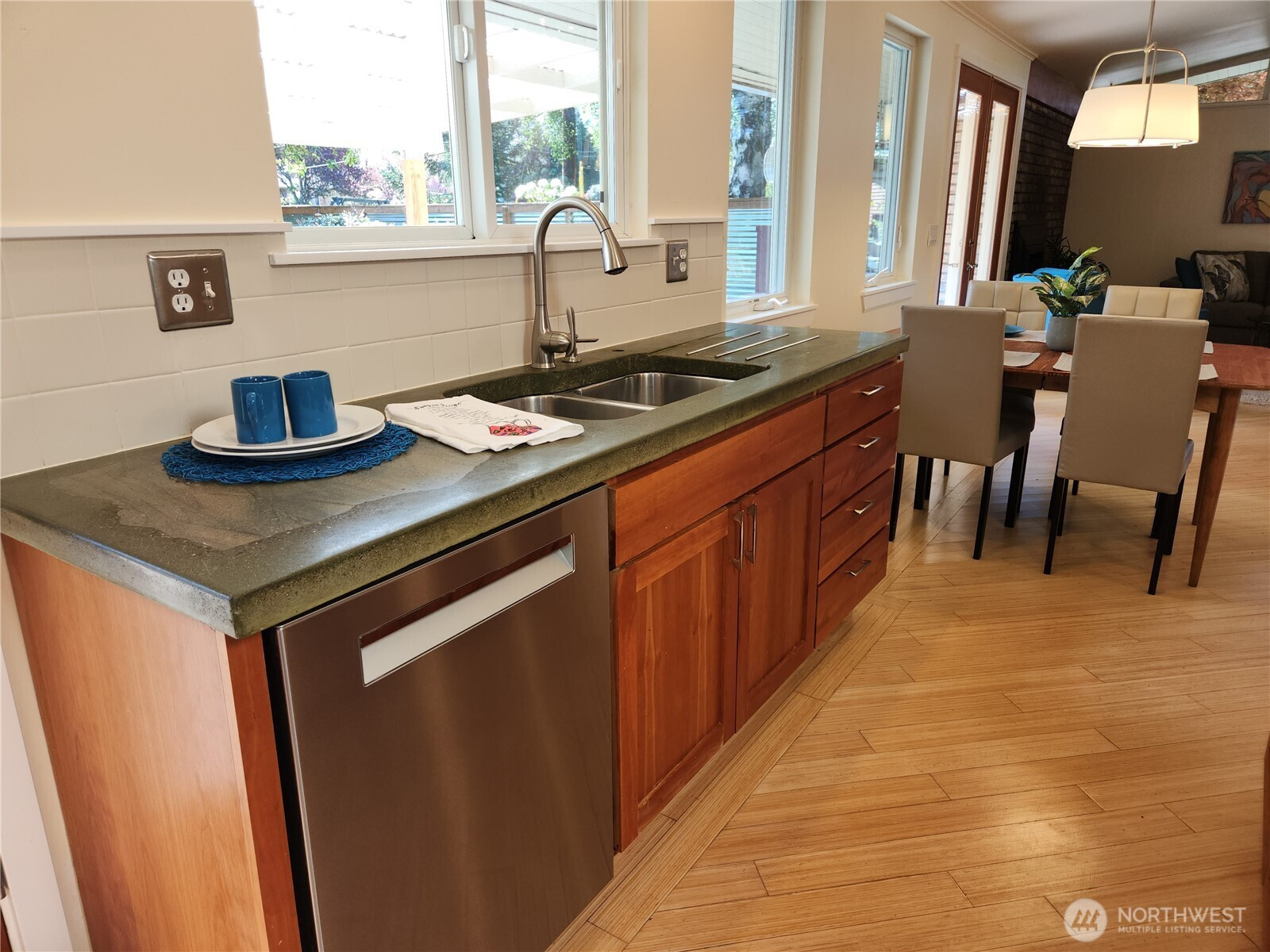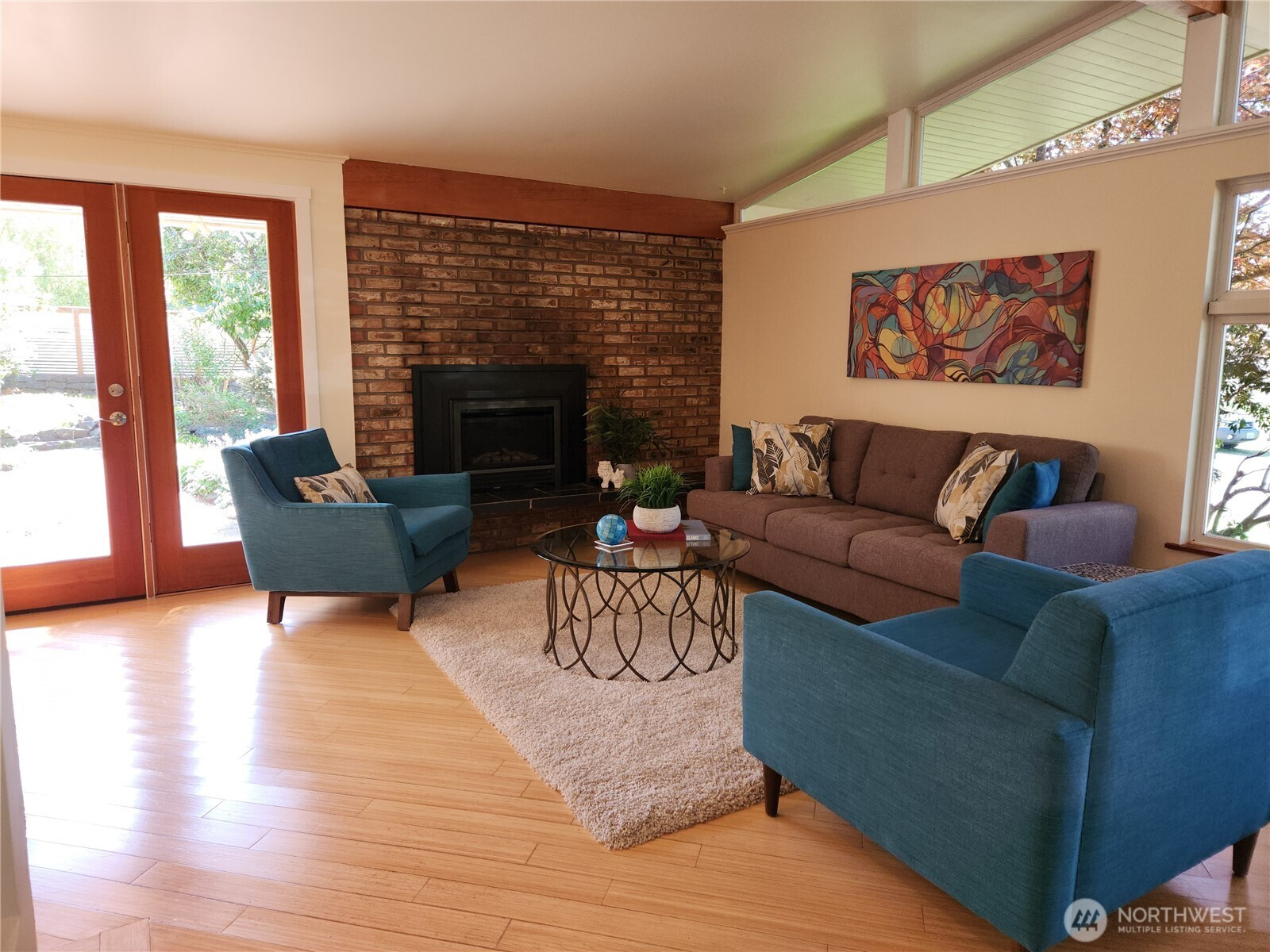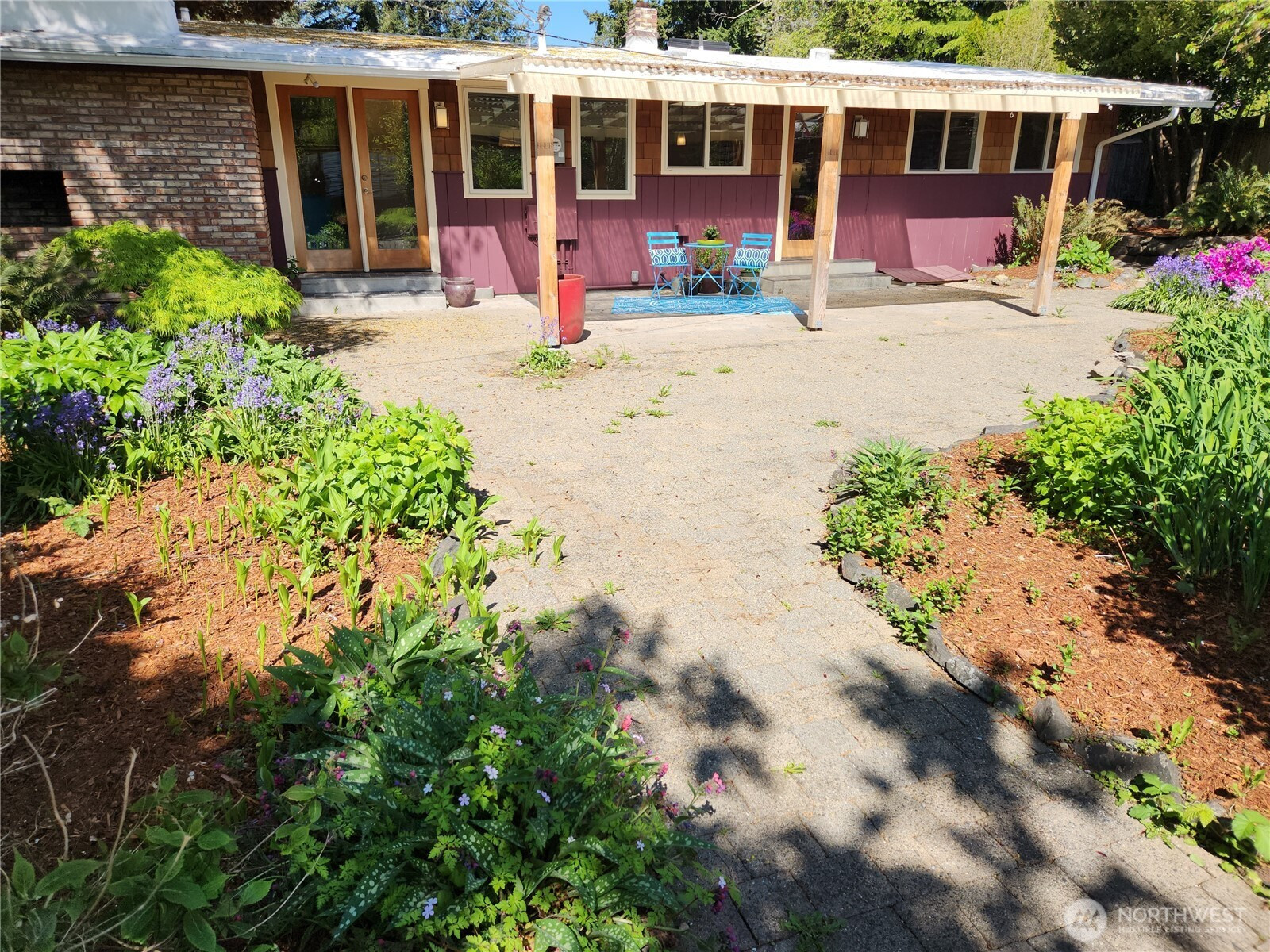 Updated mid-century home tucked into a private, peaceful setting in a highly desirable Olympia location close to shopping, dining, and everyday amenities. Situated on a corner lot within a quiet cul-de-sac, this property offers a rare sense of privacy with established landscaping creating a truly tranquil, retreat-like outdoor space. Fully fenced backyard features multiple outdoor living areas including a covered patio and outdoor fireplace, ideal for year-round enjoyment. Multiple access points connect the indoor living spaces seamlessly to the outdoors, enhancing the home’s open and inviting feel. Inside, you’ll find bamboo flooring throughout, abundant natural light, and an open, connected layout that complements the home’s architectural character. The living area features a gas fireplace, while the kitchen offers custom concrete countertops and all appliances included for added convenience. This 3-bedroom, 2-bath home blends comfort and function without sacrificing style. With its combination of privacy, character, and convenient location, this home offers a lifestyle that is hard to find at this price point. Come experience the setting and see all this property has to offer.