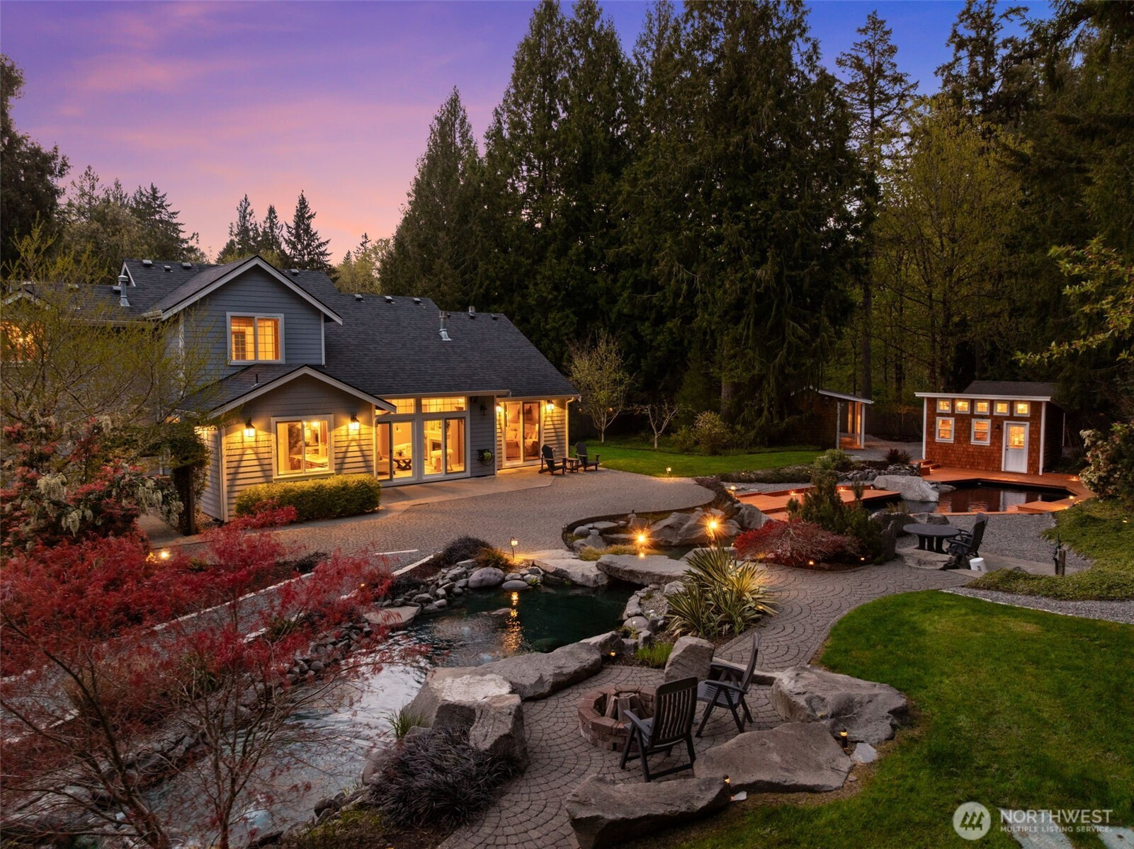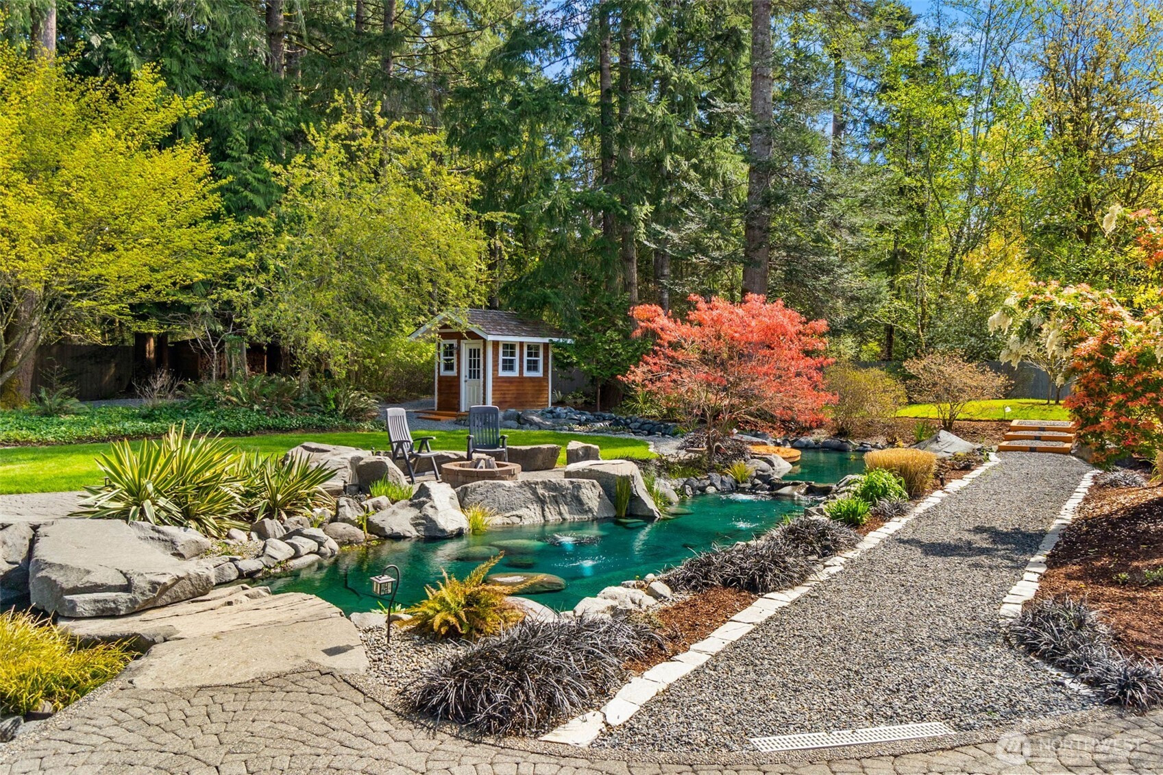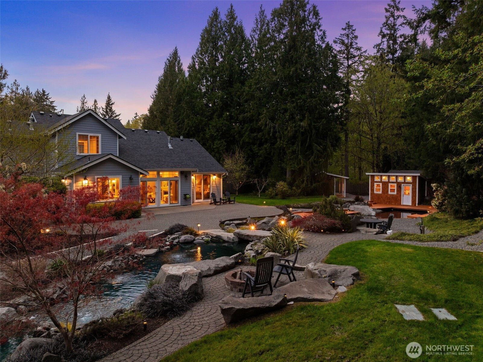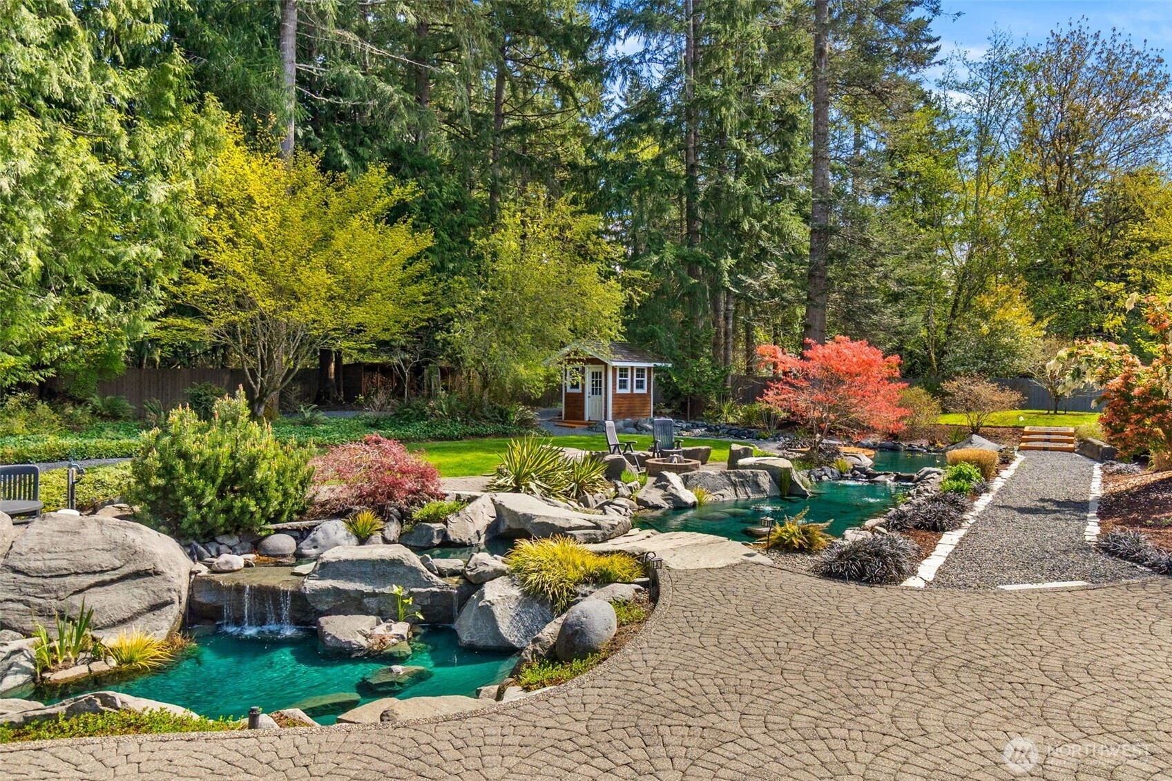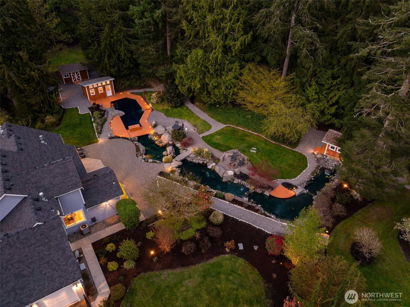 Welcome to Water Garden Escape on Cooper Point. Anchored in versatility w/a stunning 160± sf water feature inviting you to unwind w/the soothing sounds of a babbling brook while your private sports court & putt-putt add an element of playfulness & fun. Expansive windows invite the outdoors in, filling your home w/natural light & serene sights & sounds of the PNW. Quality craftsmanship, warm granite surfaces, rich hardwoods, tile, marble & beautifully appointed spacious kitchen & LR, multiple sliding glass doors spilling out to your own peaceful seclusion. Vaulted ceilings complemented by updated modern lighting & ceiling fans. Main-level primary ensuite is a true retreat, w/spa-inspired bath & double-sided FP. Upstairs, two addt'l bedrooms, full bath, bonus room w/wet bar provide ideal space for guests & entertainment. Stunning outdoor living space w/wraparound deck overlooking a pond that can easily be reintroduced to koi. Multiple entertaining spaces, including 100± sf back patio w/flowing garden ponds, trails, firepit & outdoor lighting. The property is surrounded by mature landscaping, featuring cedar, pine, apple trees, native plants & an abundance of wildlife. Gated access points, RV parking, outbuildings, sprinklers & thoughtful infrastructure (40 year roof) enhance both beauty & function. Insulated three-car garage w/workspace, utility sink, generator wiring, high-efficiency furnace w/AC. Located just minutes from the Puget Sound & the conveniences of West Olympia.