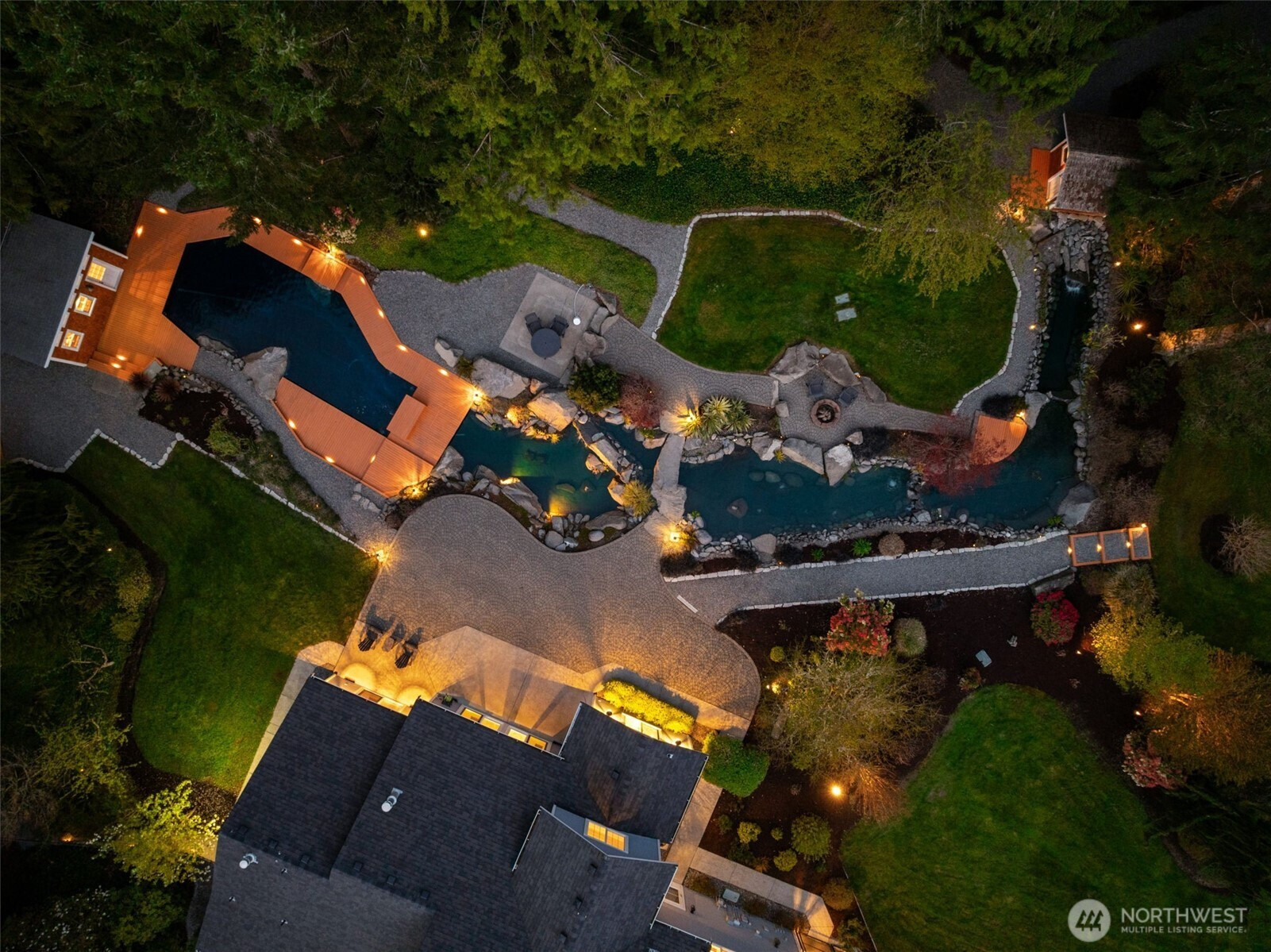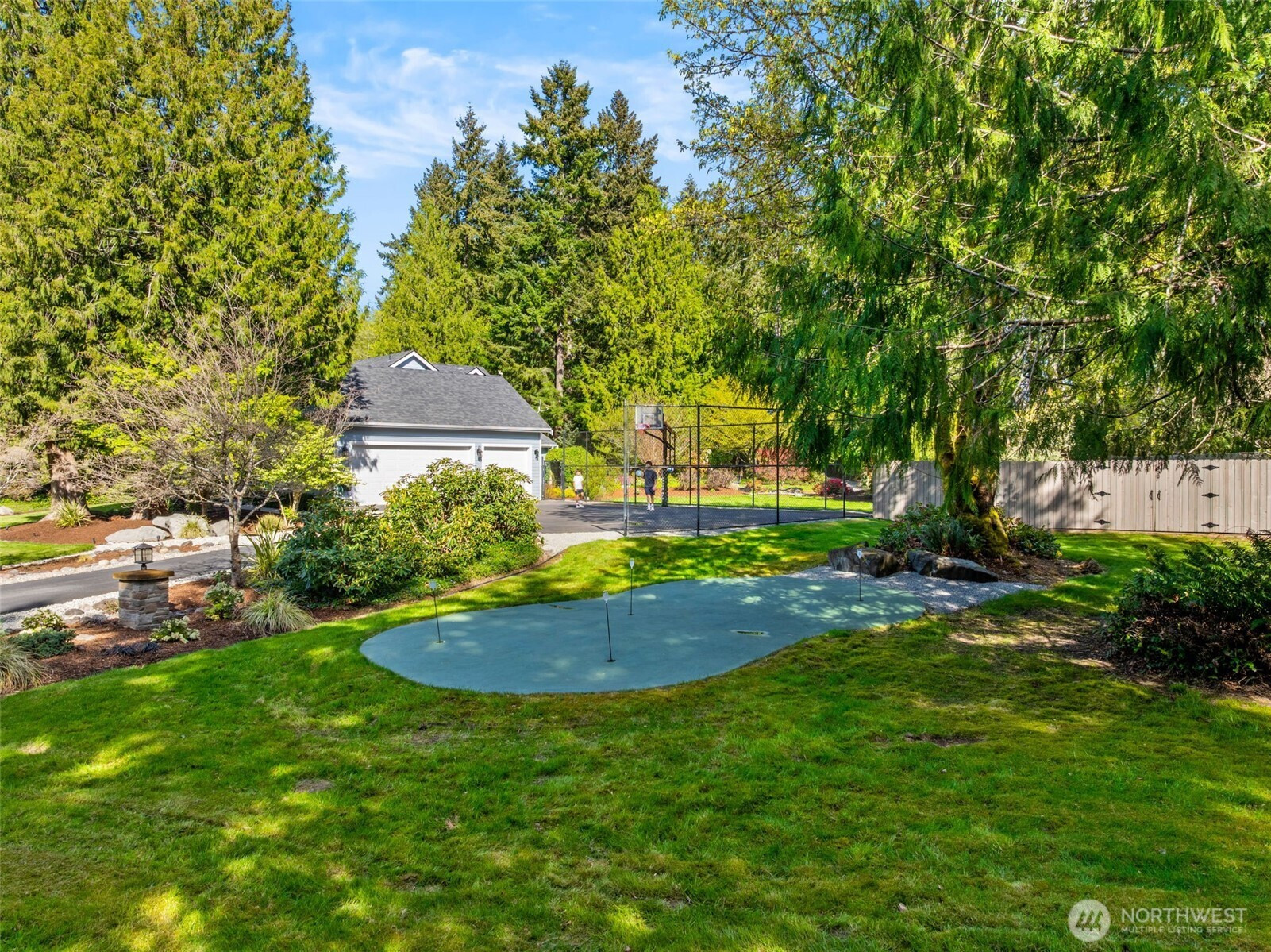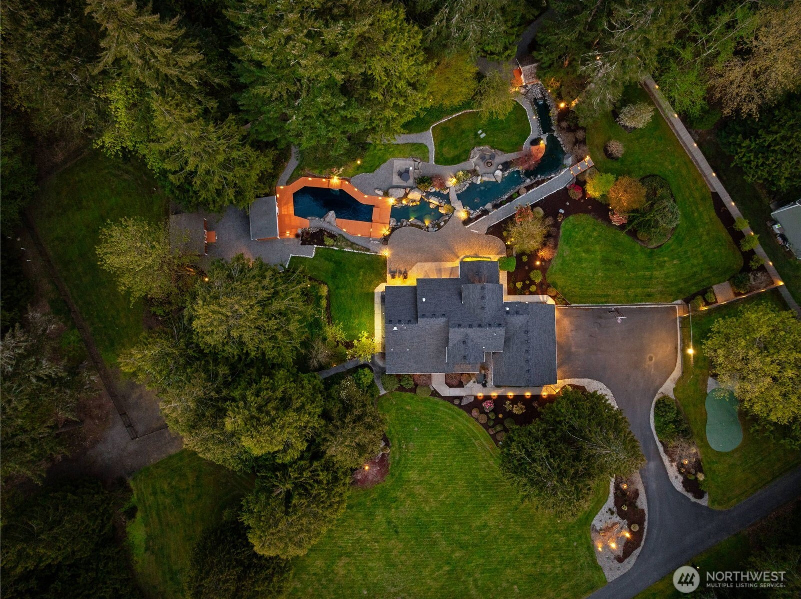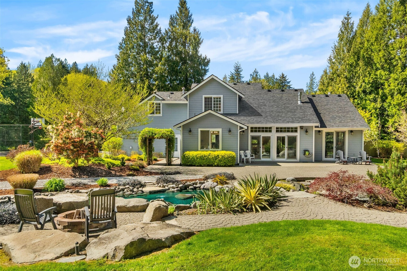 Welcome to Water Garden Escape on Cooper Point. Anchored in versatility w/a stunning 160± sf water feature inviting you to unwind w/the soothing sounds of a babbling brook while your private sports court & putt-putt add an element of playfulness & fun. Expansive windows invite the outdoors in, filling your home w/natural light & serene sights & sounds of the PNW. Quality craftsmanship, warm granite surfaces, rich hardwoods, tile, marble & beautifully appointed spacious kitchen & LR, multiple sliding glass doors spilling out to your own peaceful seclusion. Vaulted ceilings complemented by updated modern lighting & ceiling fans. Main-level primary ensuite is a true retreat, w/spa-inspired bath & double-sided FP. Upstairs, two addt'l bedrooms, full bath, bonus room w/wet bar provide ideal space for guests & entertainment. Stunning outdoor living space w/wraparound deck overlooking a pond that can easily be reintroduced to koi. Multiple entertaining spaces, including 100± sf back patio w/flowing garden ponds, trails, firepit & outdoor lighting. The property is surrounded by mature landscaping, featuring cedar, pine, apple trees, native plants & an abundance of wildlife. Gated access points, RV parking, outbuildings, sprinklers & thoughtful infrastructure (40 year roof) enhance both beauty & function. Insulated three-car garage w/workspace, utility sink, generator wiring, high-efficiency furnace w/AC. Located just minutes from the Puget Sound & the conveniences of West Olympia.