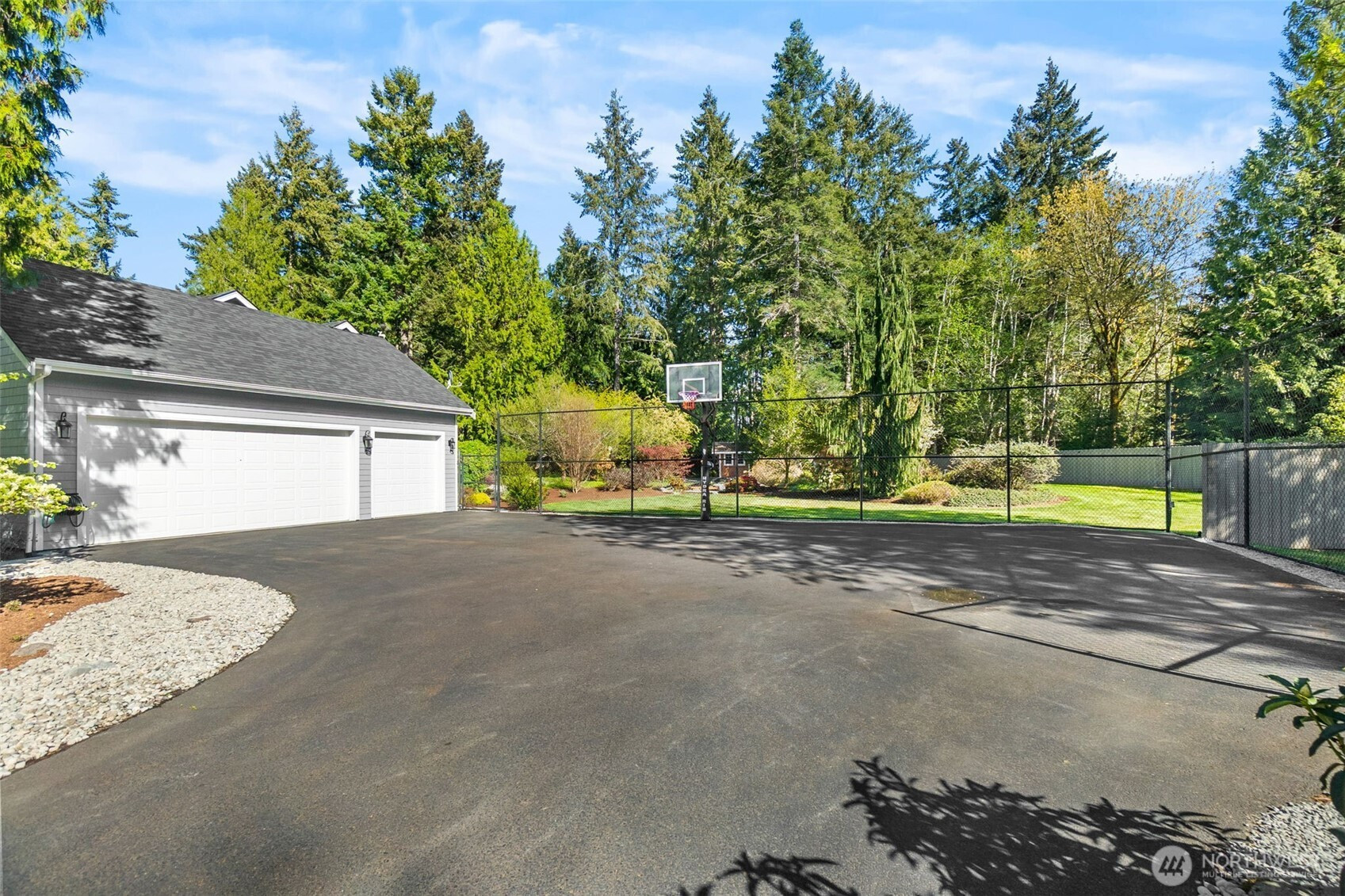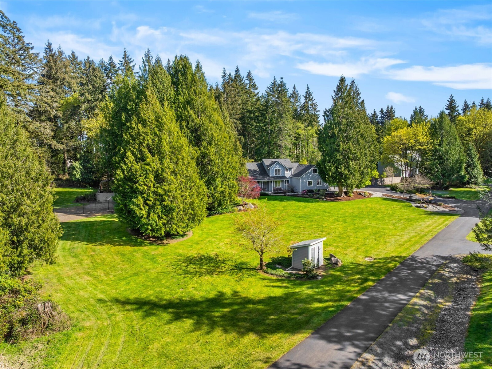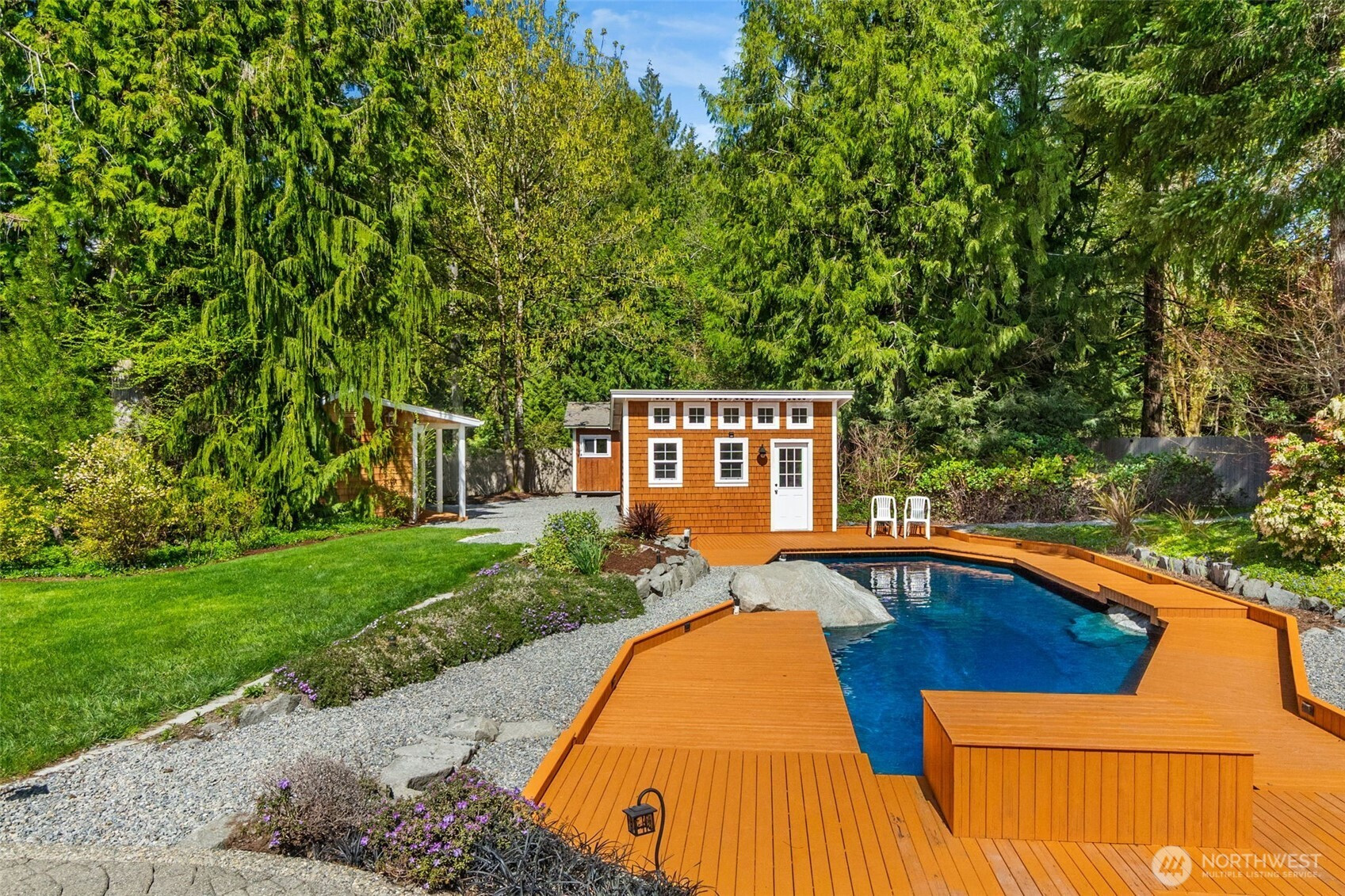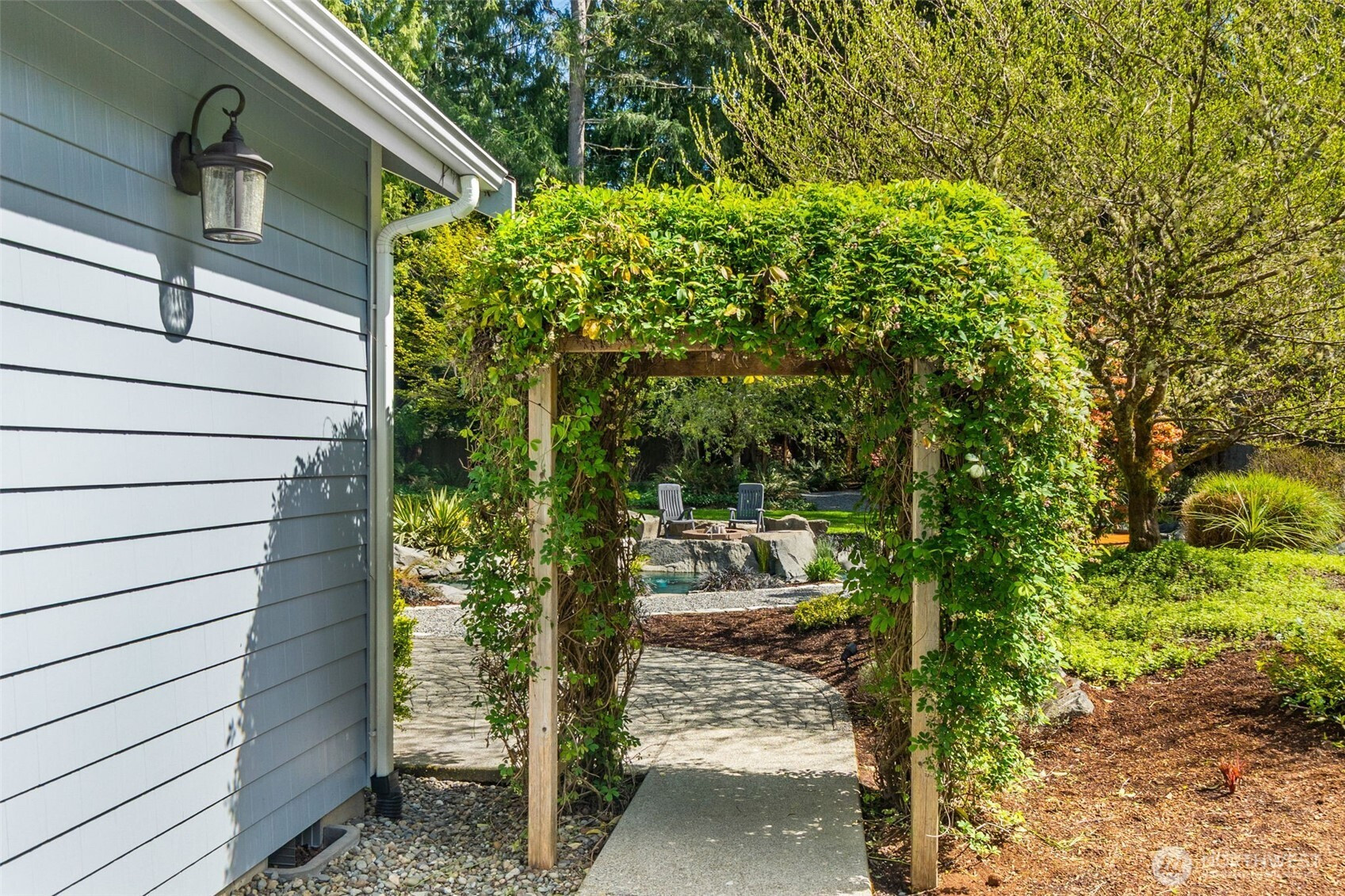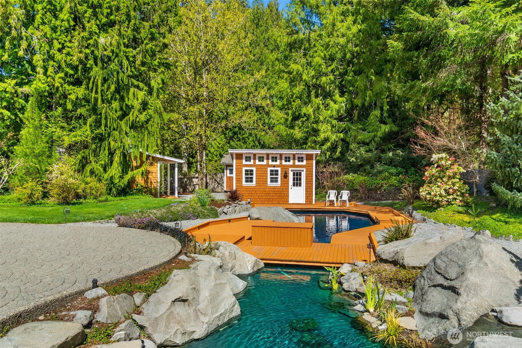 Welcome to Water Garden Escape on Cooper Point. Anchored in versatility w/a stunning 160± sf water feature inviting you to unwind w/the soothing sounds of a babbling brook while your private sports court & putt-putt add an element of playfulness & fun. Expansive windows invite the outdoors in, filling your home w/natural light & serene sights & sounds of the PNW. Quality craftsmanship, warm granite surfaces, rich hardwoods, tile, marble & beautifully appointed spacious kitchen & LR, multiple sliding glass doors spilling out to your own peaceful seclusion. Vaulted ceilings complemented by updated modern lighting & ceiling fans. Main-level primary ensuite is a true retreat, w/spa-inspired bath & double-sided FP. Upstairs, two addt'l bedrooms, full bath, bonus room w/wet bar provide ideal space for guests & entertainment. Stunning outdoor living space w/wraparound deck overlooking a pond that can easily be reintroduced to koi. Multiple entertaining spaces, including 100± sf back patio w/flowing garden ponds, trails, firepit & outdoor lighting. The property is surrounded by mature landscaping, featuring cedar, pine, apple trees, native plants & an abundance of wildlife. Gated access points, RV parking, outbuildings, sprinklers & thoughtful infrastructure (40 year roof) enhance both beauty & function. Insulated three-car garage w/workspace, utility sink, generator wiring, high-efficiency furnace w/AC. Located just minutes from the Puget Sound & the conveniences of West Olympia.