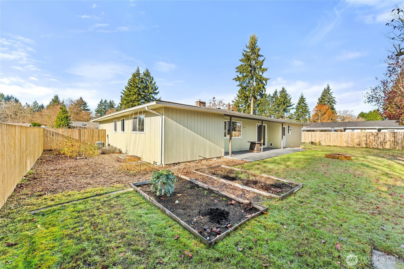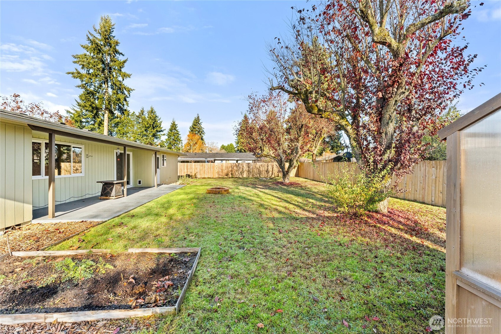 Charming, spotless, charged with mid-century magic, this beautifully maintained gem is move-in ready! This single-level, second-owner home offers 3 bedrooms and 1.5 baths, including a convenient half-bath off the primary suite. Gorgeous, original hardwood floors throughout!A roomy kitchen boasts abundant counter space and storage. The dining area opens through a slider onto a spacious patio and fully fenced backyard. Enjoy drive-thru access to the back yard - and a nice assortment of fruit trees and berry bushes, along with a new cedar greenhouse.The garage provides plenty of space for projects and all your gear. Roof replaced in 2018. Bonus: The City of Tumwater permits tiny homes in this area, providing room for flexibility and growth.