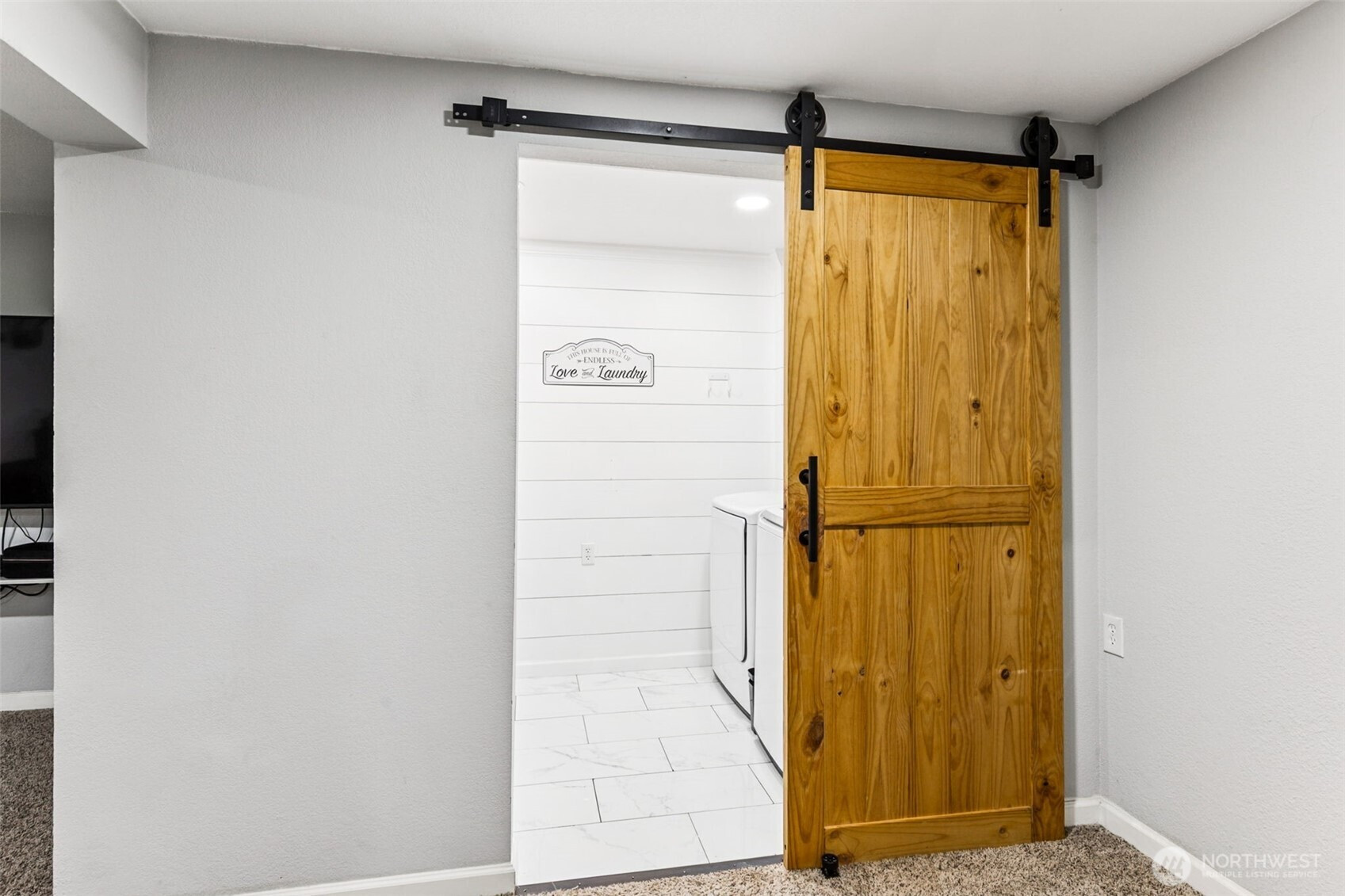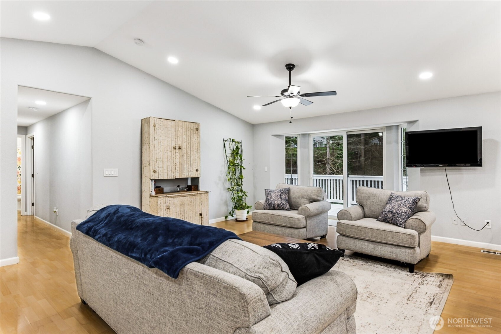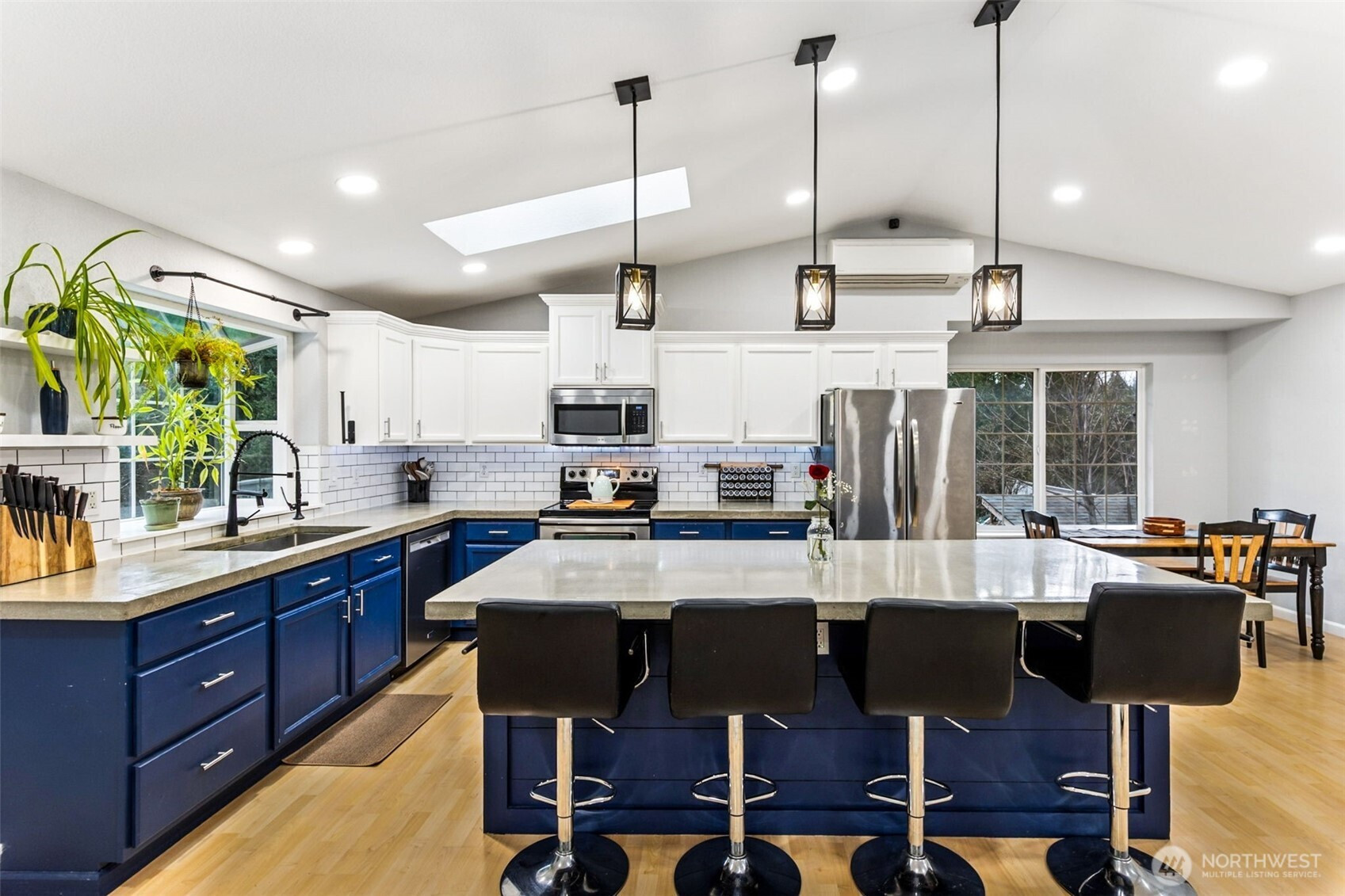 Beautifully updated 4-bedroom home on a private, oversized lot surrounded by mature evergreens. This light-filled residence features an open-concept main living area with vaulted ceilings, recessed lighting, and seamless flow between the living room, dining area, and stunning kitchen. The kitchen is a true centerpiece, offering a large statement island with seating, rich blue cabinetry, white uppers, stainless steel appliances, subway tile backsplash, skylight, and abundant counter space — perfect for entertaining and everyday living. Sliding doors open to an expansive deck overlooking the peaceful backyard, creating ideal indoor-outdoor living. The upper level includes multiple bedrooms, including a spacious primary suite with deck access and nearby bath. Downstairs, the fully finished lower level provides a generous bonus/family room with cozy wood stove, built-ins, and additional flexible space for media, hobbies, or guests, as well as, a spacious secondary primary bedroom and bathroom including a luxurious soaking tub. A dedicated laundry room with stylish finishes adds convenience. Outside, enjoy a large yard with room to garden, play, or relax in a serene natural setting. Attached garage and ample driveway parking complete the package. Walking distance to the park/playground. A perfect blend of modern updates, functional layout, and privacy — this home offers comfort, space, and versatility in a beautiful setting.