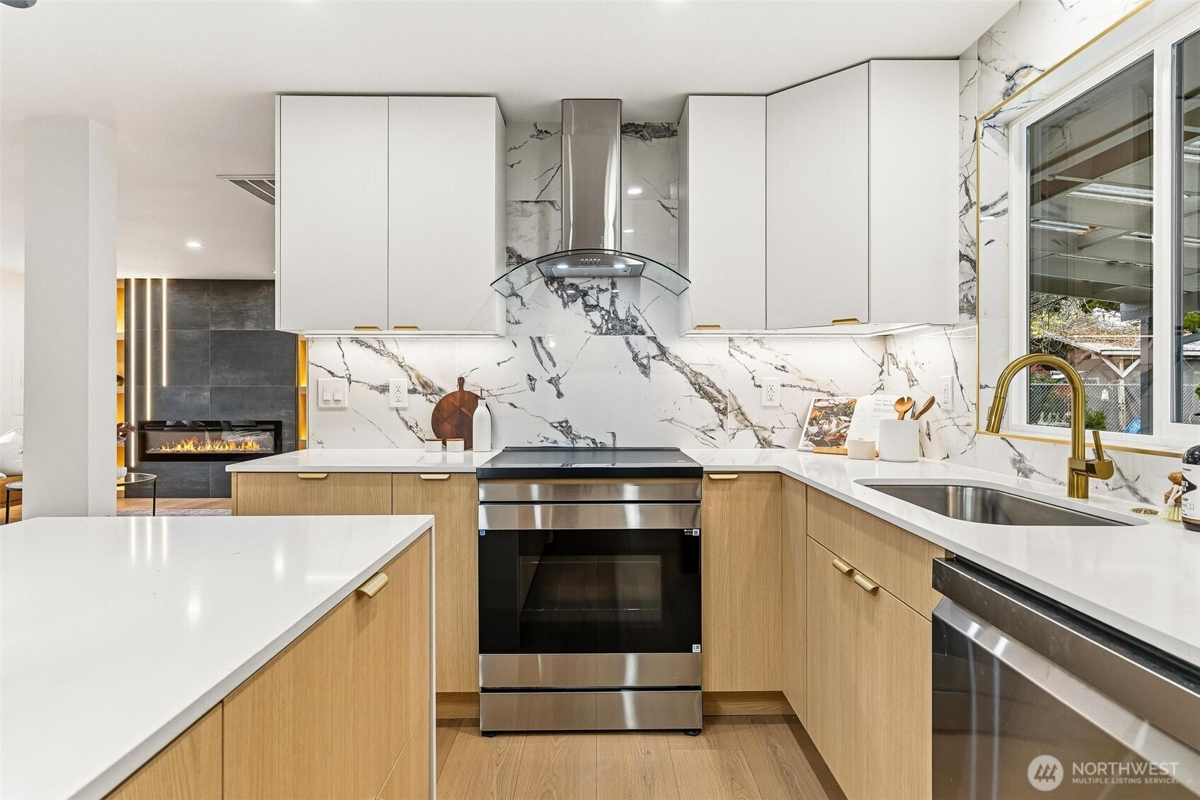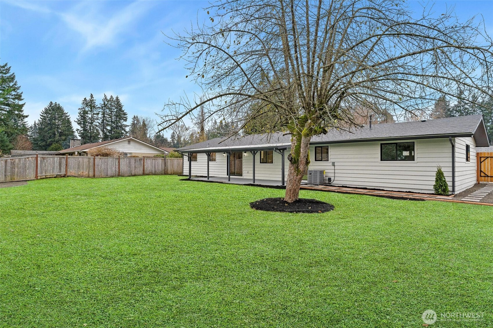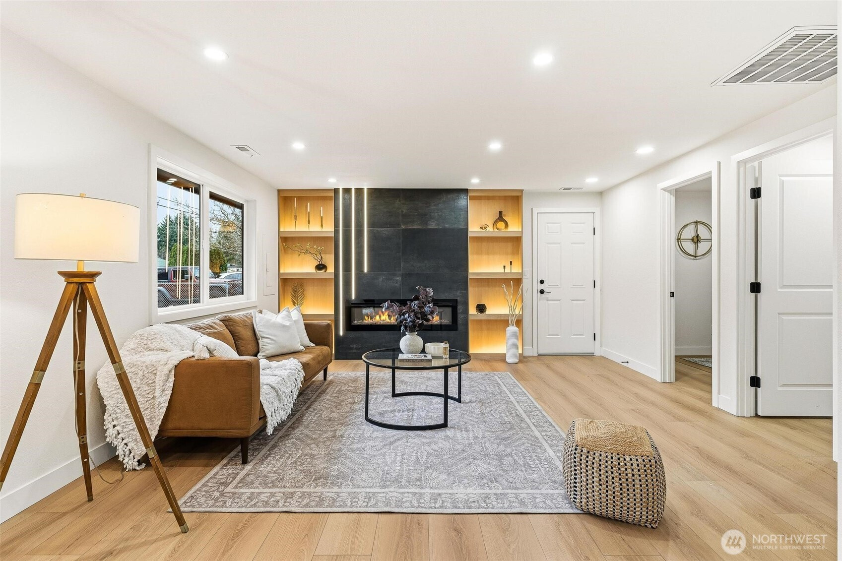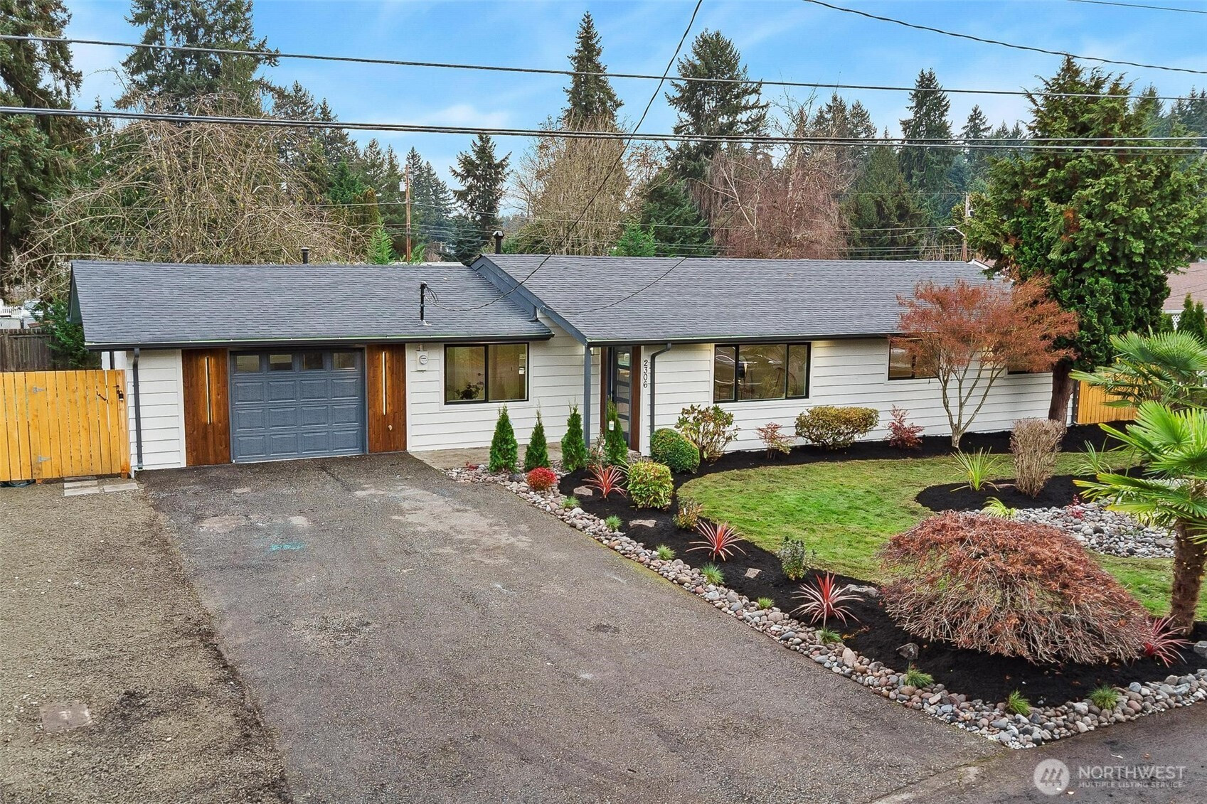 Experience effortless one-level living in this fully modernized three-bedroom rambler where the seller has thoughtfully updated every detail. Clean lines and elegant finishes elevate each room, anchored by a sleek, striking electric fireplace that sets a contemporary tone. The open-concept layout flows into a stunning modern kitchen with gleaming quartz countertops and brand-new stainless steel appliances. Retreat to the grand primary suite featuring a spa-inspired ensuite for ultimate relaxation. A spacious backyard offers room to unwind or entertain. Ideally located near Wanschers Park, Hicks Lake, and the South Sound Shopping Center, this home blends modern style with unbeatable convenience.