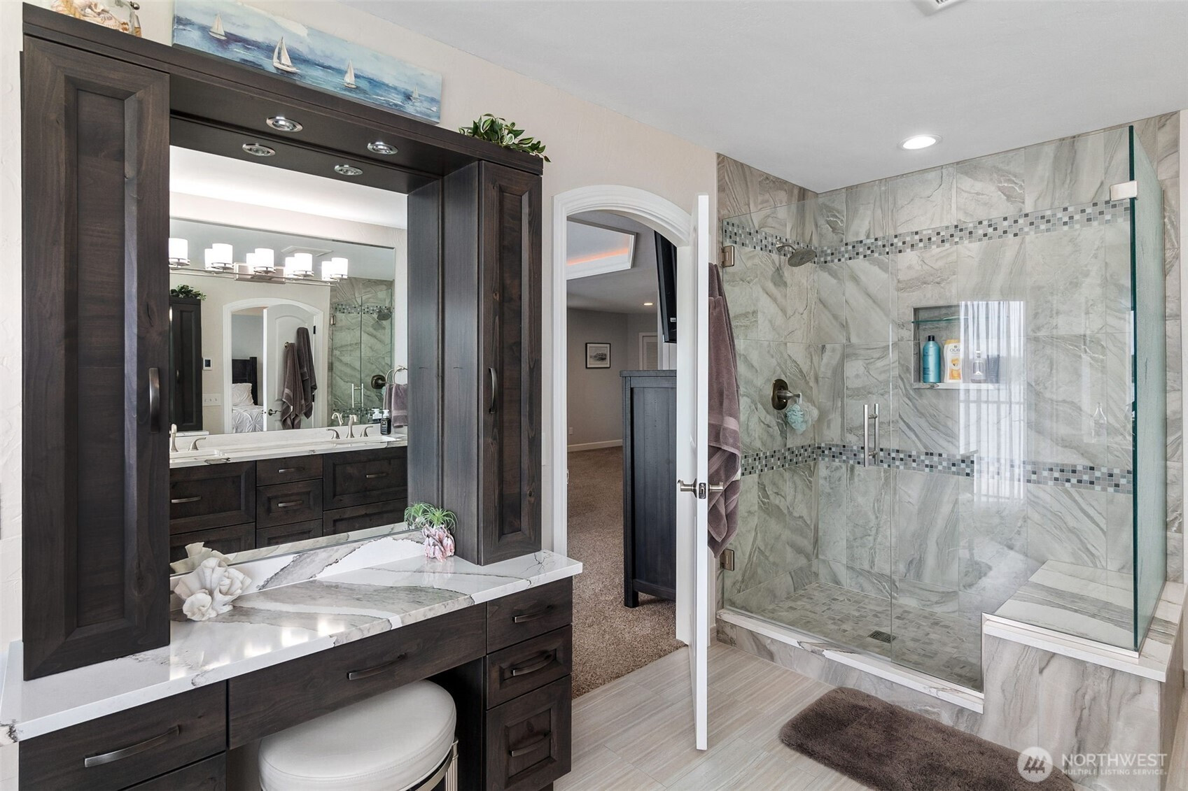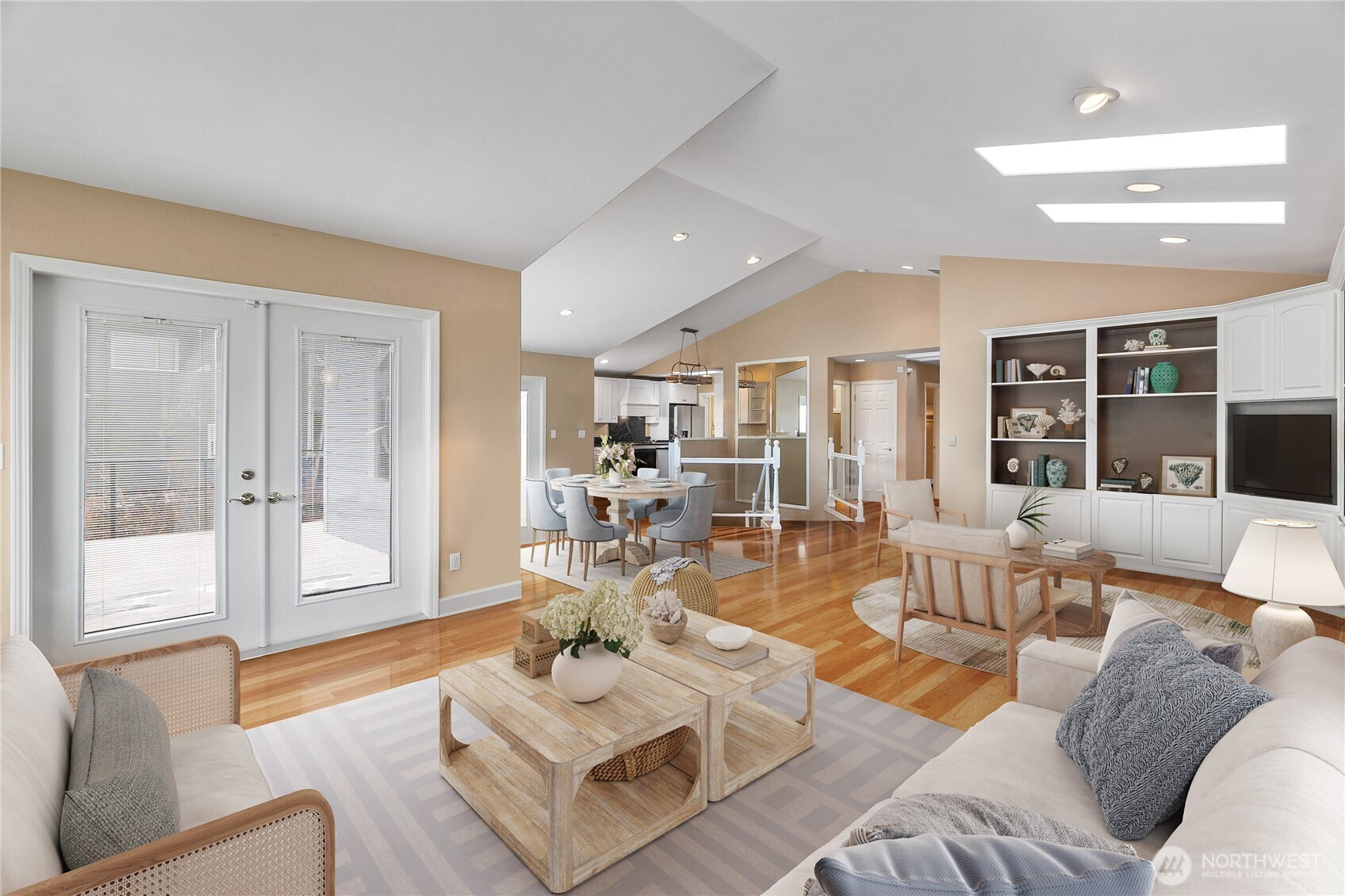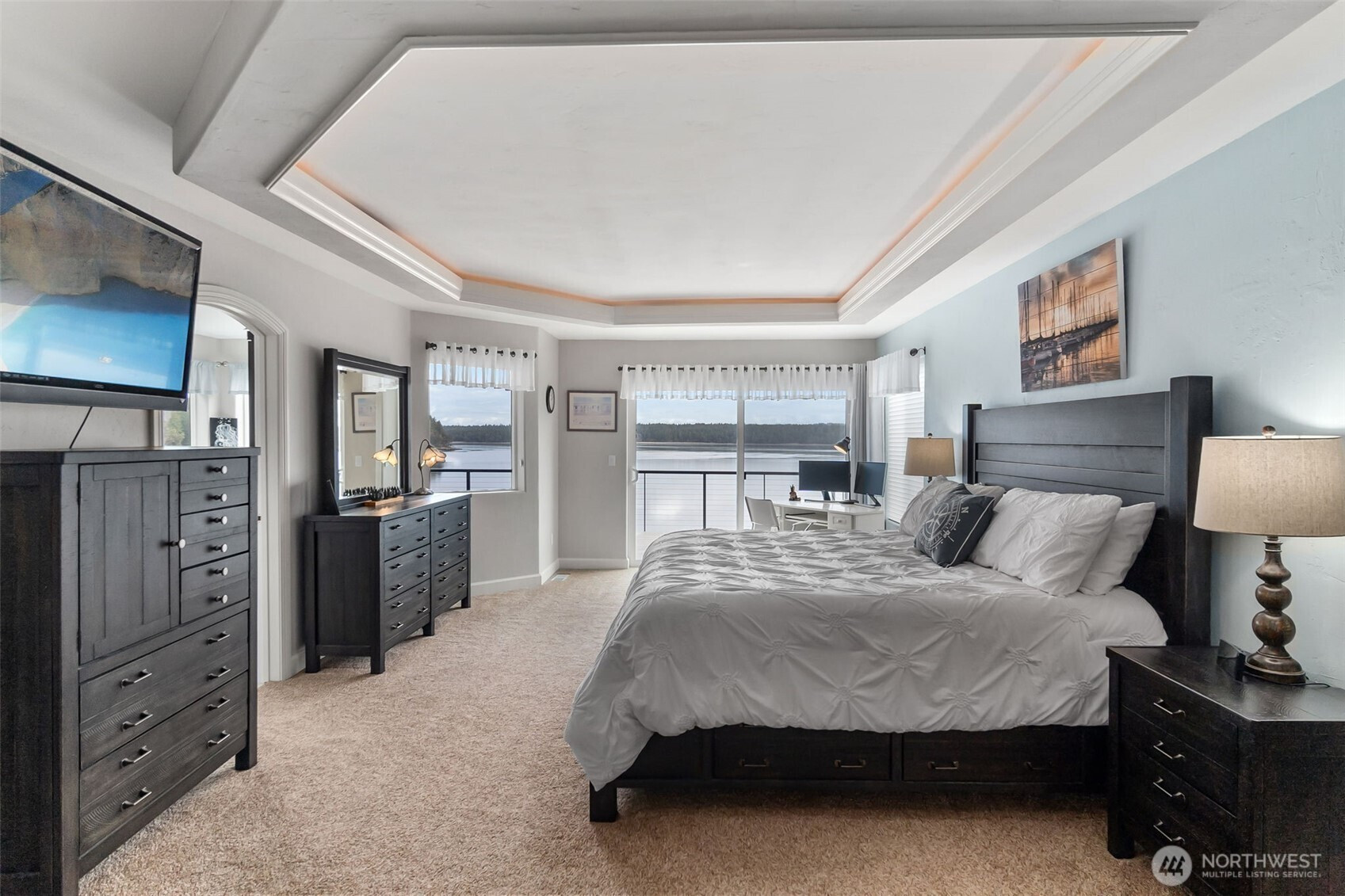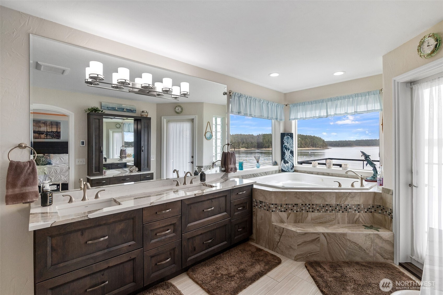 Wake up to breathtaking sunrises over Mt. Rainier and Squaxin Passage in this impeccably maintained custom waterfront home. The views are truly unparalleled, spanning from the Olympic Mountains to the serene beauty of Hope and Squaxin Islands. Enjoy the ultimate coastal lifestyle with your bulkheaded waterfront and rare sandy beach, perfect for shoreline relaxation. The grounds are a private oasis, featuring fully fenced and irrigated landscaping, a gorgeous water feature, and a spacious view deck designed for entertaining against a world-class backdrop. Inside, the open-concept floor plan shines with vaulted ceilings, skylights, and rich cherry hardwood floors. The updated chef’s kitchen is a standout, boasting elegant soapstone counters, a gas cooktop, and an eating bar. The expansive downstairs primary suite serves as a luxury retreat, featuring a private sliding glass door to the deck with stunning views of the inlet and islands. The spa-like primary bath includes a walk-in shower, dual quartz vanity, and a jetted tub positioned perfectly to capture those waterfront vistas. Year-round comfort is ensured with a high-efficiency propane furnace and heat pump system. Perfect for entertaining, the property has room for parking 7 vehicles. This home also enjoys fantastic community amenities: a private marina, boat launch, clubhouse, and playground. Combining meticulous care with an unbeatable location, this residence offers a waterfront lifestyle that simply cannot be beat.