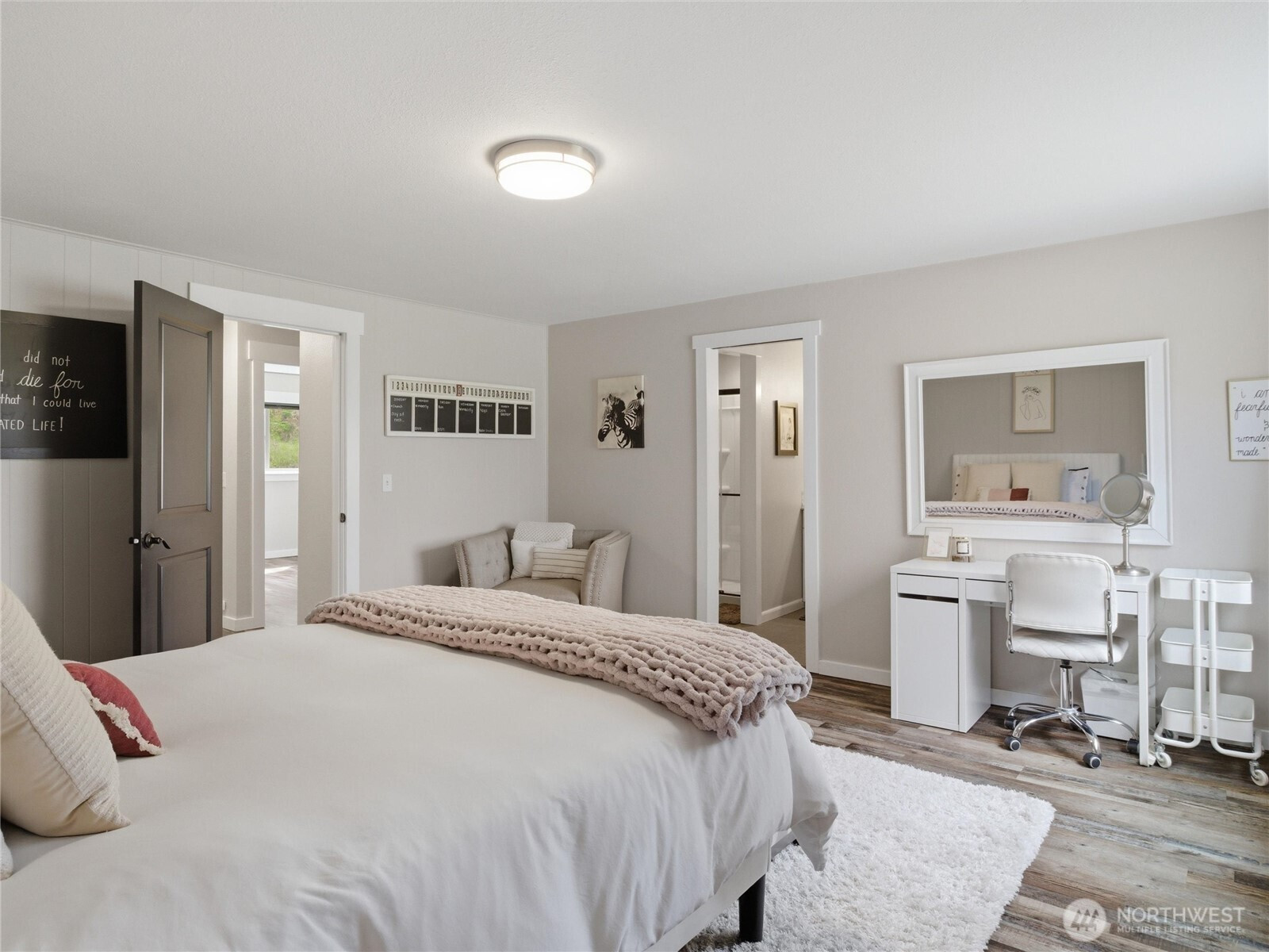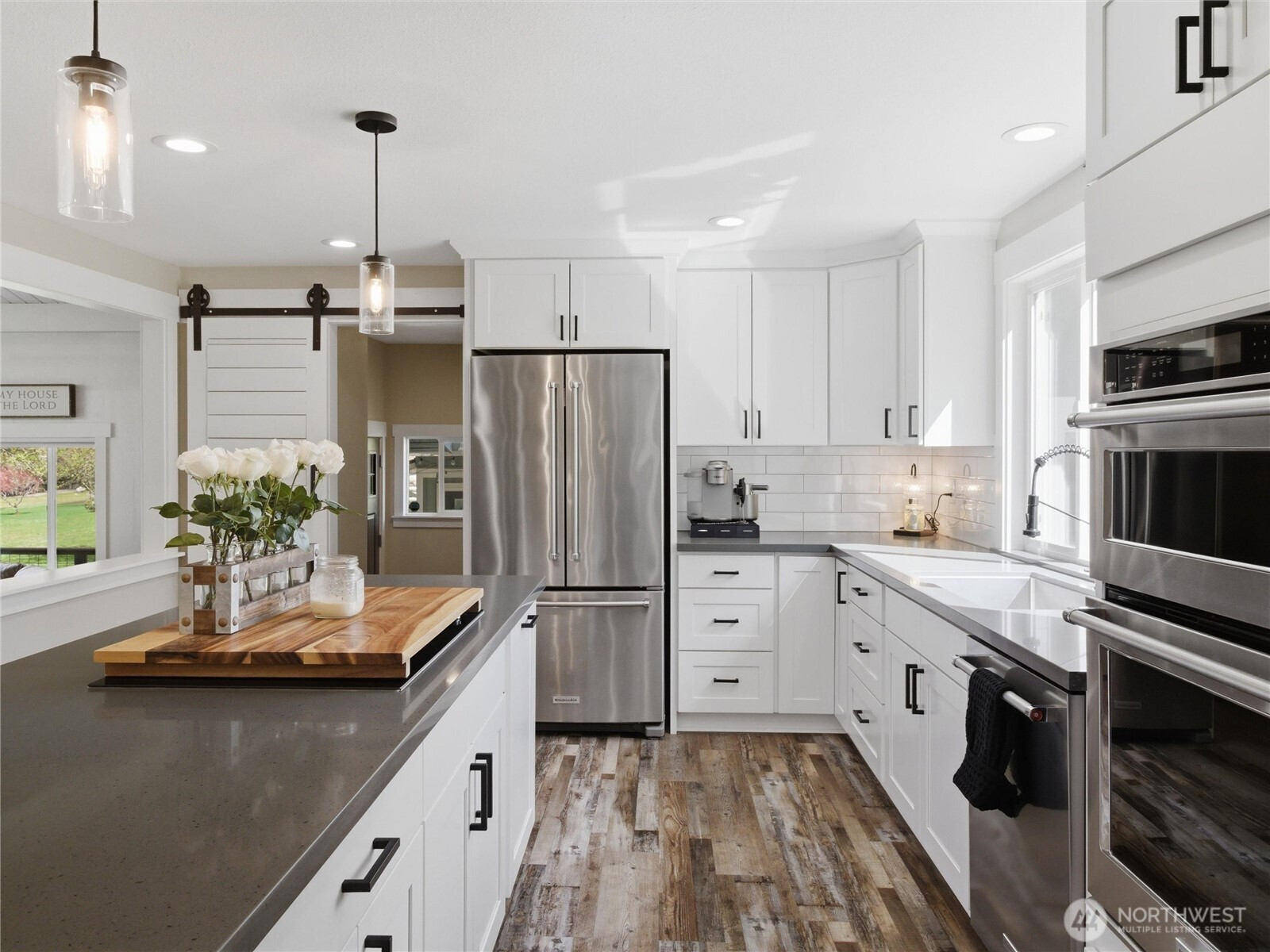 Escape to your own private modern farmhouse where luxury meets tranquility on five secluded acres. This stunning 3,448 sq ft home has been completely updated with beautiful finishes throughout. The new kitchen offers an expansive island with space for 8, stainless appliance package, views from each direction with nearby walk-pantry adjacent to mudroom. Offering 3 spacious bedrooms, 4 baths, and the flexibility of a 4th bedroom or multigenerational suite with kitchenette, bathroom, and private exterior entrance. Designed for both comfort and connection, the living/dining room is filled with natural light from expansive windows that perfectly frame serene views of the pasture leading to the stream. Step outside to an oversized covered patio featuring an outdoor kitchen ideal for entertaining, complete with a cozy fire pit and hot tub for unforgettable evenings under the stars. Wander along the peaceful creek and enjoy the soothing sounds of nature just steps from your door. Car enthusiasts and hobbyists alike will appreciate the impressive 3-bay garage featuring a steel storage organizer, plus a massive 40x50 shop/barn—perfect for entertaining, projects, or creating your dream workspace. Additional covered parking stalls and fenced dog run. With endless possibilities and unmatched privacy, this property offers a rare opportunity to live, relax, and entertain in your own secluded retreat.