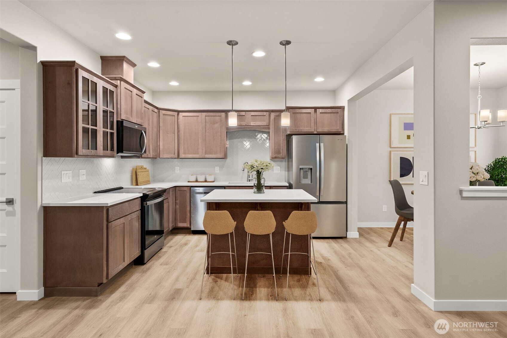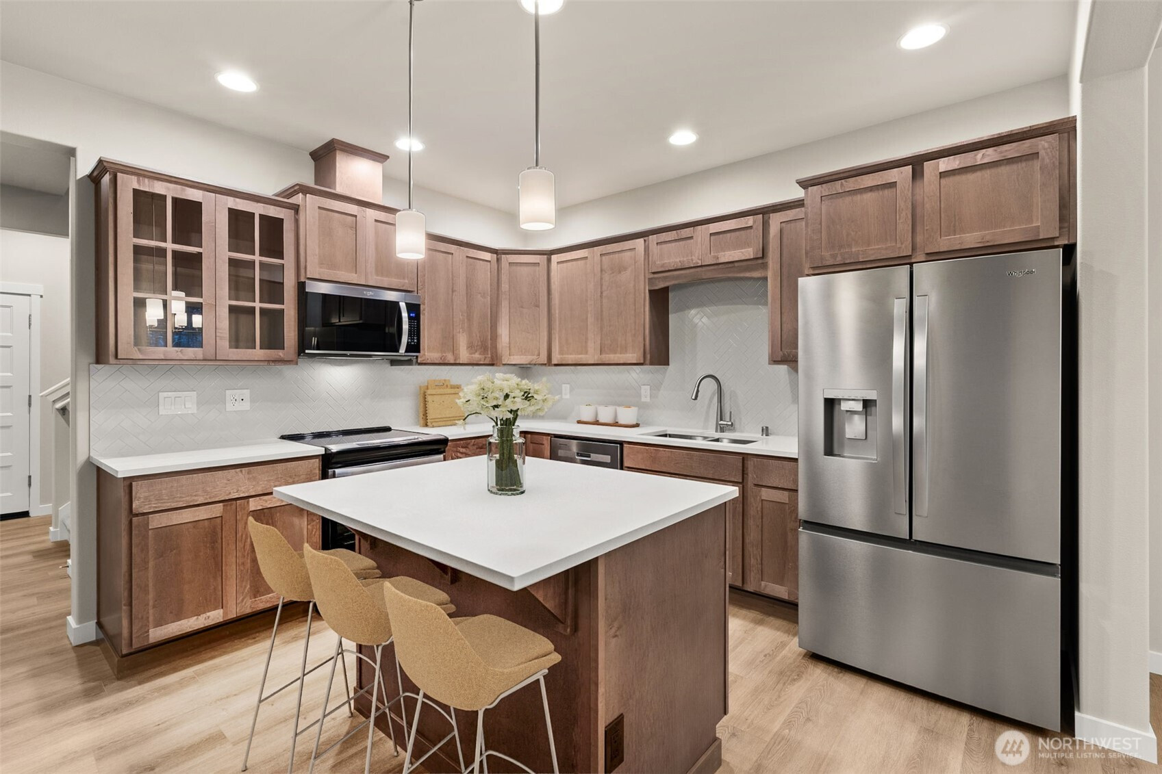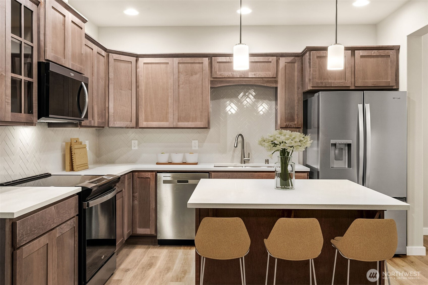 (503) 893-8874Celebrate the Season with Move-In Ready Comfort! Washer, dryer, refrigerator & blinds now included on all completed homes! Rob Rice Homes Elm Plan offers the ideal easy living experience! The kitchen boasts elegant 'Shadow' Maple cabinets, quartz counters, full tile backsplash & stainless steel appliances-induction range/oven. Seamlessly connects to living room w/built in cabinetry & vinyl plank throughout the main floor. Upstairs, you'll find a loft and all the bedrooms, including a primary suite featuring a walk-in closet and a 5 pc bath with a soaking tub surrounded by tile. Quartz counter tops throughout. Oversized 2-car garage, partially covered side patio, and front yard irrigated & maintained by the HOA. Some photos virtually staged.