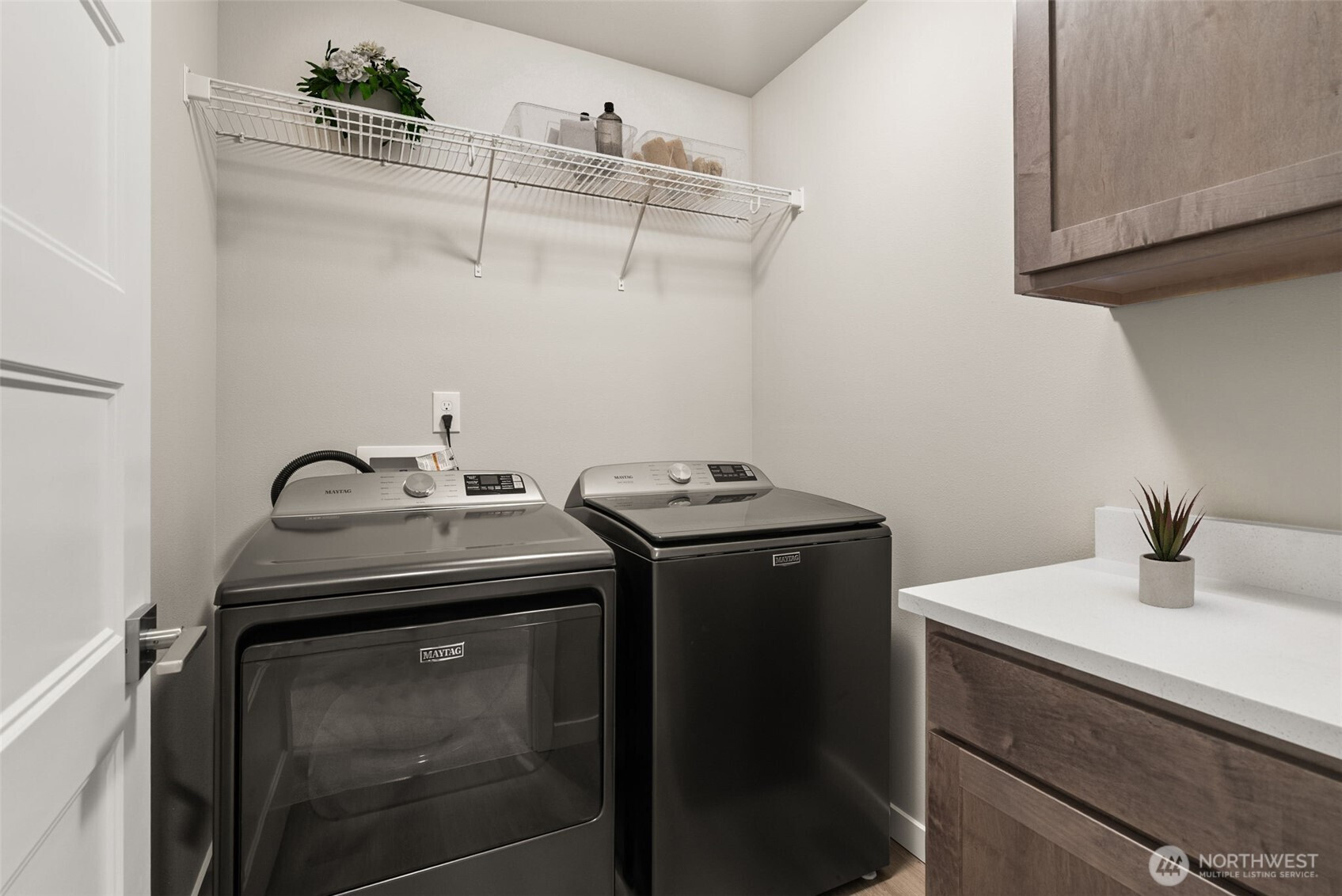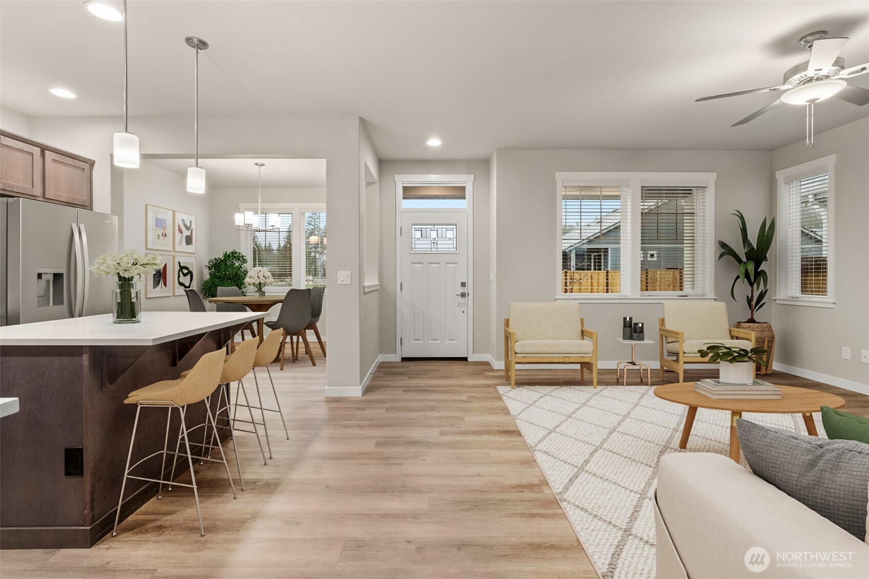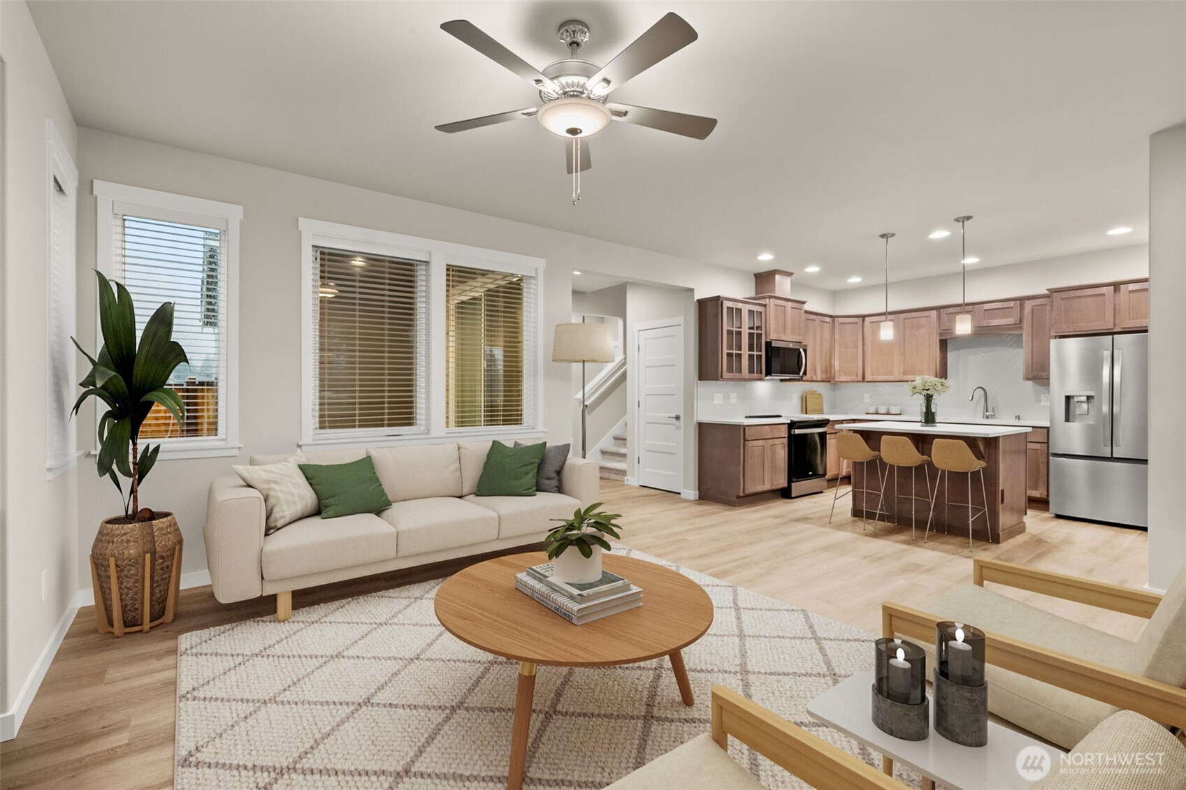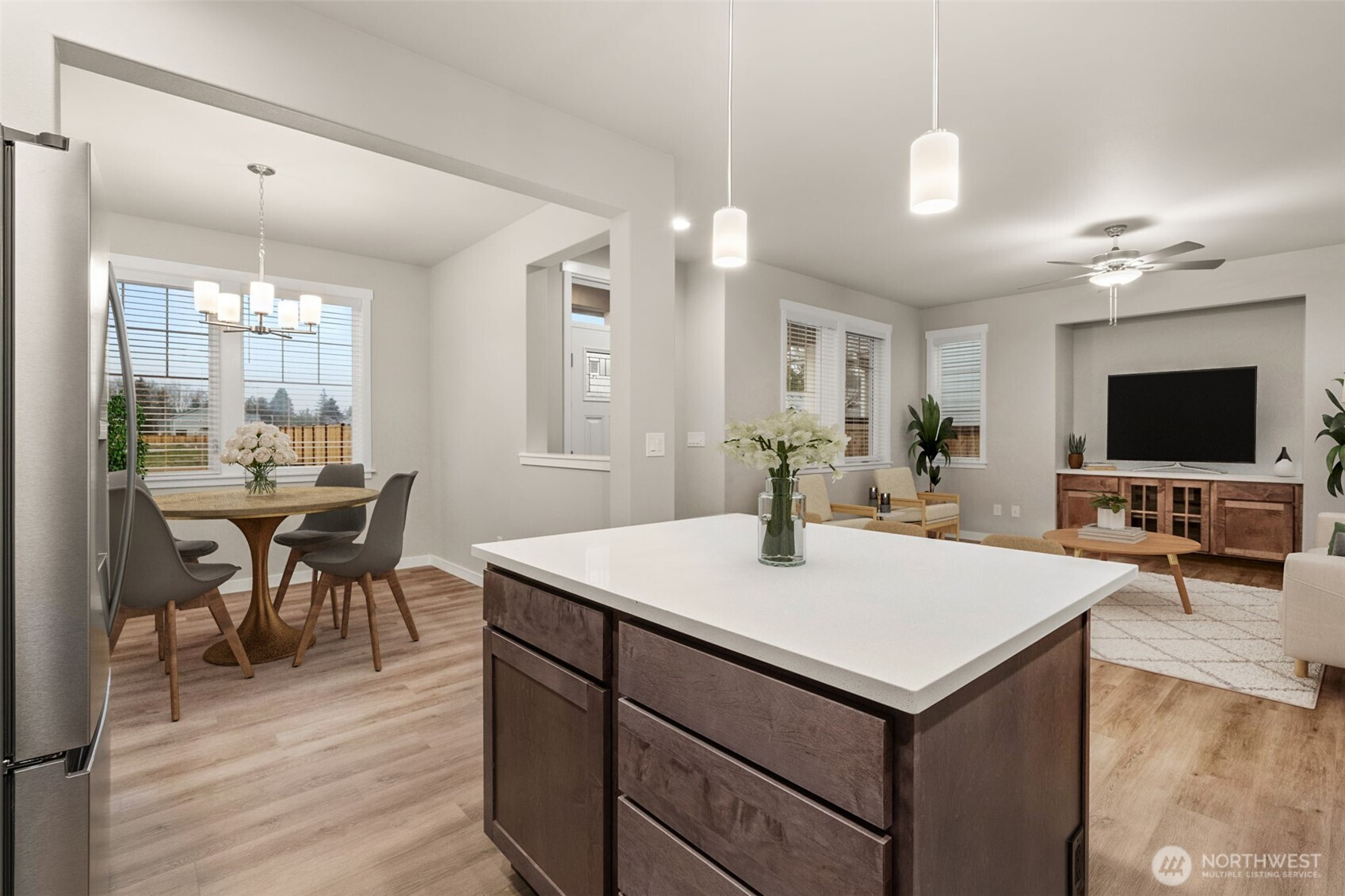 (503) 893-8874Celebrate the Season with Move-In Ready Comfort! Washer, dryer, refrigerator & blinds now included on all completed homes! Rob Rice Homes Elm Plan offers the ideal easy living experience! The kitchen boasts elegant 'Shadow' Maple cabinets, quartz counters, full tile backsplash & stainless steel appliances-induction range/oven. Seamlessly connects to living room w/built in cabinetry & vinyl plank throughout the main floor. Upstairs, you'll find a loft and all the bedrooms, including a primary suite featuring a walk-in closet and a 5 pc bath with a soaking tub surrounded by tile. Quartz counter tops throughout. Oversized 2-car garage, partially covered side patio, and front yard irrigated & maintained by the HOA. Some photos virtually staged.