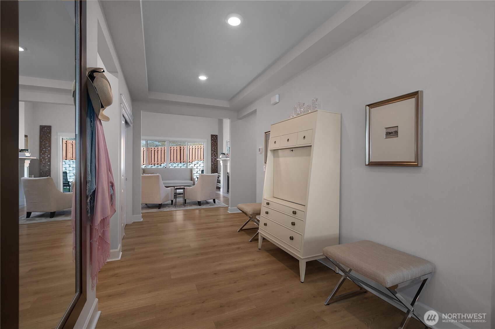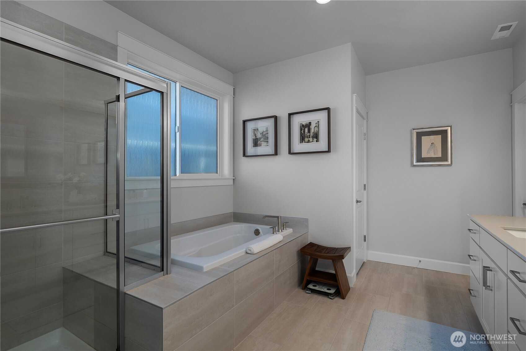 What's Special: South Facing 7,500+Sqft Lot | North Facing Patio | Like-New | Kitchen Never Used Welcome to the Walnut at Ovation at Oak - a sought-after Taylor Morrison plan! This stunning ~2,200 sqft ranch has lots of natural light. Upgraded LVP flooring throughout. Open-concept living includes a kitchen w/an oversized island, quartz counters, & a gas fireplace w/ upgraded trim. A four-panel sliding glass door opens to a covered patio w/ gas & electric. The primary suite features a 5-piece bath w/a stand-up shower, a soaking tub, & dual vanities. Two additional bedrooms, a full bath, and a 2-car garage. Custom window treatments & smart home features. Move-in ready. 55+ living with all the amenities.