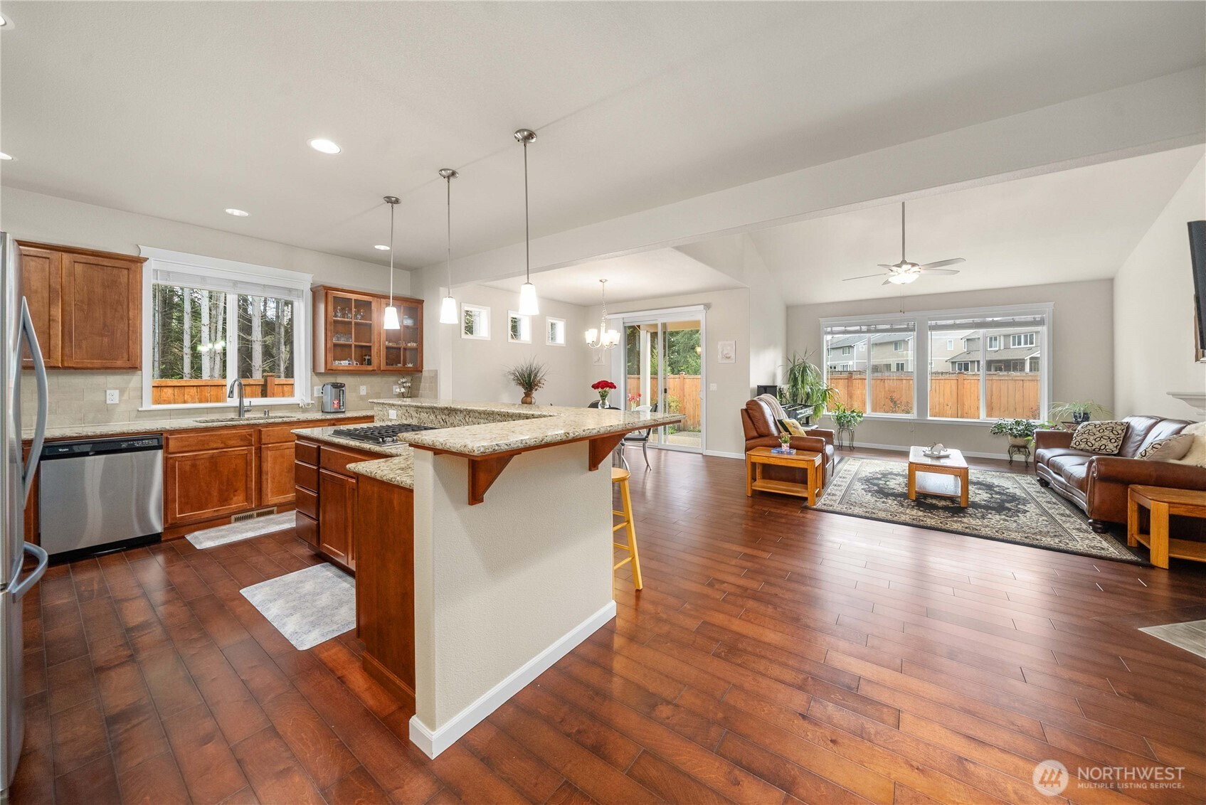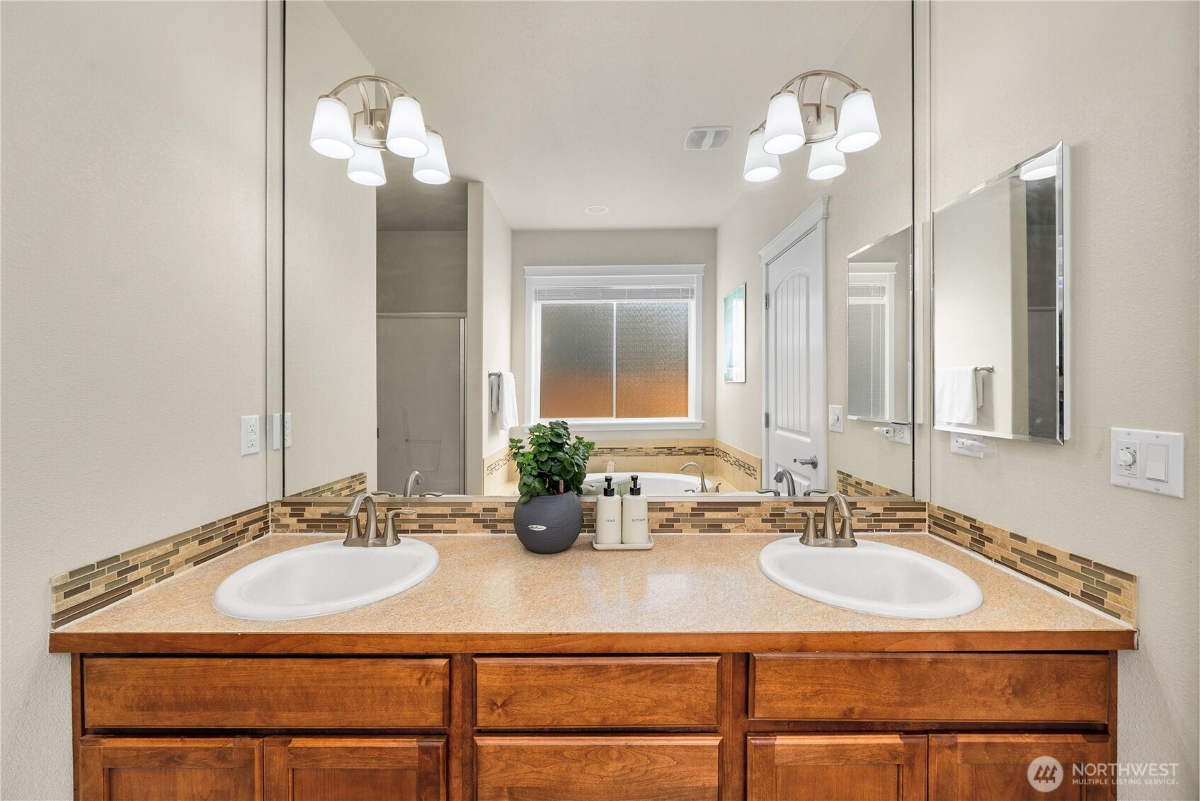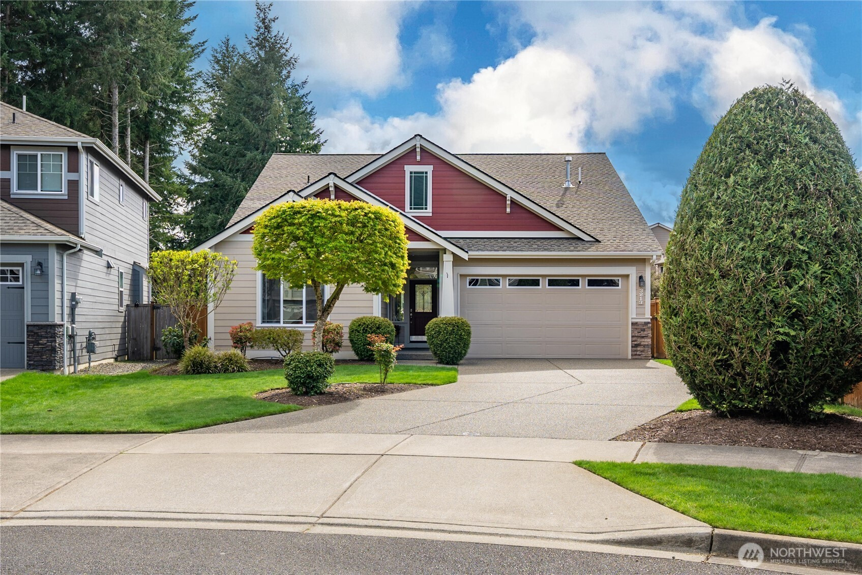 Tucked away on a quiet cul-de-sac that backs to a private greenbelt, this spacious home offers sought-after main-level living, a versatile floor plan, and an entertainer’s kitchen designed to bring people together. The MAIN LEVEL PRIMARY SUITE provides a private retreat, complete with a dual vanity, walk-in shower, separate soaking tub, and a generous WI closet. A 2nd bedroom on the main is conveniently located next to a full bathroom—ideal for guests, multi-generational living, or office. The heart of the home features a beautifully designed kitchen w/slab granite countertops, SS appliances, oak cabinetry and a gas stovetop built into the large center island with seating for 6—creating a natural gathering space for cooking, dining, and entertaining. Enjoy hosting in the formal dining room or casual mornings in the breakfast nook w/direct access to the covered back patio—perfect for BBQs and year-round outdoor living. Spacious kitchen flows seamlessly into the great room w/a cozy gas FP, while white painted millwork & rich engineered hardwood flooring add warmth & character throughout the main living spaces. Upstairs, the 3rd & 4th bedrooms & full bath provide flexible living space. Step outside to enjoy the fully fenced yard, complete with sprinkler system, raised beds & a covered patio designed for year-round PNW living. Ideally located within the sought-after Olympia School District & min to shopping, dining, parks, golf, JBLM and easy I-5 access!
