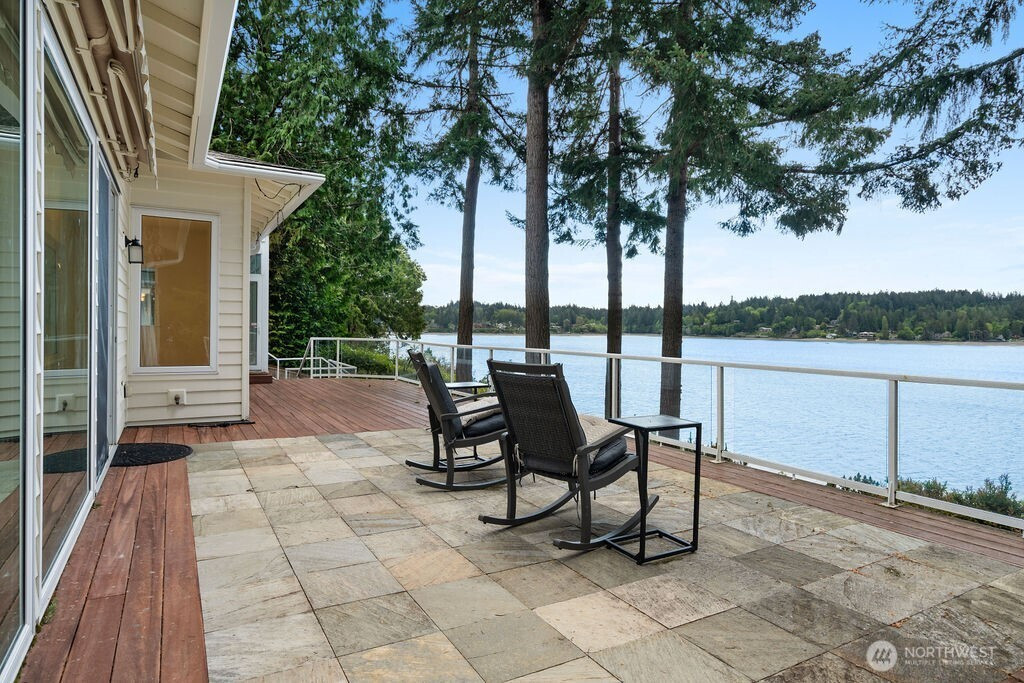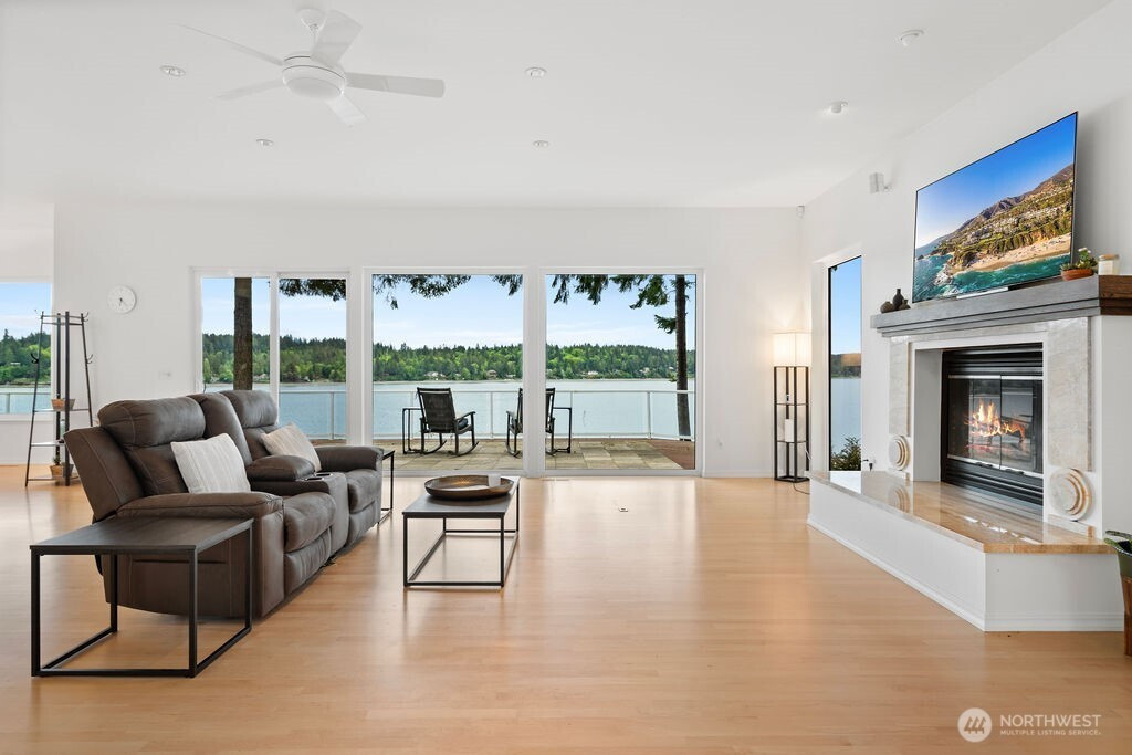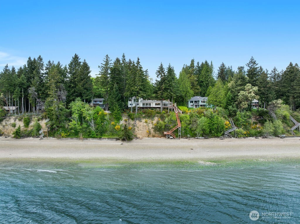 Perched on 119 feet of coveted Eld Inlet waterfront, this architecturally designed home captures breathtaking views from nearly every room. Enjoy easy beach access and a private buoy for effortless days on the water. Thoughtfully designed, the home features 3 bedrooms, a versatile bonus room with a built-in Murphy bed, a bright sunroom, and a spacious 3-car garage. Recent improvements include a newer roof, updated windows, a new septic system, and a fully fenced, gated driveway. Inside, refined finishes shine with marble and hardwood flooring, custom cabinetry, granite surfaces, built-in closet systems, three fireplaces, and A/C for year-round comfort. Outdoor living is just as impressive with expansive Trex decks, sleek glass railings, a retractable awning, and fully fenced grounds—perfect for relaxing or entertaining while taking in the water views. Wake up to serene Puget Sound views from your bed or step onto your private balcony and start the day surrounded by the beauty of waterfront living at its finest.