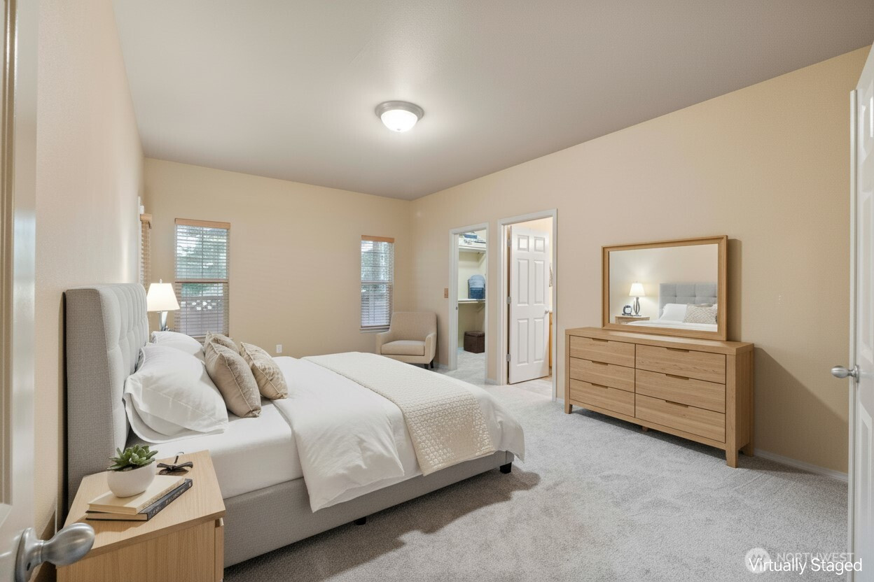 Discover this beautifully refreshed ONE OWNER 3-bedroom residence in SE Olympia’s desirable Hamptons community. Designed for effortless living, the main floor features vaulted ceilings & an abundance of windows that flood the home w/natural light, highlighting the brand-new carpet & cozy fireplace. The open-concept layout flows seamlessly into the heart of the home. You'll love cooking in the well-appointed kitchen, which features ample prep space & a convenient breakfast bar perfect for casual morning coffee. The MAIN FLOOR primary suite is an extra-large retreat w/plenty of room for a king-sized set & add'l furniture, complete w/walk-in closet & a private bath featuring dual sinks & updated custom walk-in shower. Access your private patio from your room, too! Convenience is key w/a main-floor laundry room & 1/2 bath. Upstairs, you'll find 2 oversized bedrooms & a guest bath w/plenty of counter space, providing ample space for everyone. Outside, enjoy a private patio & an alley-load garage that preserves the home’s charming curb appeal. Hate yard work? No problem- the HOA takes care of landscaping. All appliances stay! New roof in 2020 & New Kitchen Cabinets in 2023. Upcoming Jolene Unsoeld Park is planned, just around the corner! This home is conveniently located near shopping, restaurants, Amtrak station, farm stands, Indian Summer Golf Course, top-rated Olympia schools, freeways & JBLM. This bright, turn-key home offers the perfect blend of style & location. Welcome Home!