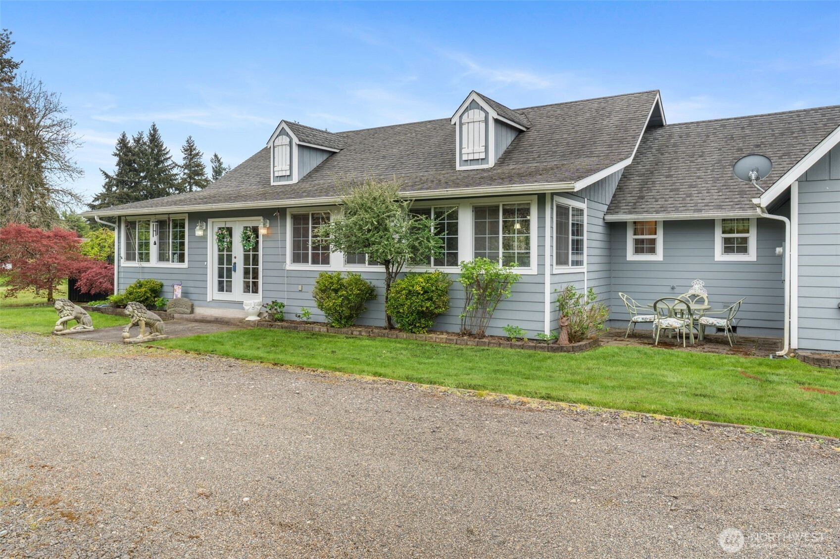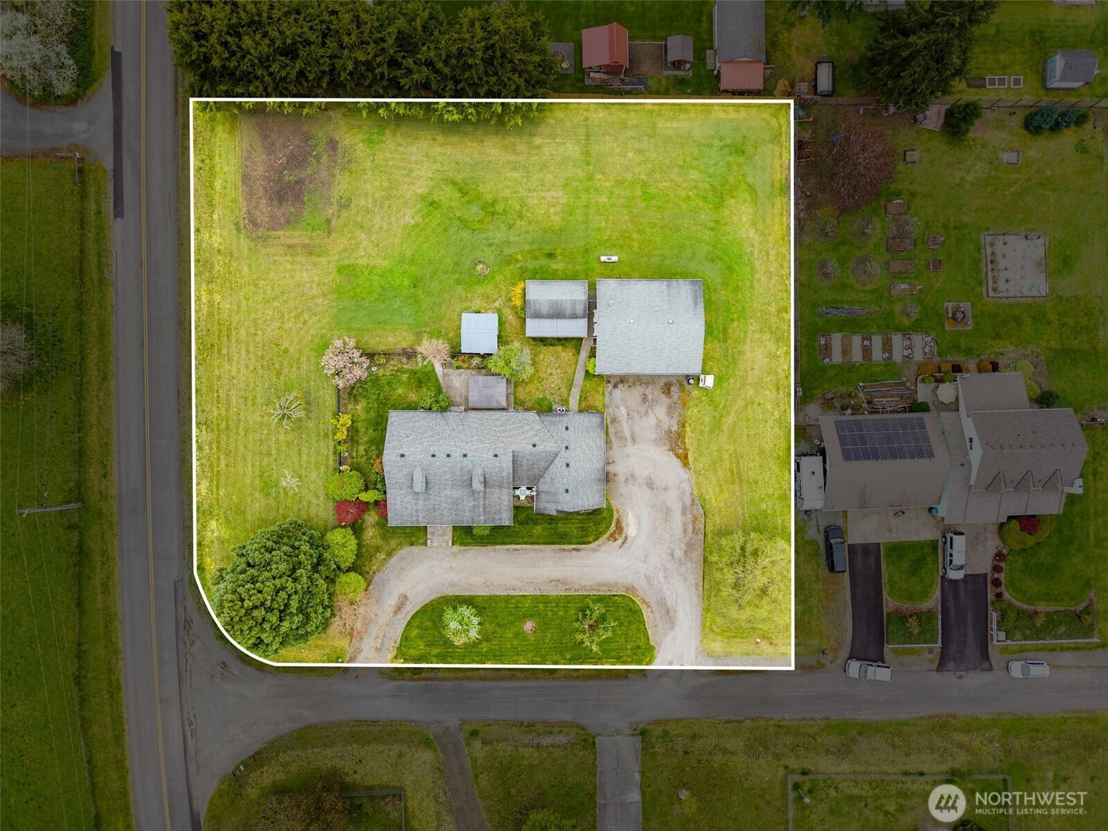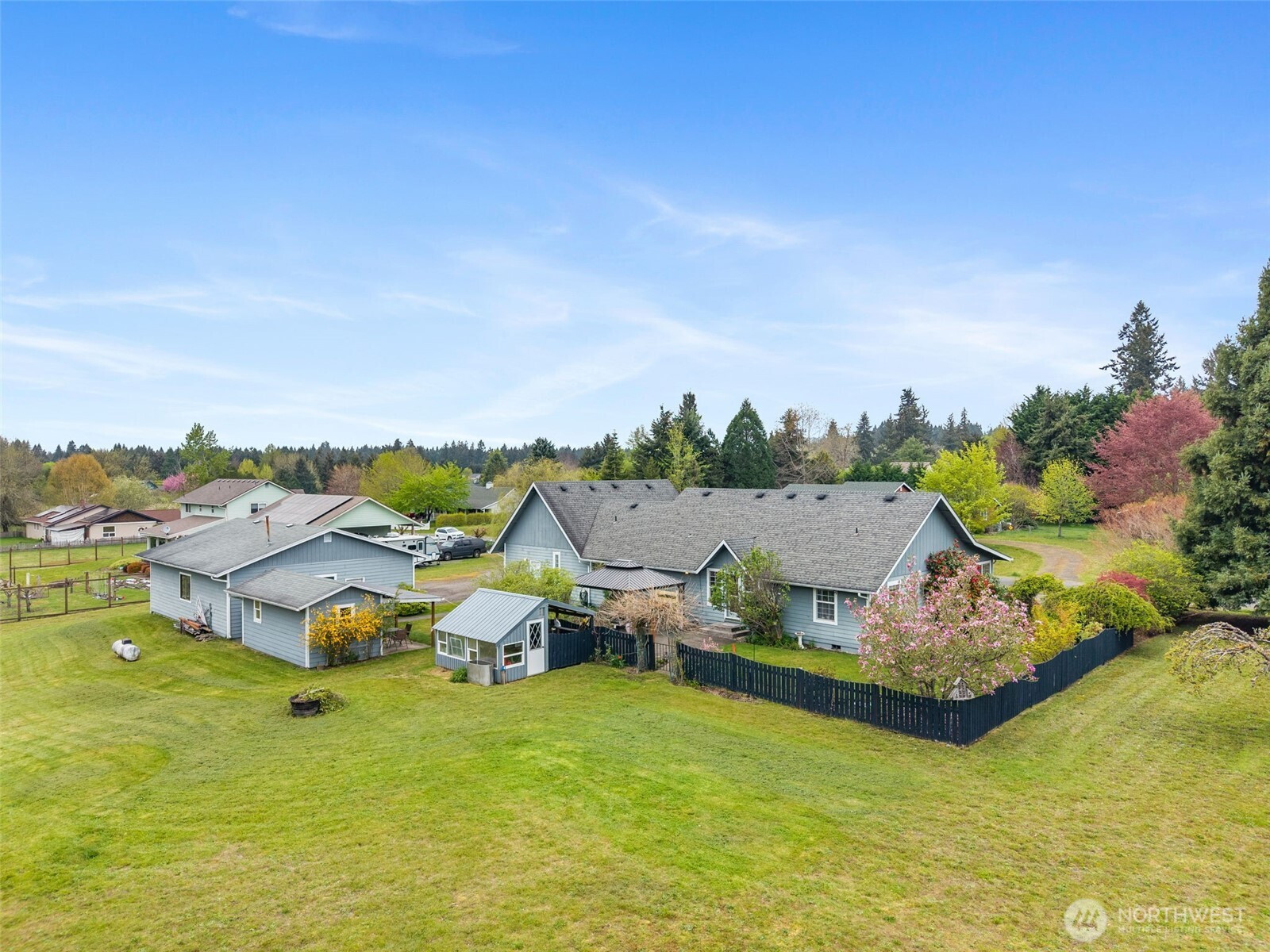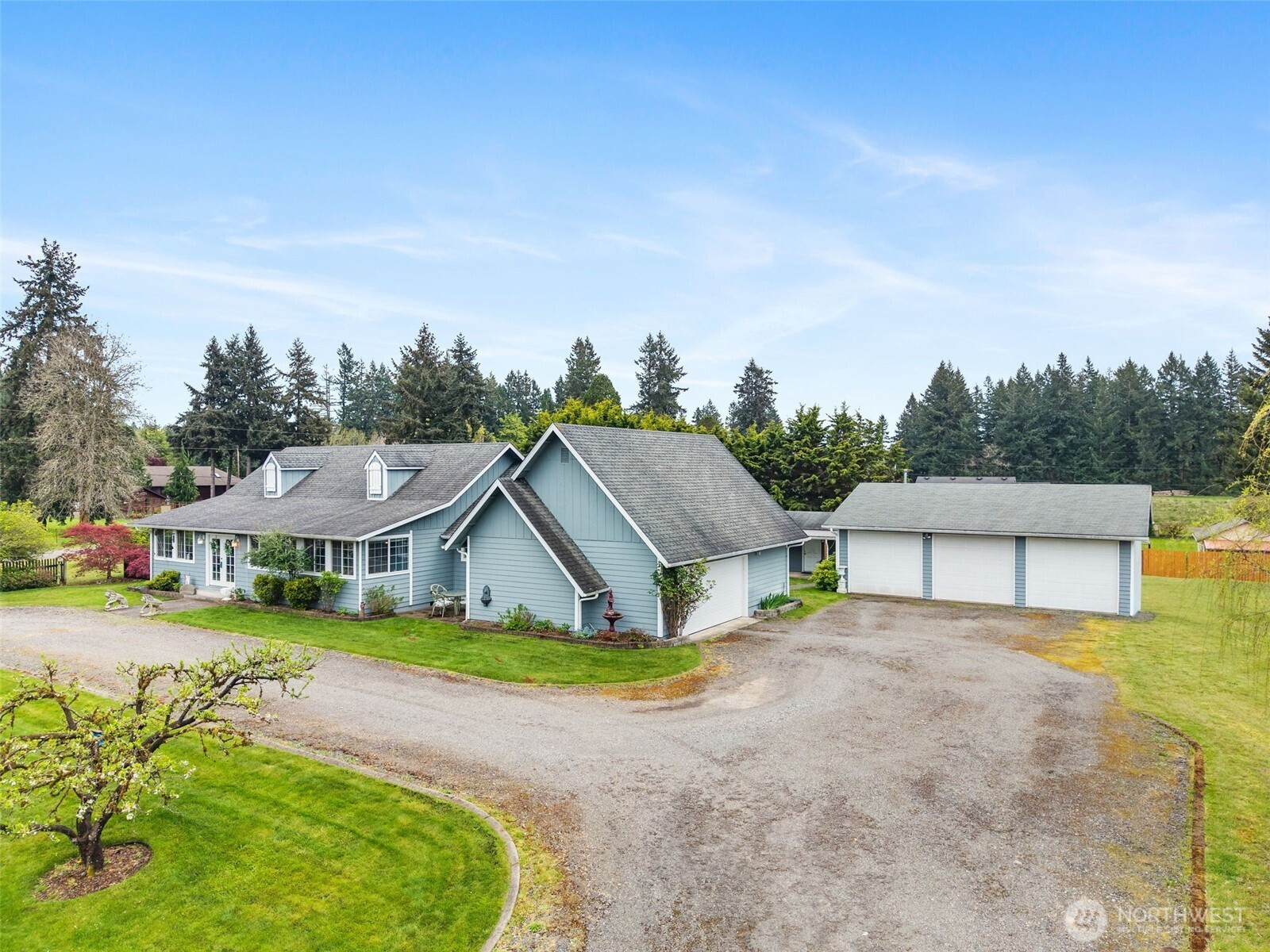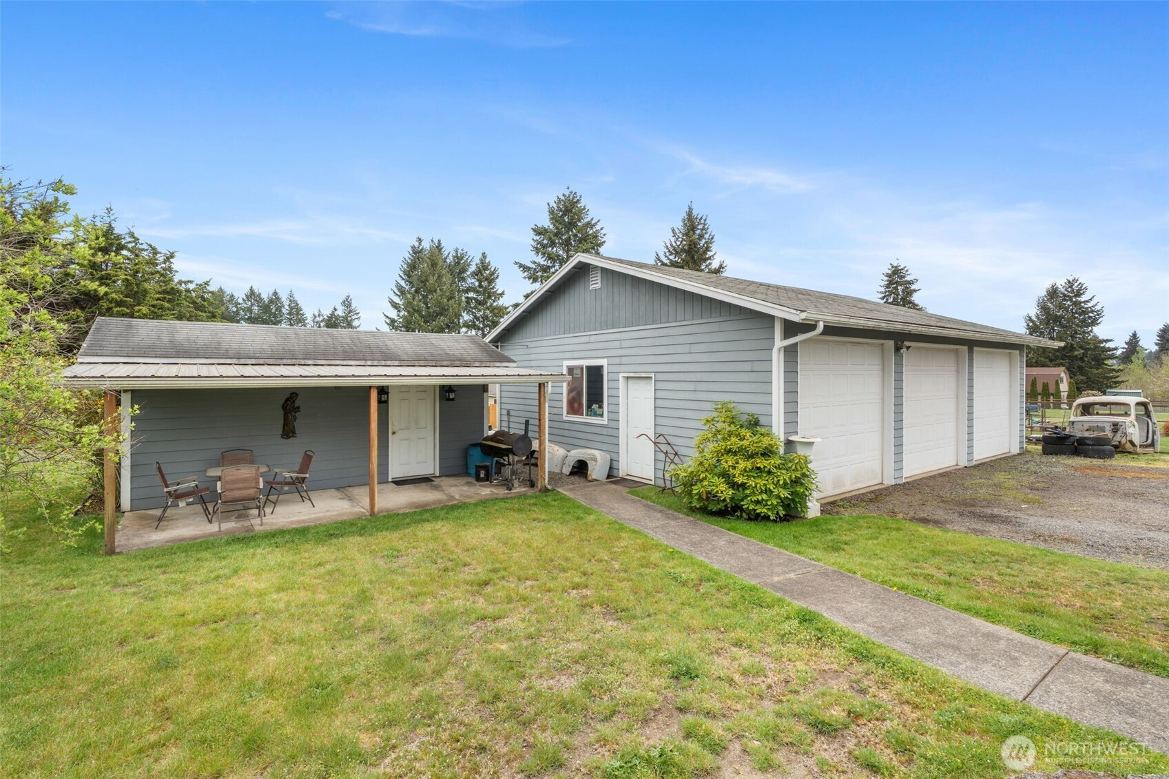 Spacious and beautifully maintained 3-bedroom, 2-bath rambler featuring an open floor plan and beautiful oak hardwood floors. The kitchen offers a stunning stone backsplash formica counter, while the main bath has been updated with a new tile shower and granite countertop. Additional upgrades include a new hot water heater. Situated on 2 private acres, this property is a dream for car enthusiasts and hobbyists alike, with a detached shop complete with a hydraulic lift and an additional outbuilding with a compressor for extra workspace and storage. Underground sprinklers add convenience, and best of all this property is not part of an HOA!