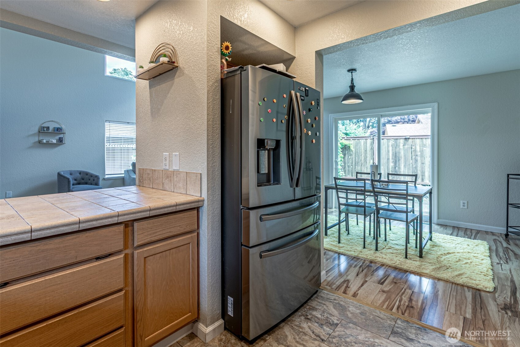 Lovingly cared for 3-bedroom, 2.5-bath home offering nearly 1,800 sq ft of comfortable living space. The main level features soaring ceilings and abundant natural light, complemented by updated laminate wood flooring throughout the main floor, staircase, and upper level. The spacious kitchen provides ample storage and includes a newer refrigerator (just 2 years old). Upstairs, you’ll find three generously sized bedrooms, including a primary suite with a walk-in closet and private en-suite bath. Recent updates include fresh interior paint, new carpet in the primary bedroom (2023), a new water heater (2023), and a recently serviced furnace and heat pump. Step outside to a beautifully designed backyard retreat—perfect for entertaining! A large patio provides plenty of space for outdoor dining and gatherings, while thoughtfully landscaped plants add color, privacy, and charm. The fully fenced yard offers both beauty and low-maintenance ease, creating an inviting space to relax or host guests. Enjoy energy efficiency with a heat pump & a 3-year-old solar system that helps keep utility costs low. HOA dues cover front yard watering and maintenance for added convenience. Ideally located just 14.9 miles from JBLM Main Gate.