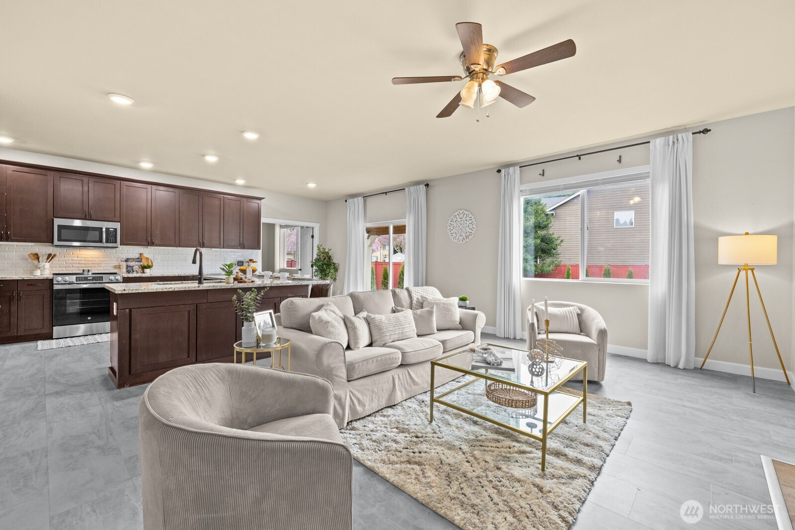 Fresh, updated, and move-in ready in a prime Lacey location between Hicks and Long Lake! This spacious home blends comfort and function with an open-concept layout, abundant natural light, and thoughtful details throughout. The kitchen features granite countertops, center island with seating, and seamless flow into living and dining spaces, perfect for everyday living and entertaining. Main-level bedroom offers flexibility for guests or office. Upstairs, the expansive primary suite is a true retreat with sitting area, dual walk-in closets, and a 5-piece bath. Large rec room is another bonus for movie nights or whatever you envision! Recent updates include flooring, furnace, A/C, water heater, and roof. Enjoy the fully fenced yard, patio, and oversized garage with extra space for storage or hobbies. Close to lakes, parks, schools, shopping, and easy JBLM access.