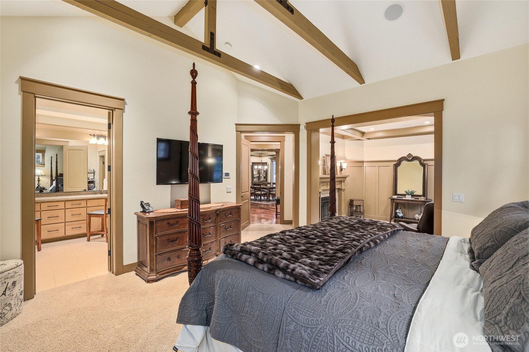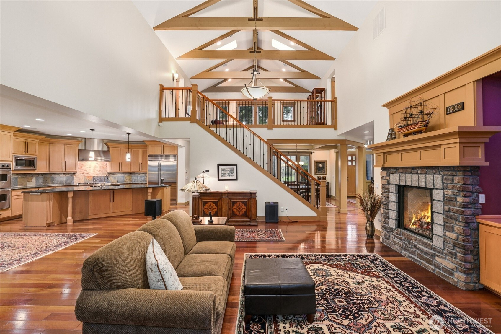 Stunning single-owner home in The Reserve at Cooper Point showcases quality craftsmanship throughout, featuring vaulted ceilings with exposed beams, wood-wrapped windows, and rich hardwood floors, all nestled on a forested 1.43-acre lot. The main floor offers a formal living room/den with gas fireplace, formal dining room, open concept great room that flows seamlessly into the spacious kitchen featuring high-end appliances, plentiful cabinetry, dining space plus island seating, and a butler’s pantry—perfect for a coffee station. Just off the kitchen, a large covered patio with fireplace and Alfresco grill, ideal for year-round entertaining. The split bedroom design offers a guest room and full bath at one end of the home, and an impressive primary suite at the other, with walk-in closet, 5-piece bath with double shower and soaking tub, and a private sitting room with gas fireplace. Upstairs, a spacious loft overlooks the great room, with a bedroom at each end, a full bath, and abundant closet storage. Additional highlights include built-in speakers throughout the home and back patio, California-style closet systems, Hunter Douglas Roman shades in bdrms, CentralLux central vac, finished/insulated 3-car garage with cabinetry, spacious driveway with room for RV parking & 50-amp plug, generator wiring, and 12’x14’ shed for extra storage. Recent interior & exterior paint, new roof and gutters (2026).