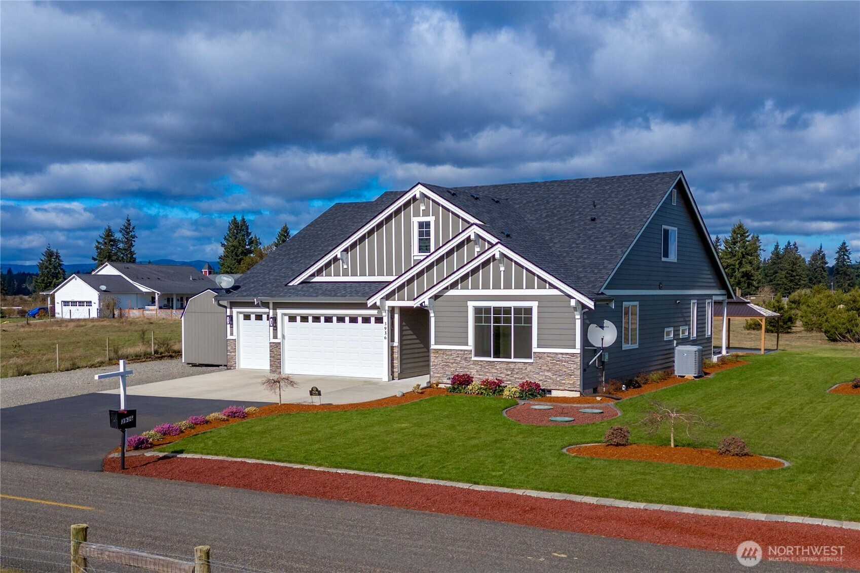 Gorgeous & nearly new, this 4-bedroom, 4-bath custom home blends luxury, functionality & Northwest charm on a serene almost 5-acre oasis! Filled w/natural light, high-end finishes, & thoughtful design, this impeccably maintained home is both spacious & inviting.Step into the grand, light-filled entry that opens to an airy living room & a stunning chef’s kitchen with an eating area that flows effortlessly into the dining room. Enjoy seamless indoor-outdoor living w/access to a covered patio & a beautifully landscaped walkway leading to a 14x24 covered pergola boasting a breathtaking Mt. Rainier view-an entertainer’s dream!The main floor hosts the luxurious primary suite with a spa-inspired 5-piece bath & oversized walk-in closet, plus a junior suite with its own ¾ bath & walk-in closet—perfect for multigenerational living. You’ll also find a third bedroom, spacious laundry room, & guest 1/2 bath conveniently located on the main level.Upstairs, a generous great room offers flexible space for entertainment, hobbies, or a private retreat, alongside a third primary suite with full ensuite bath.The park-like property features beautiful landscaping w/an irrigation system, RV parking with power, a 10,000-watt backup generator, w/outlets, a 12x24 powered workshop/shed, & a 40-ft high-cube storage container w/side roll-up door. A 3-car garage includes an electric vehicle charging station & ample storage. This home has it all—luxury, comfort & privacy—all move-in ready. See Video Tour!