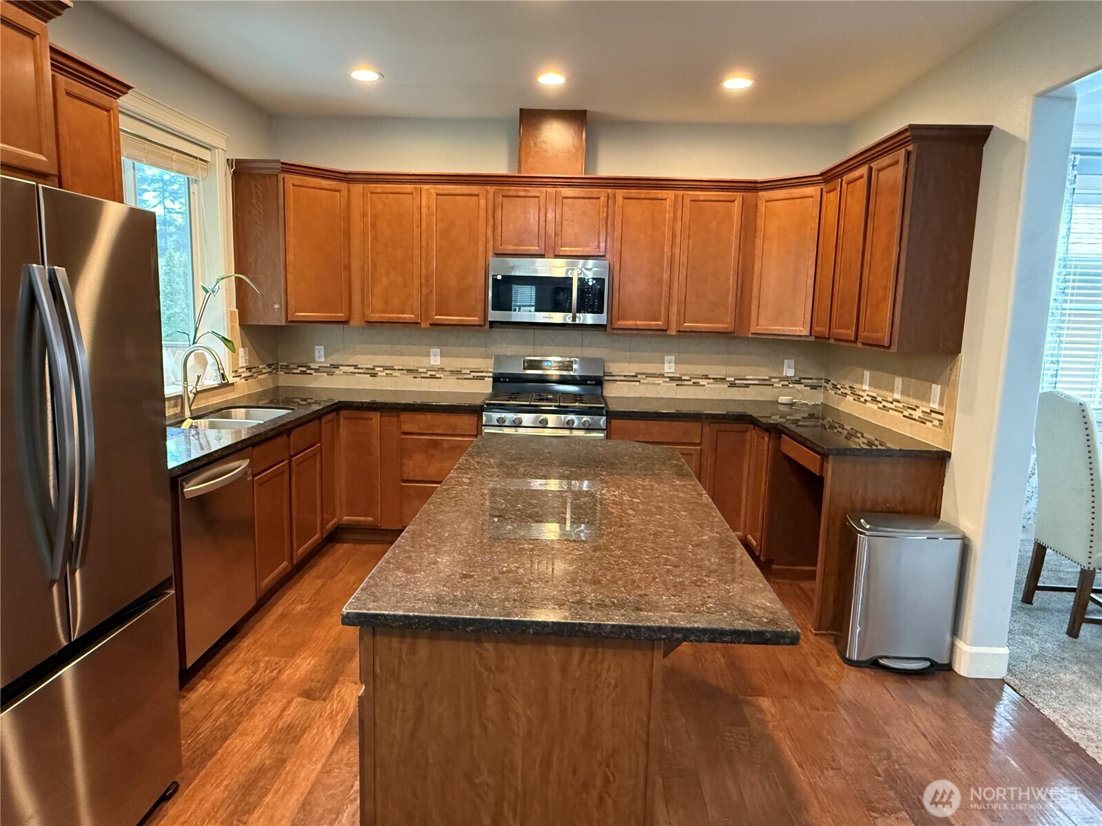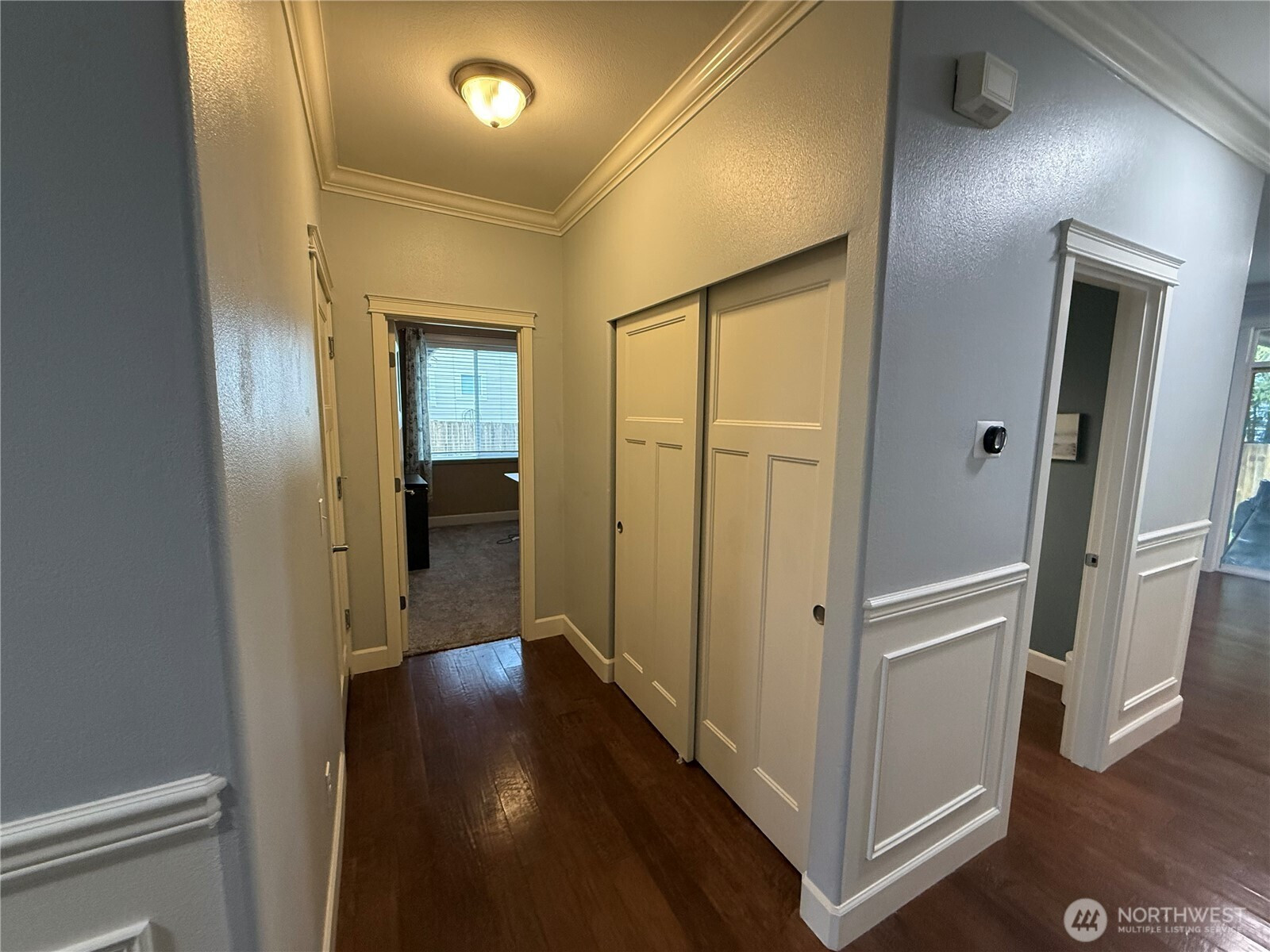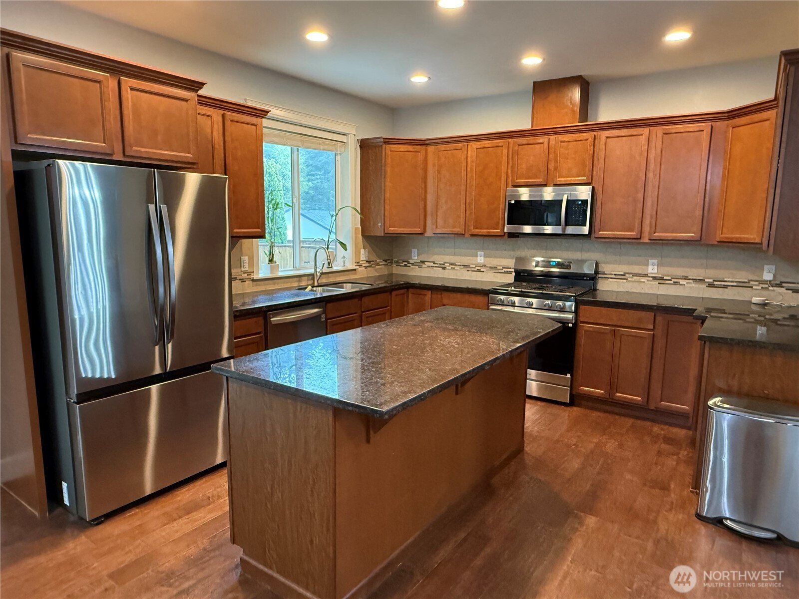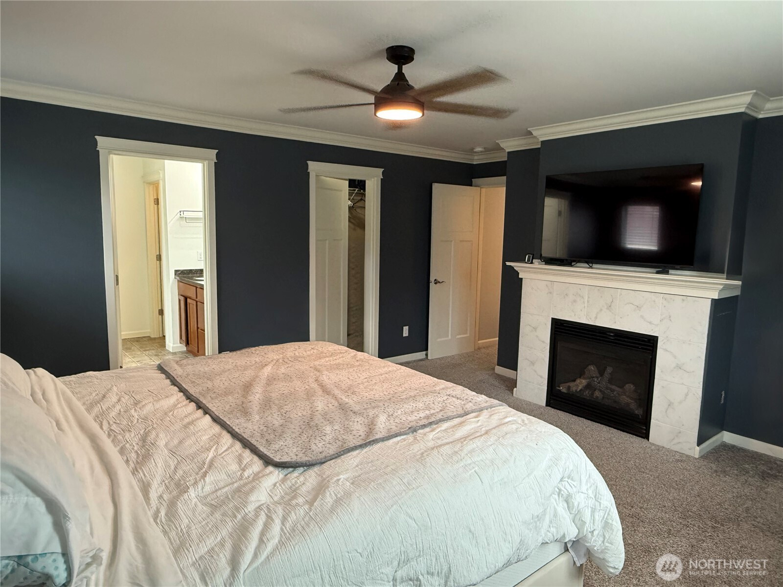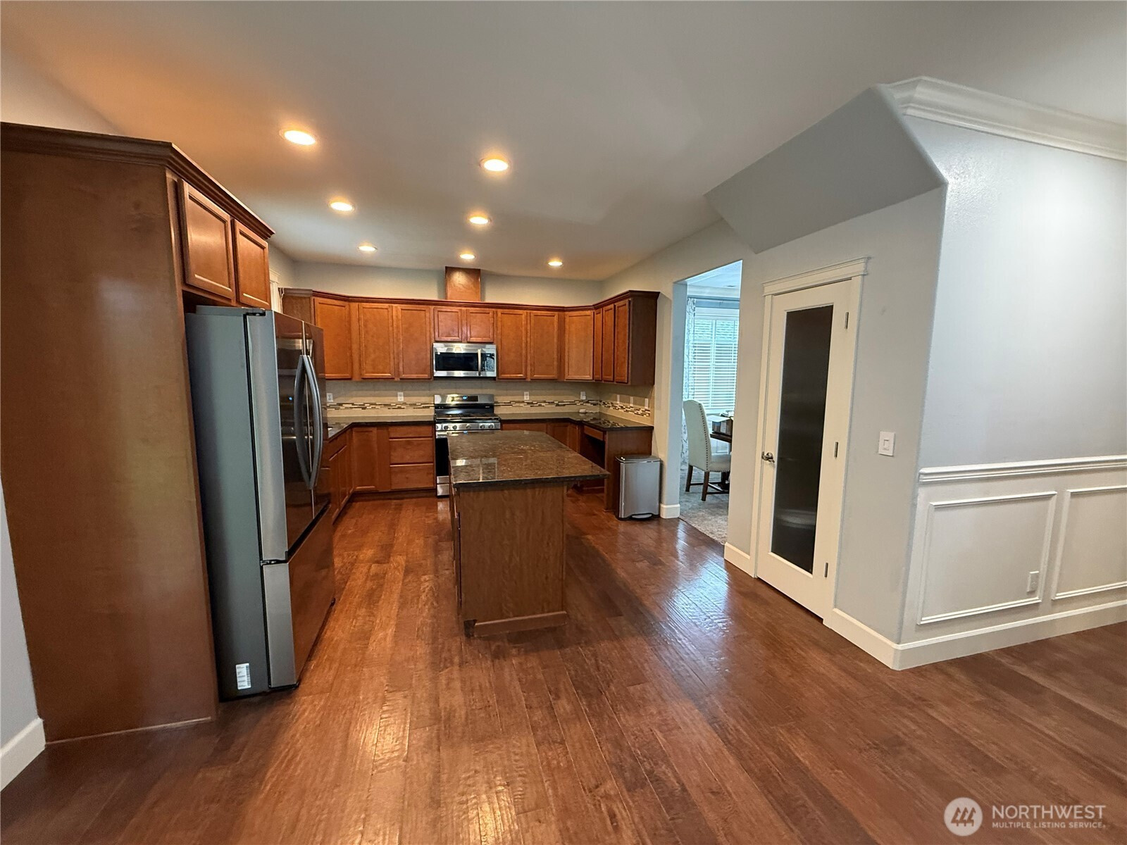 Welcome to this beautiful residence in the sought after Trailside Estates community! Thoughtfully curated with timeless finishes and generous living spaces, this home offers a refined lifestyle in a prime location.From the moment you arrive, you’re greeted by an inviting covered front entrance. Inside, extensive crown molding and detailed wainscoting flow throughout. The main level is designed for both formal entertaining and effortless daily living, featuring a formal living room, an elegant dining area, and a dedicated office/den that is perfect for remote work or quiet study, along with a convenient half bath.At the heart of the home, the chef-inspired kitchen serves as a true centerpiece, showcasing granite countertops, stainless steel appliances, and walk-in pantry, seamlessly connecting to the main living areas for an open yet refined feel.Upstairs, a huge bonus living area offers incredible flexibility for a media room, playroom, or additional lounge space. The luxurious primary suite is complete with its own cozy fireplace, big walk-in closet, and well-appointed en-suite bath designed for comfort and relaxation. Step outside to the covered back patio ideal for year round entertaining. Oversized 3 car garage provides ample space for vehicles & storage. Additional highlights include an energy-efficient heat pump for year-round climate control and easy access to I-5 for a easy commute. Enjoy close proximity to schools, shopping, entertainment, and scenic local trails.