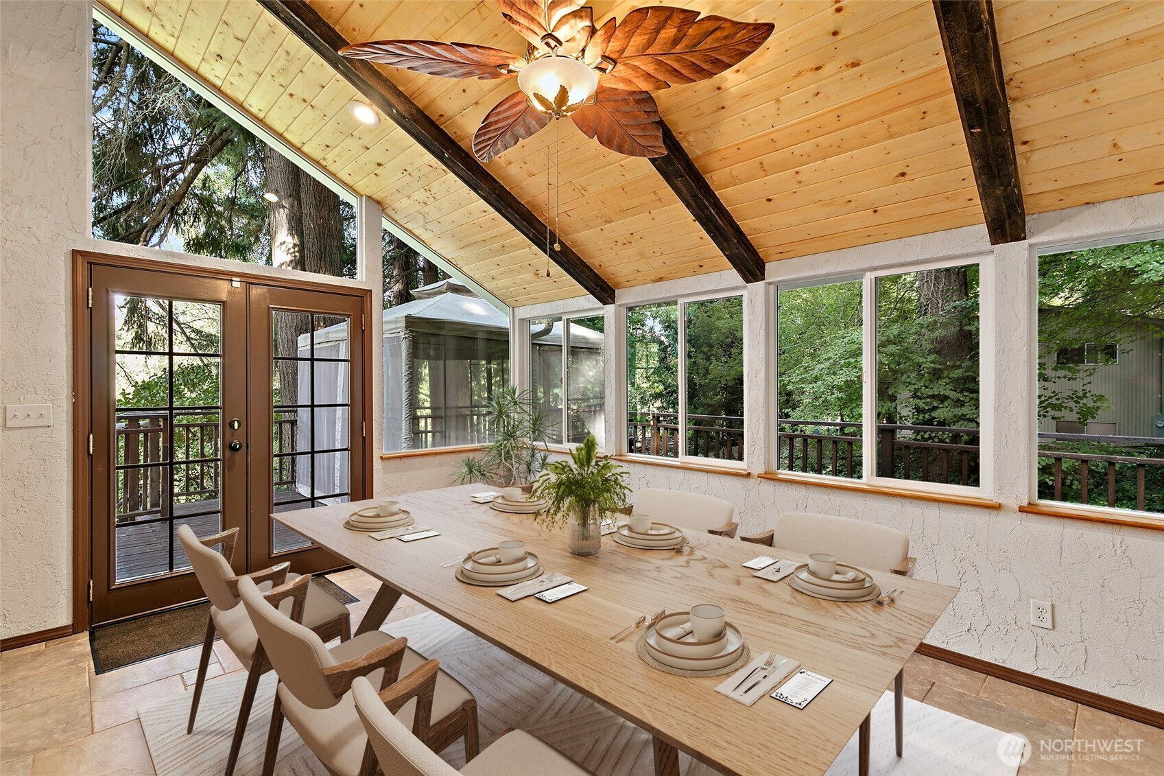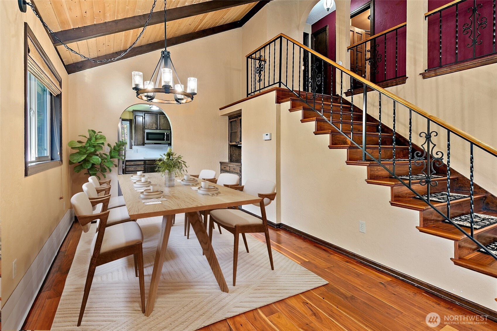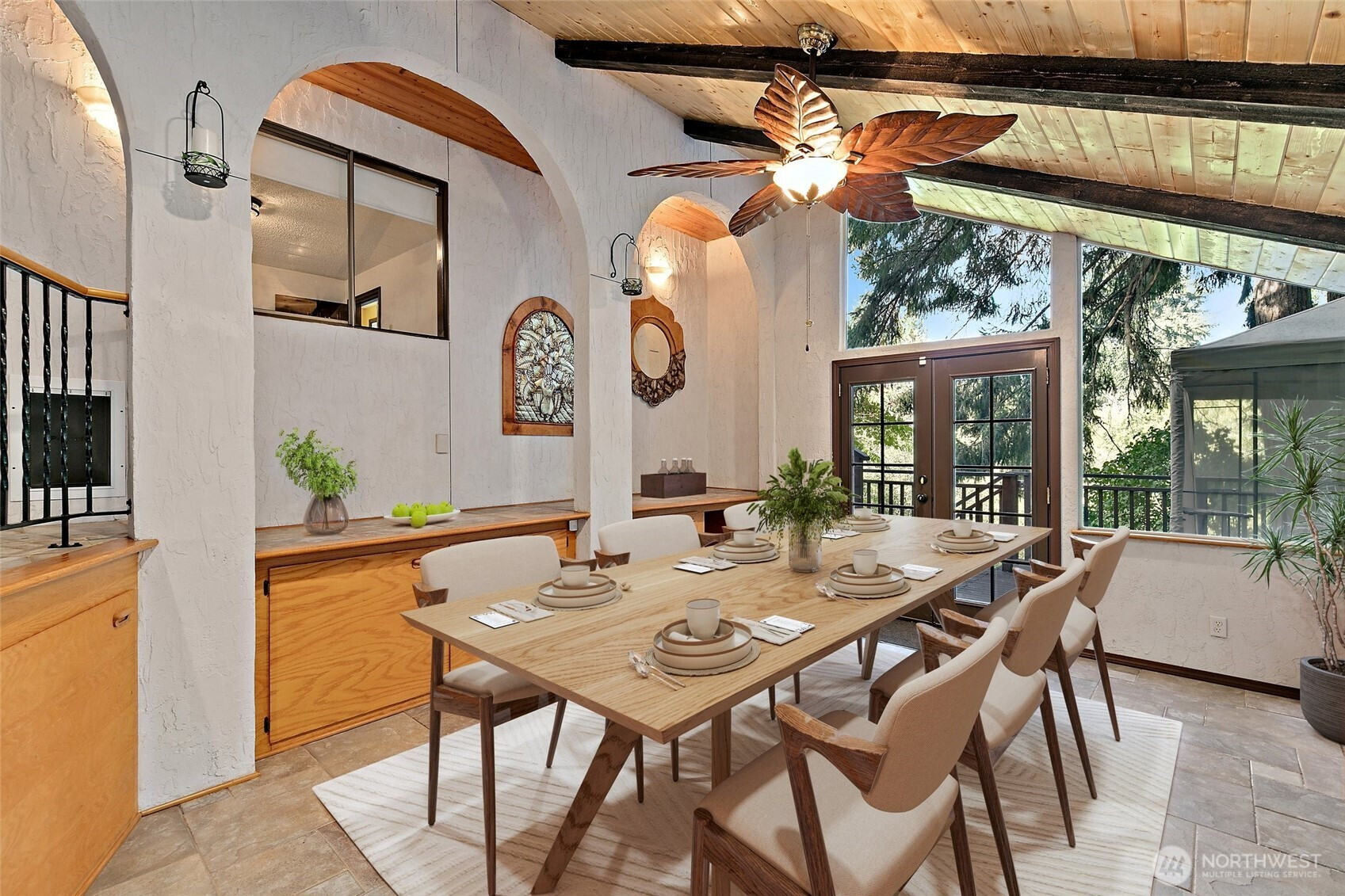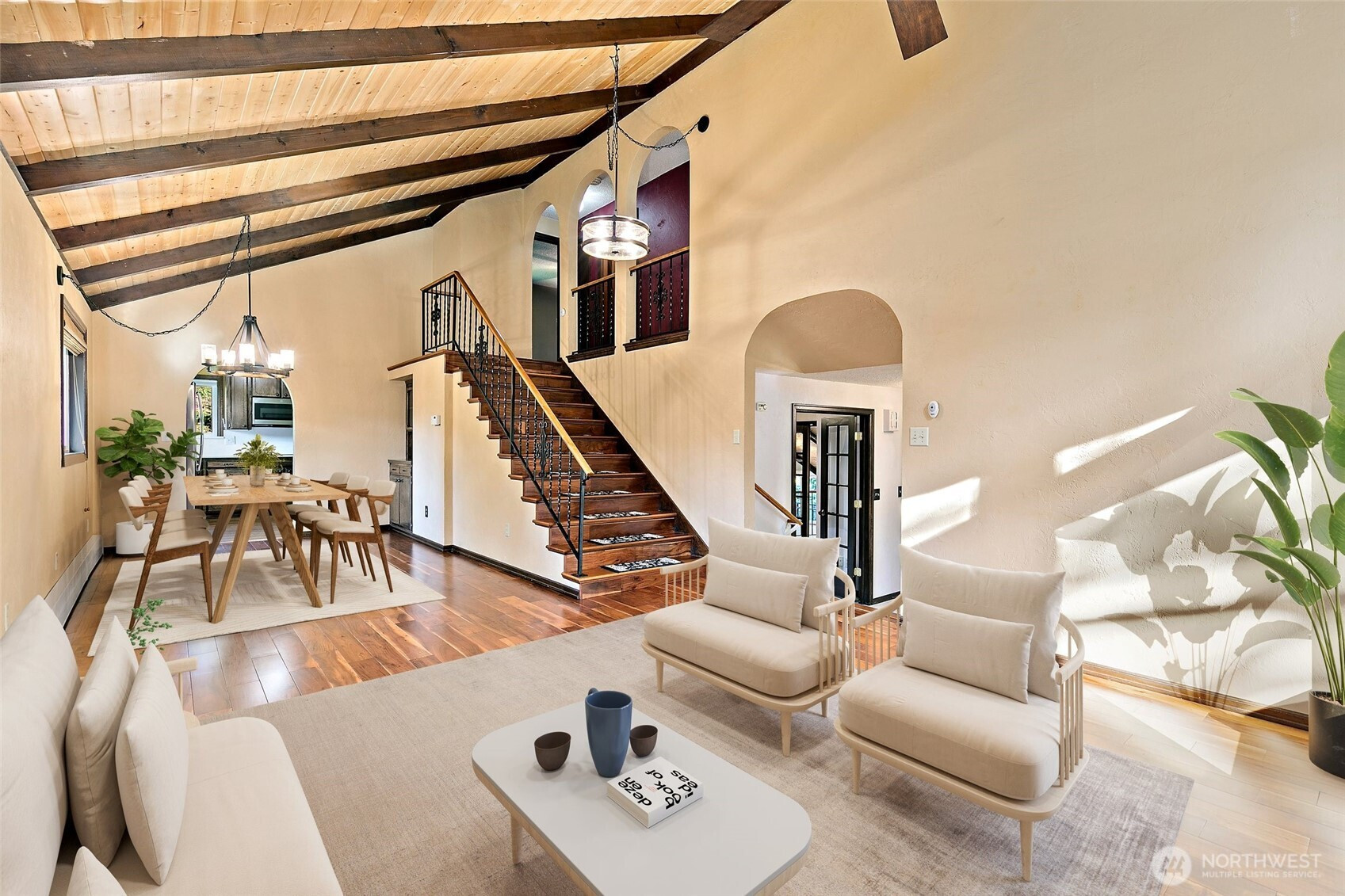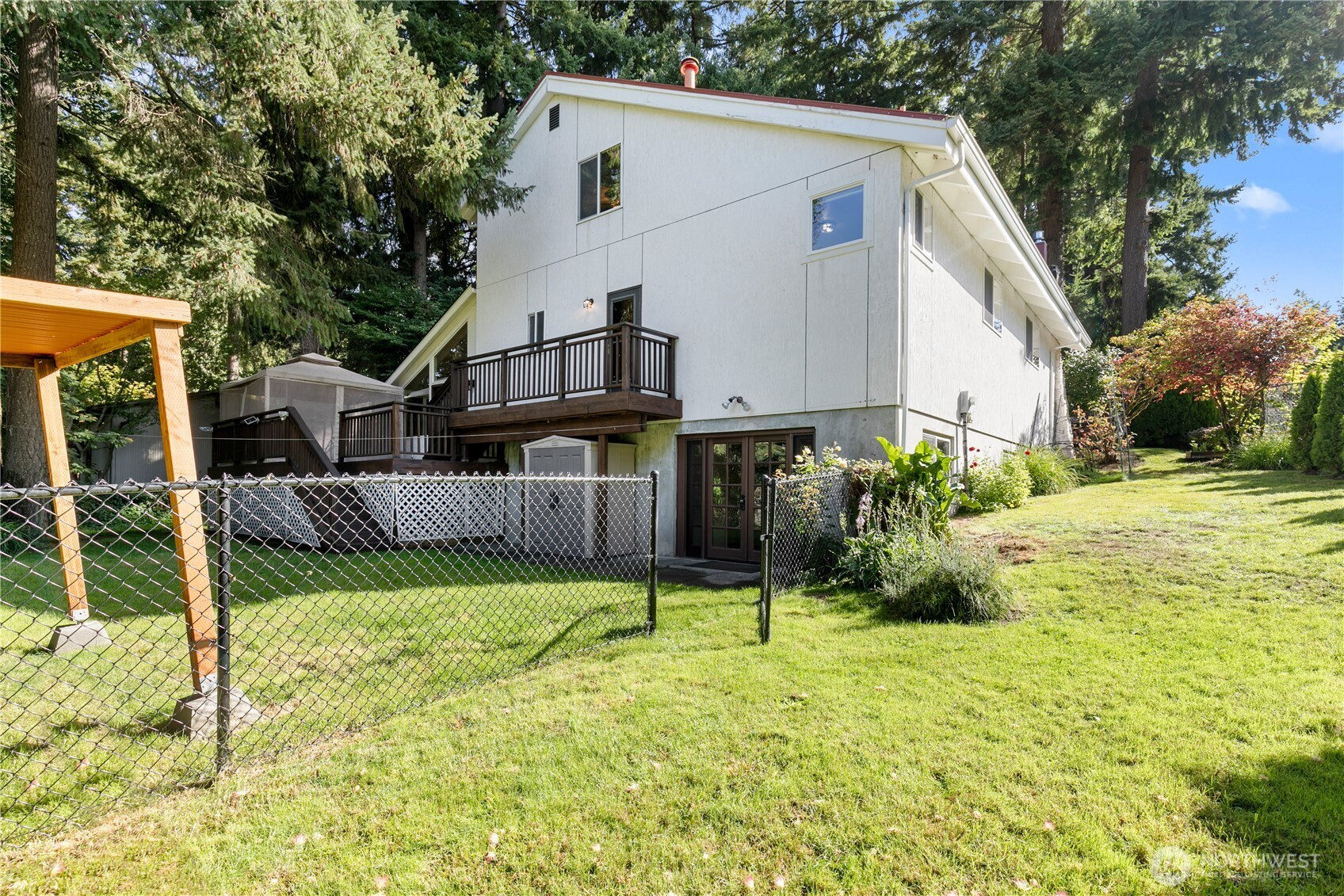 Welcome to this enchanting 3bdr/3bath Olympia home filled with classic Spanish charm, from its stucco & stone exterior to the inviting covered entry. Inside, exposed-beam ceilings and a cozy gas fireplace create a warm gathering space, while the kitchen with pantry, dining room, den, half bath, laundry, and sun-filled solarium make daily living a joy. Upstairs, the primary suite offers dual closets with hidden storage, while one bedroom opens to a rooftop and another to a private balcony. The lower level is perfect for entertaining with a huge family room, wet bar, rec room, bonus spaces, and a 3/4 bath. Outside, enjoy a 2-car garage, generous parking, yard with decks, gazebo, shed, sprinkler system, and breathtaking view of seasonal pond.