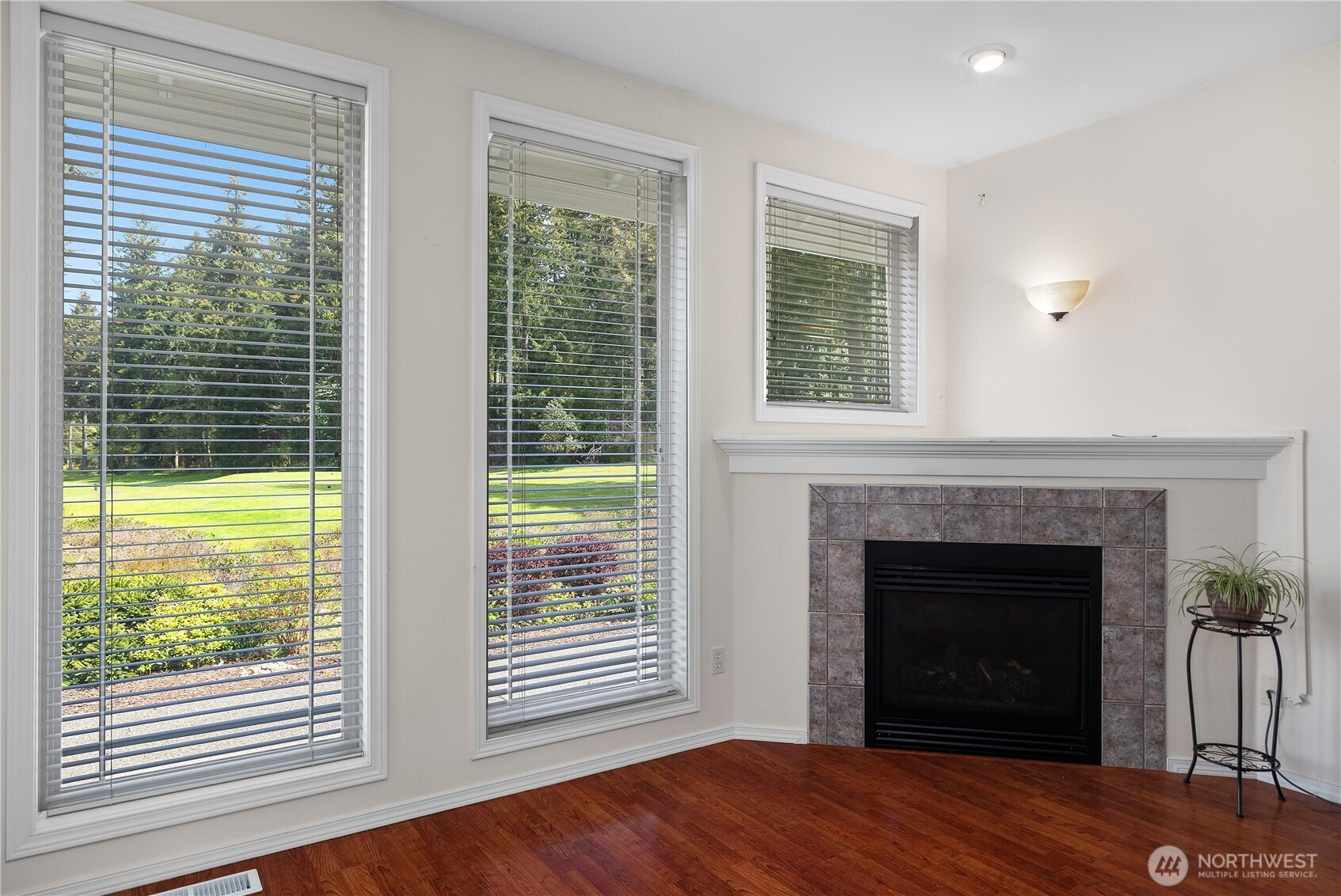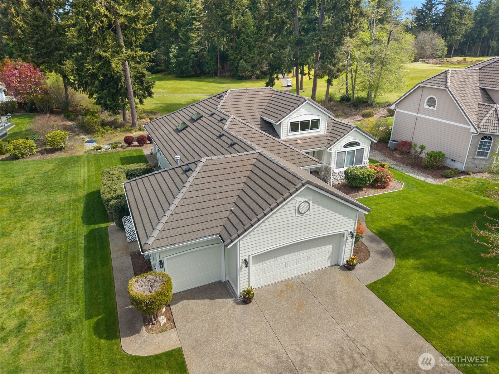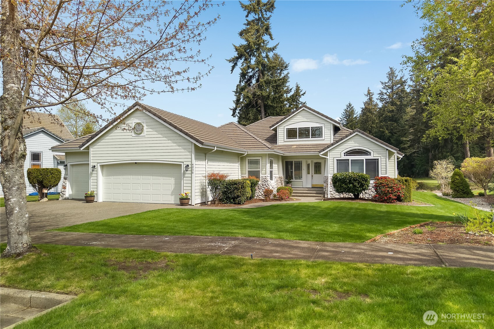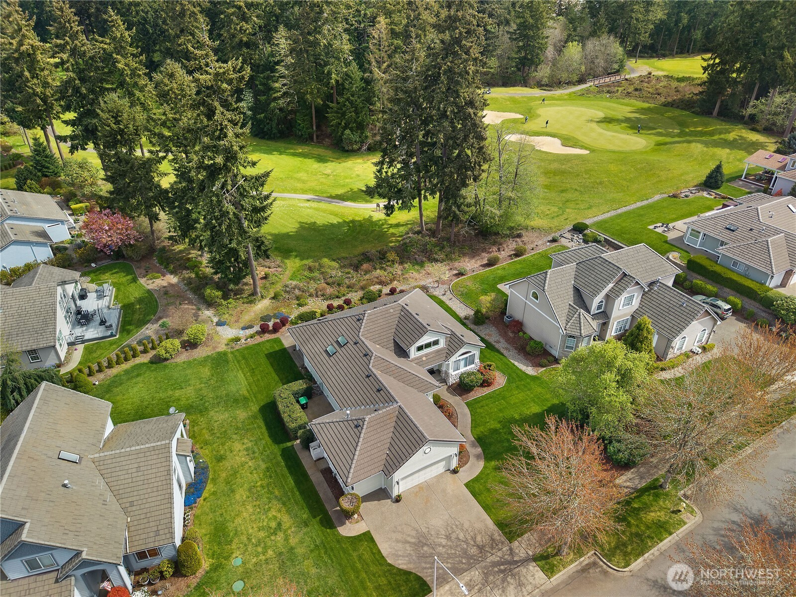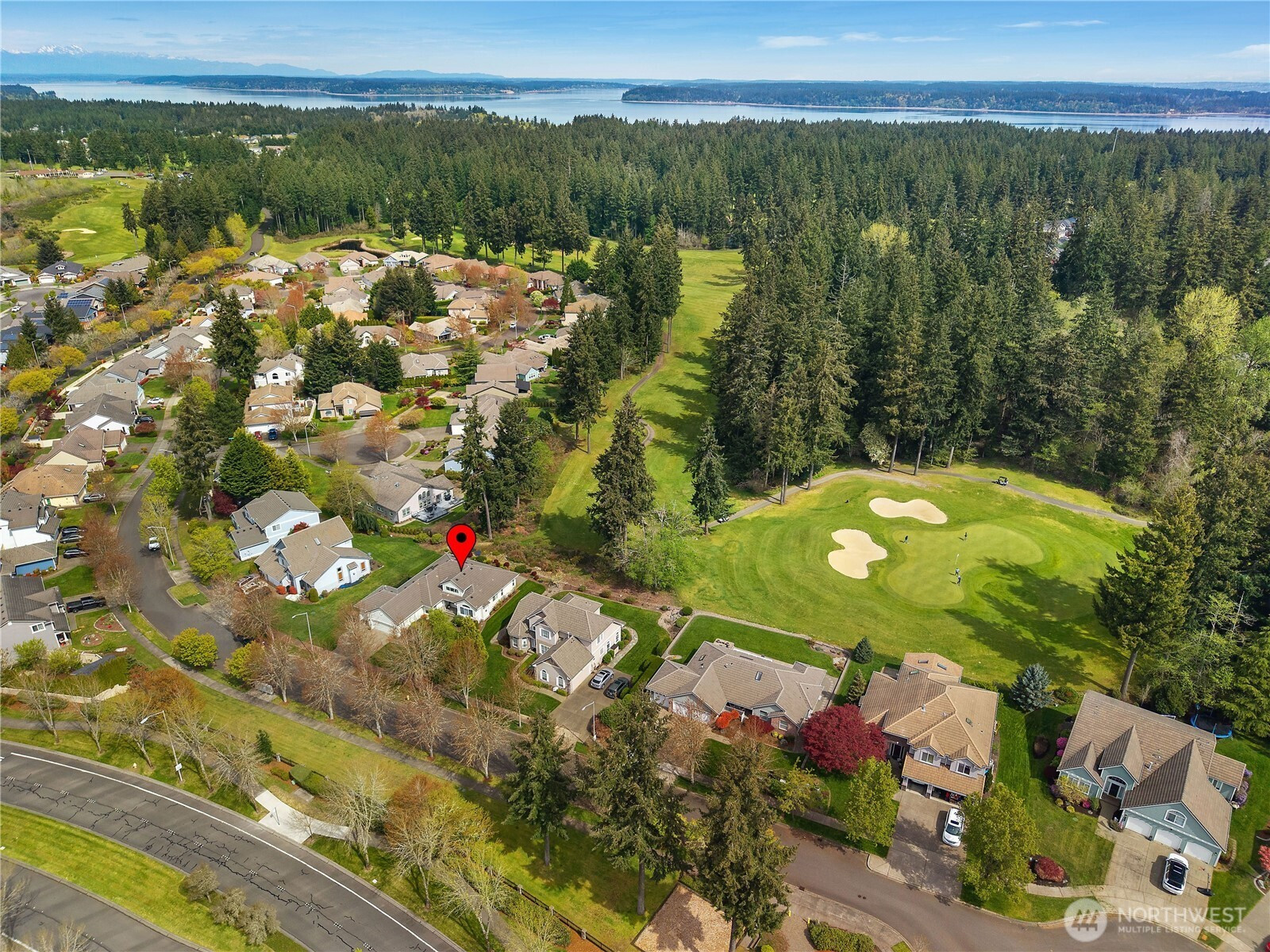 Wonderful views on the 9th tee of the Woodlands Golf course in Hawks Prairie Campus Green. Great open floor plan with windows over looking the golf course in the living areas & primary bedroom & a large concrete back patio. Home has a formal living and dining room & a family room with gas insert fireplaces, 3 bedrooms 2 bath plus an office w/built-ins. Freshly painted exterior, 5 zone sprinkler system & newer sod. Great fenced enclosure with built in dog door off the 3 car garage. A/C & all appliances included.