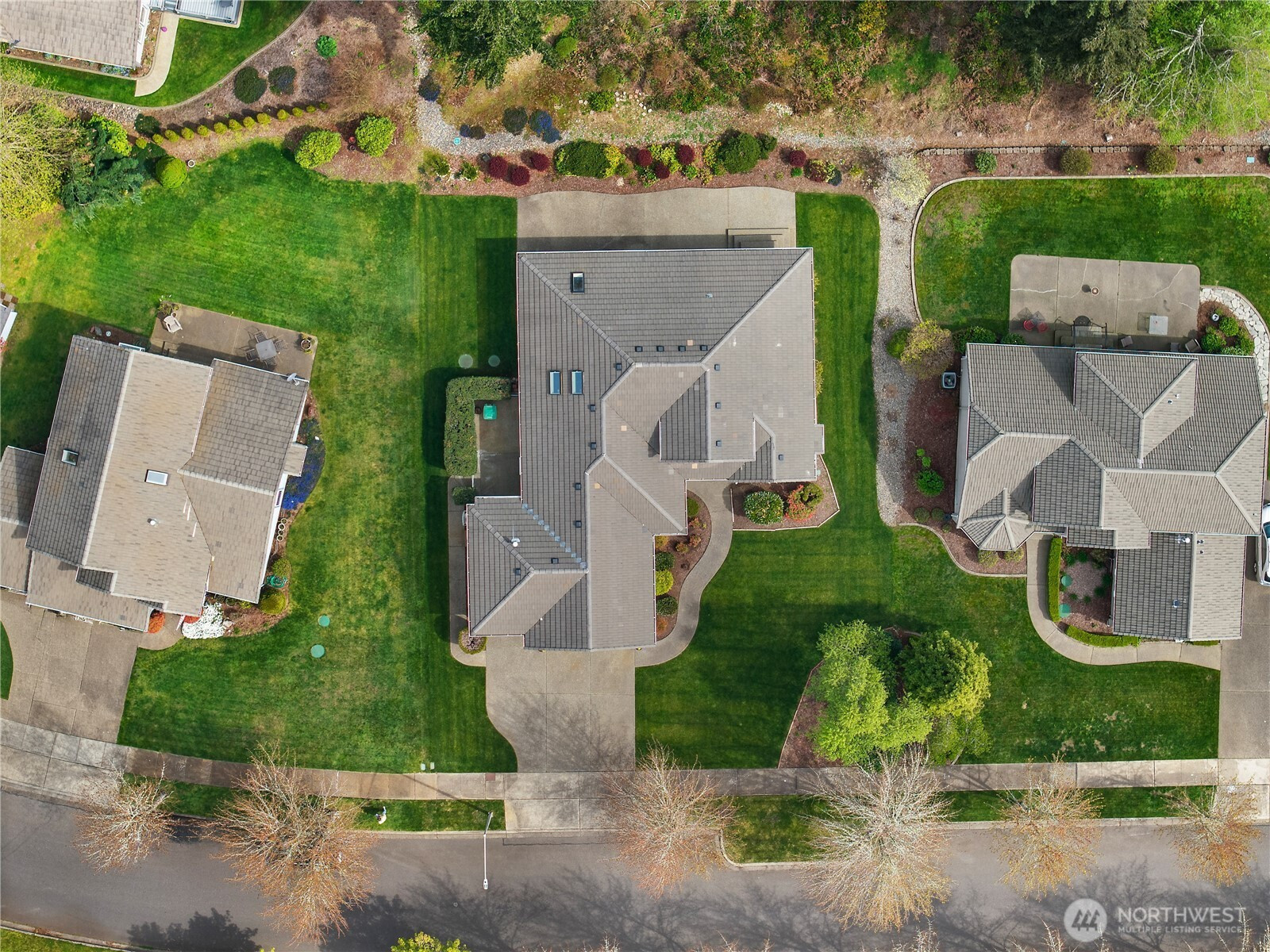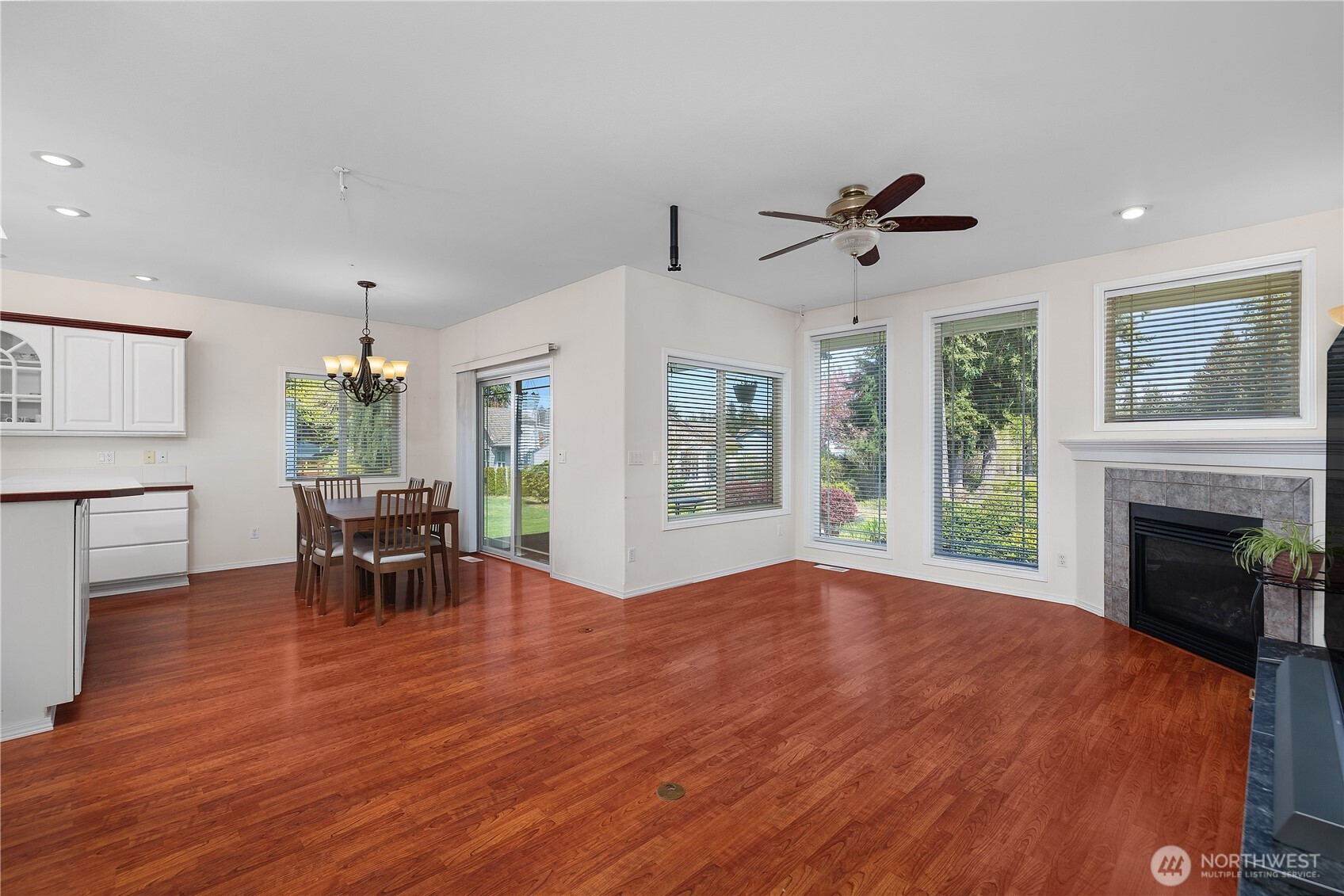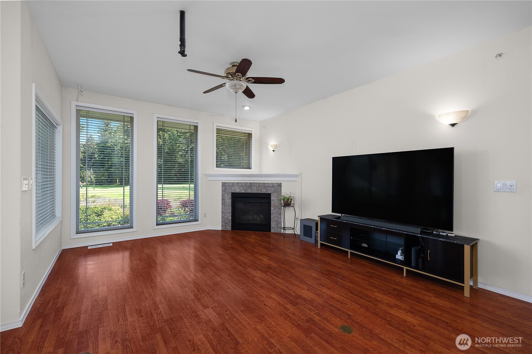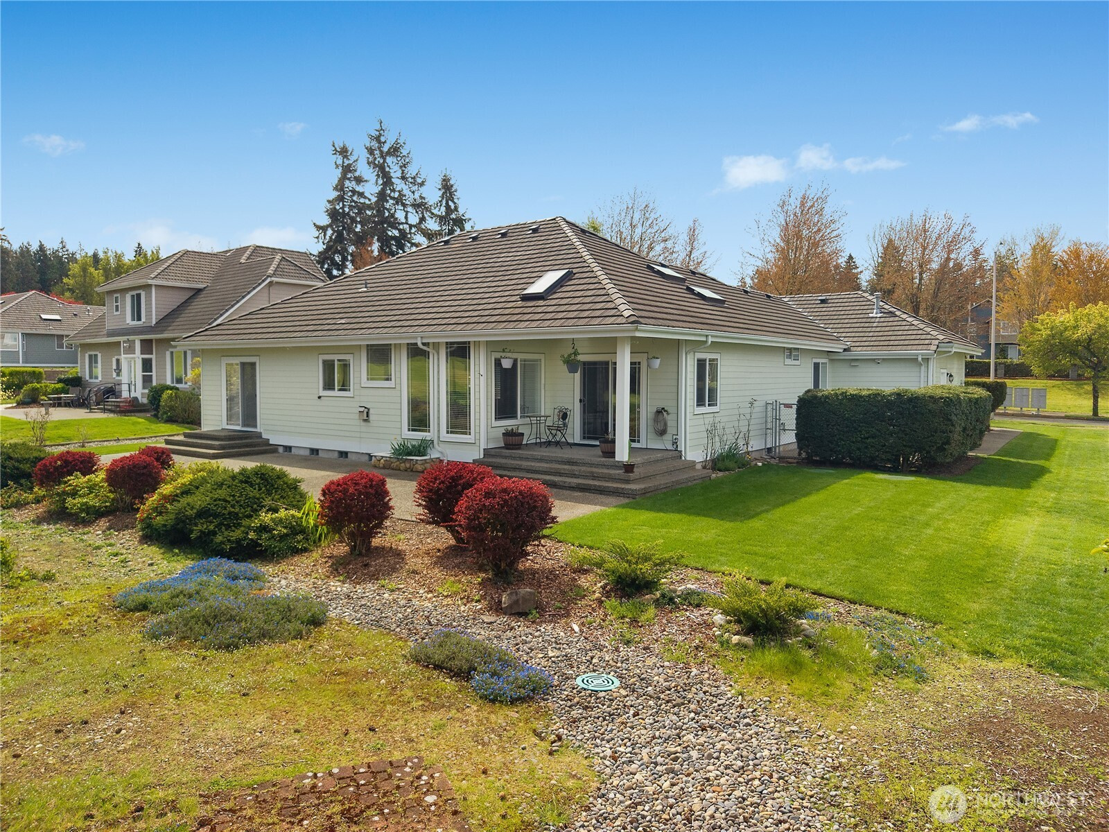 Wonderful views on the 9th tee of the Woodlands Golf course in Hawks Prairie Campus Green. Great open floor plan with windows over looking the golf course in the living areas & primary bedroom & a large concrete back patio. Home has a formal living and dining room & a family room with gas insert fireplaces, 3 bedrooms 2 bath plus an office w/built-ins. Freshly painted exterior, 5 zone sprinkler system & newer sod. Great fenced enclosure with built in dog door off the 3 car garage. A/C & all appliances included.
