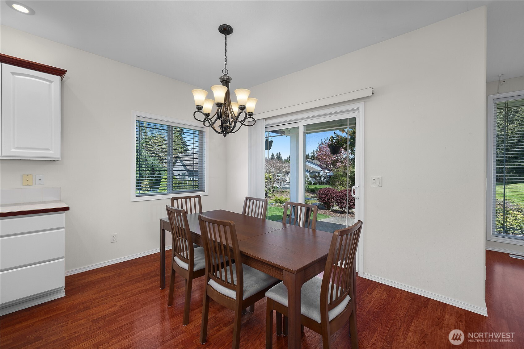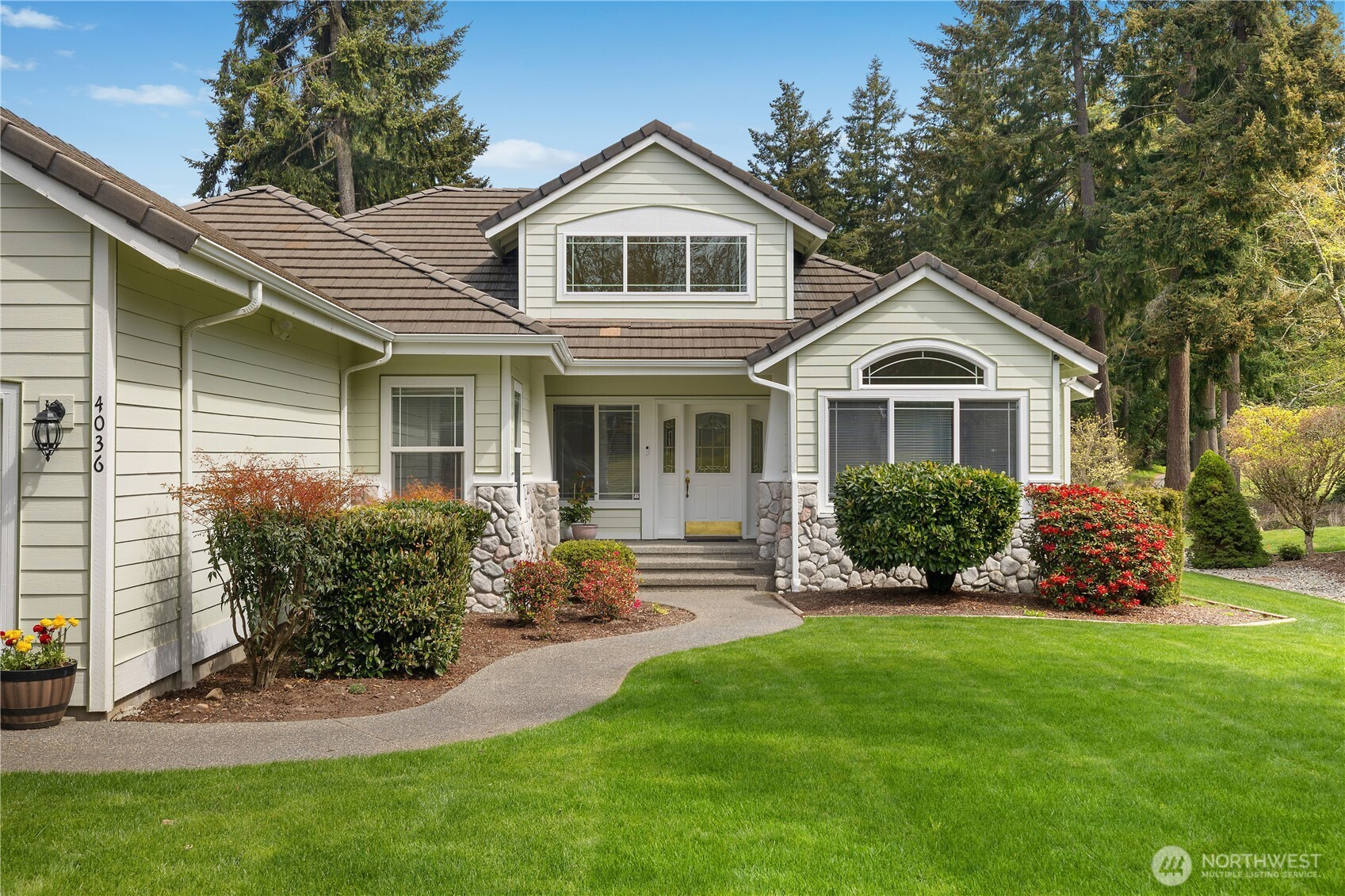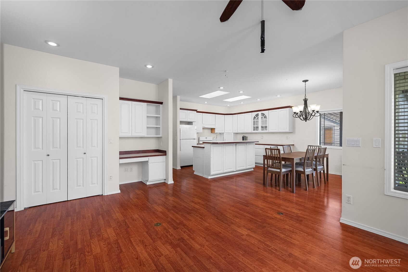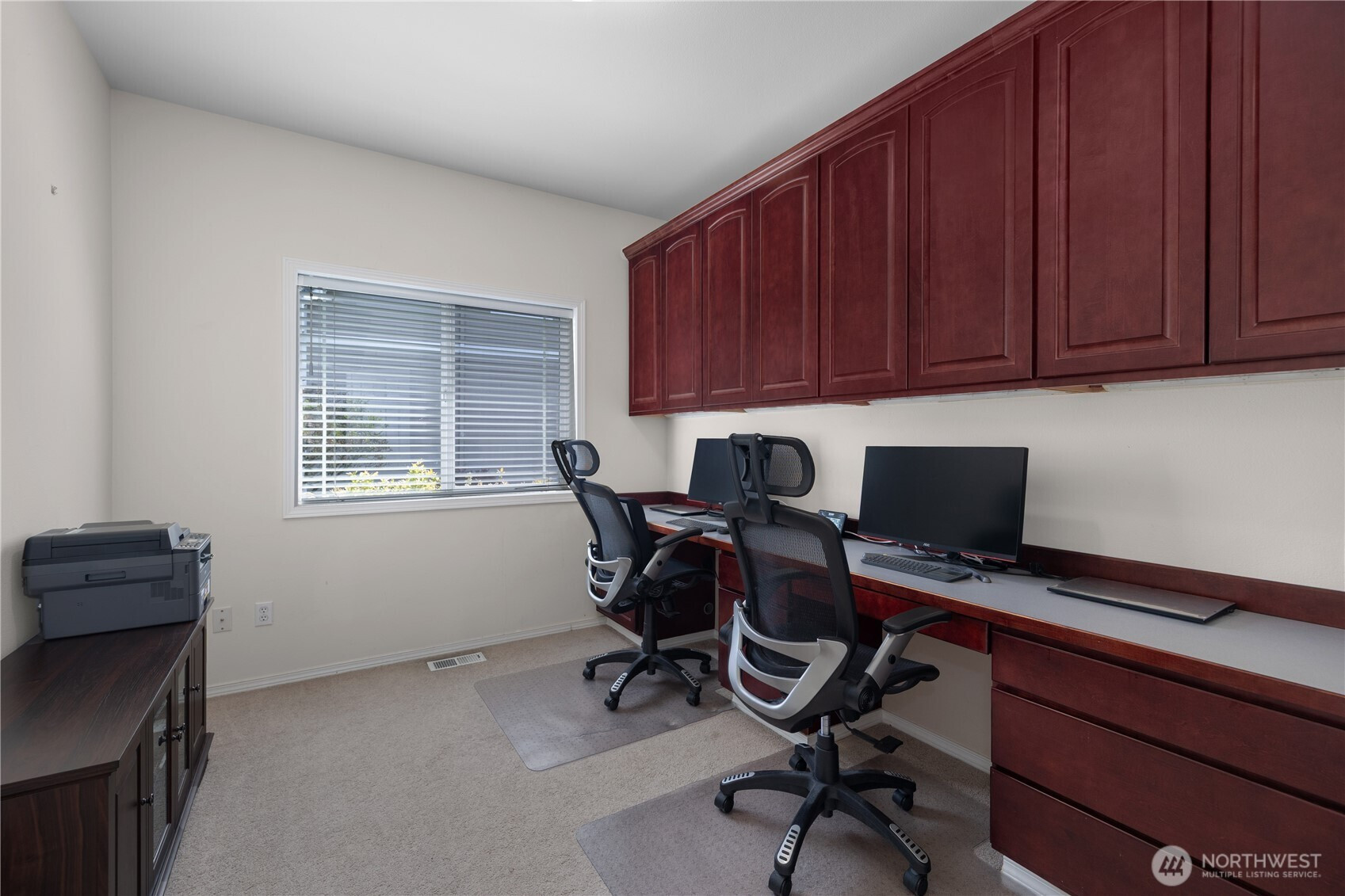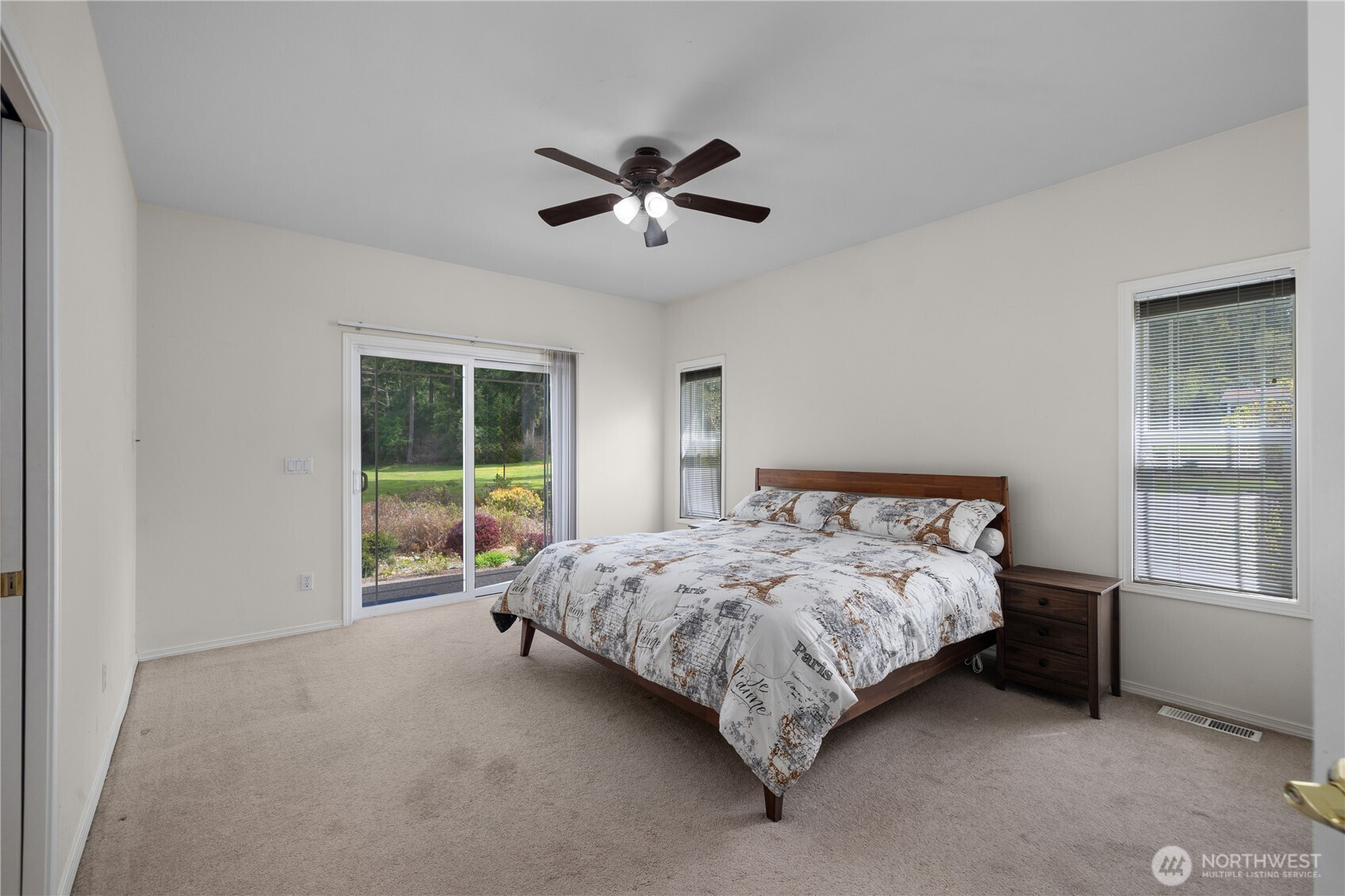 Wonderful views on the 9th tee of the Woodlands Golf course in Hawks Prairie Campus Green. Great open floor plan with windows over looking the golf course in the living areas & primary bedroom & a large concrete back patio. Home has a formal living and dining room & a family room with gas insert fireplaces, 3 bedrooms 2 bath plus an office w/built-ins. Freshly painted exterior, 5 zone sprinkler system & newer sod. Great fenced enclosure with built in dog door off the 3 car garage. A/C & all appliances included.