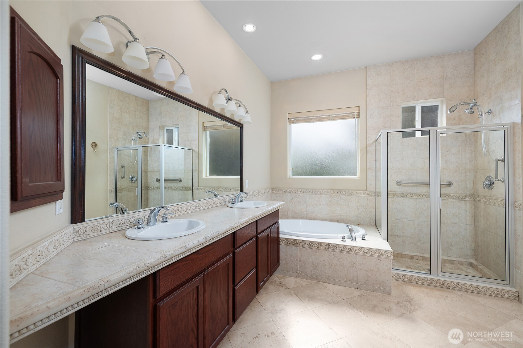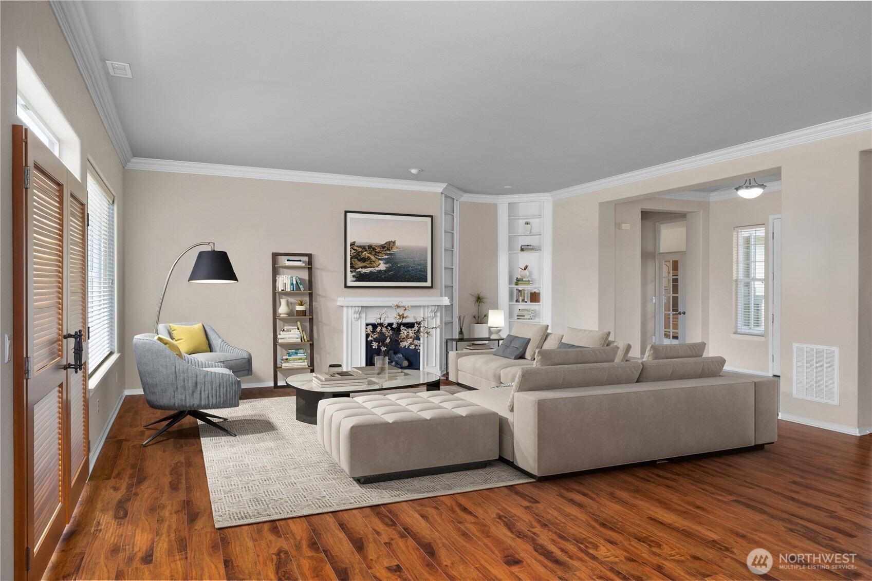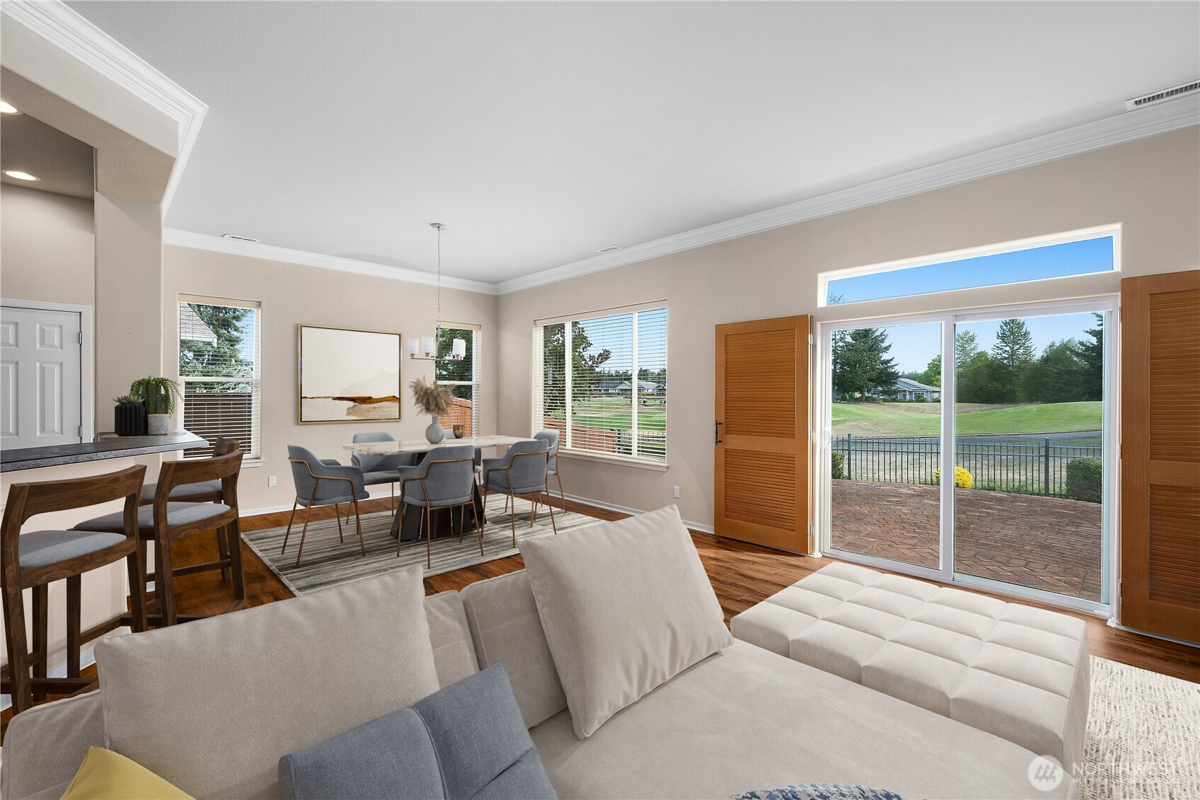 On a private corner lot with stunning golf course views, this home offers both tranquility & luxury. The great room has engineered hardwood floors & custom built-in bookshelves, creating a bright, elegant space. The spacious kitchen features a gas range and ample counter space. The large primary bedroom includes a gas fireplace, built-ins, & an en-suite with a full tile shower & generous walk-in closet. Down the hall is a large bonus room, 2nd bedroom, finished flex room, & full bathroom provide versatile living options. Outside, the expansive patio enhances the serene setting, ideal for relaxing or entertaining. Located in the premier 55+ community of Jubilee, you’ll enjoy endless amenities, social opportunities, walking trails & beach.