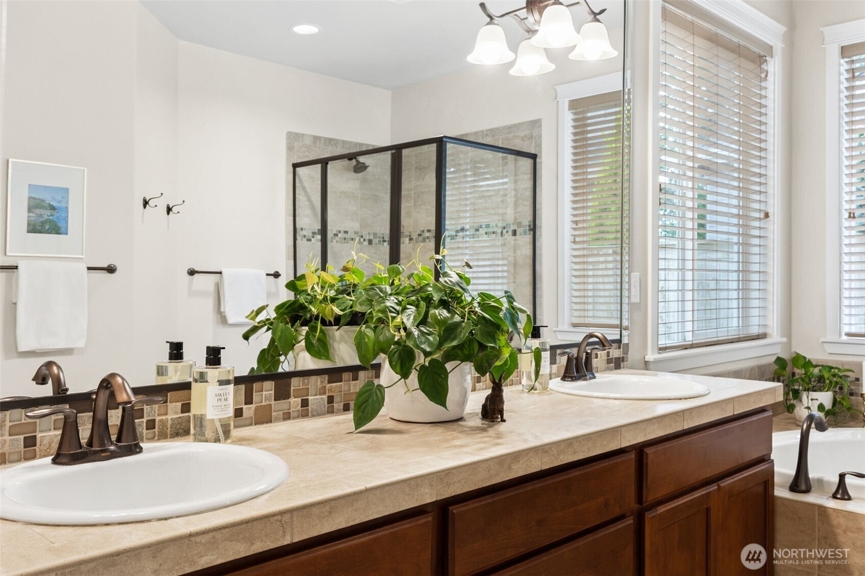 Canyon floorplan • Premium lot on 17th fairway of The Woodlands Golf Course • Main floor living • Wired for 220V EV charger. . . Elegant Canyon floorplan set on the 17th fairway of The Woodlands Golf Course. This well-maintained home offers comfortable main-floor living with open concept design, vaulted ceilings, wood-wrapped windows, and a gas fireplace that anchors the living room with large windows bringing in lots of natural light and framing dramatic golf-course views. The kitchen features quartz countertops, under-cabinet lighting, gas range with double ovens, a walk-in pantry with automatic lighting, and a refrigerator replaced two years ago. Storage under the stairs and quality finishes throughout reflect thoughtful design and care. The primary suite is conveniently located on the main level and includes a private en-suite bath with soaking tub, double sink vanity, and separate shower. Two additional bedrooms are positioned upstairs. Upgrades include wiring for 220V electric vehicle charger, under-cabinet lighting in the laundry room, newer exterior paint completed two years ago, and a sprinkler system. The backyard offers a generous covered patio, bubbler granite fountain, fenced yard, and peaceful golf-course setting. The garage provides a built-in sink, shelving, & workbench. Nearby Amenity List: The Woodlands Golf Course – adjacent Meridian Neighborhood Park – 0.5 mi Wonderwood Park – 0.8 mi I-5 Access – 2.0 mi Hawks Prairie Shopping Center – 2.4 mi