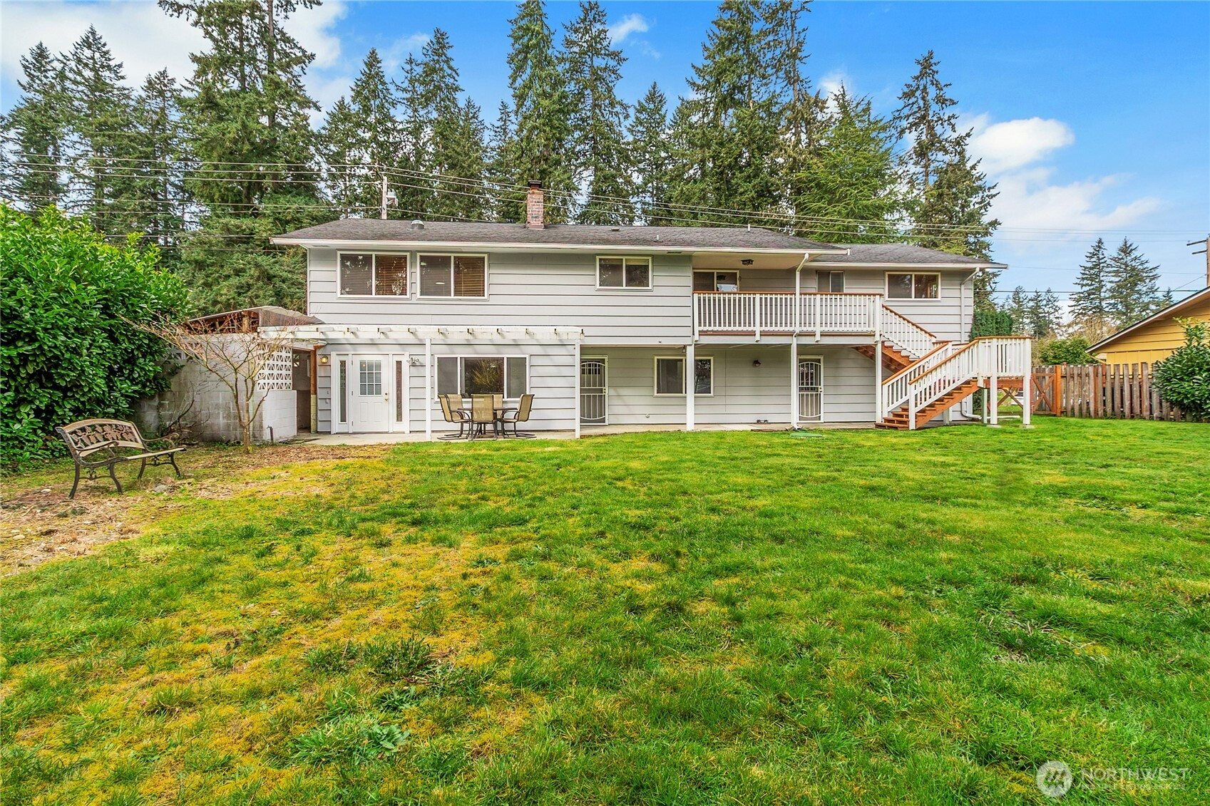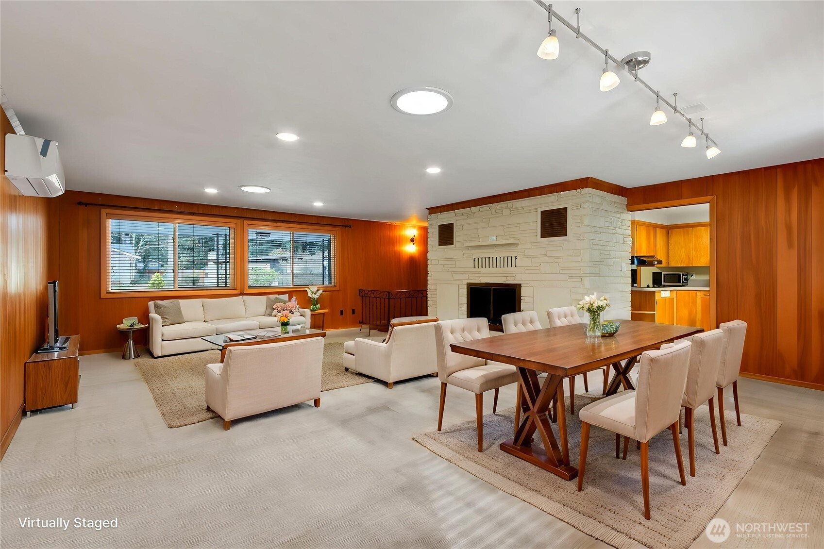 Step into timeless mid-century charm with this beautifully maintained 4-bedroom, 3-bath home offering 2,668 square feet of inviting living space. The main level welcomes you with a spacious, light-filled living room centered around a striking fireplace—complete with a unique electric dumbwaiter for effortless wood delivery. Large windows flood the home with natural light, creating a warm and airy atmosphere throughout. The kitchen features abundant cabinet and counter space, along with an updated double oven—perfect for everyday living and entertaining alike. Just off the kitchen, step onto the deck and enjoy views of the fully fenced backyard, ideal for relaxing or hosting gatherings. Downstairs, the fully finished basement expands your possibilities with a wet bar, tile flooring, and a private patio entrance—making it an excellent option for entertaining, multigenerational living, or potential rental income. Outside, the freshly landscaped front yard with beautiful flagstone adds to the home’s curb appeal. Located just blocks from the community park and pool—with no HOA fees—this home offers both comfort and convenience.
