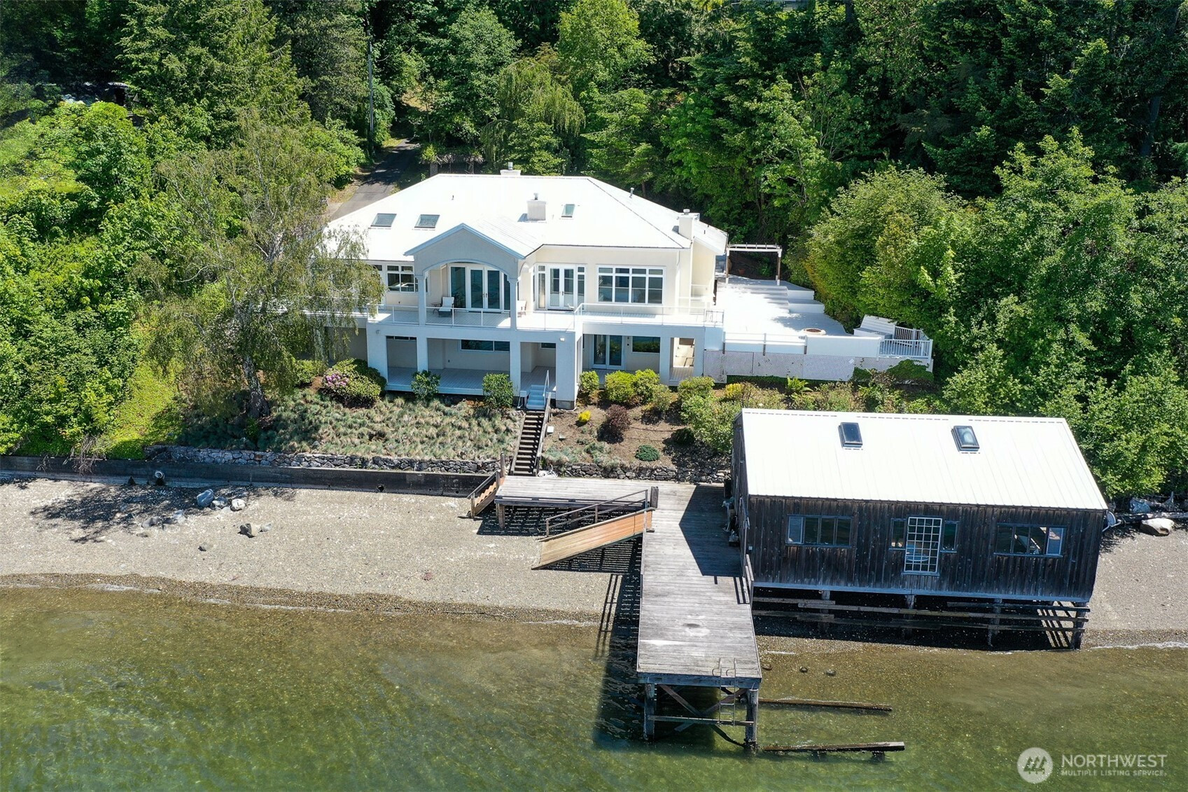 Rare Budd inlet salt waterfront home on 2.5 private acres perfectly located just 4 miles from downtown Olympia & all conveniences. This 4,033 sqft custom home offers a commanding unobstructed view of the Sound and the Olympics from every room. Starting with the grand port-cochè entrance, the home exudes understated elegance: custom furniture designed specifically for this home, primary bedroom w/huge luxurious en suite spa-inspired bath w/elegant soaking tub and expansive glass-enclosed shower & most amazing grand closet, high ceilings with crown molding, 3 fireplaces, including one in the primary bedroom, skylights, walls of windows, it's bright & airy. The main level floor plan allows for one level living for occupants challenged by the stairs. Finished daylight basement features 2 spacious bedrooms, rec room, bath, its own entry and, of course, the view, could easily be converted to separate apartment or be used by friends & paying guests. 1200 sq ft iconic boathouse w/utilities is perfect for hosting grand soirees or intimate sunset dinners. It has even been used as a wedding venue. 3 decks totaling 2,496 sqft, fire pit, outside shower, diving closet, garden space, fruit trees, wired for hot tub, & so much more. With 143 ft of easy access low bank shore, this is one of the widest waterfront lots in the area and an opportunity to witness nature at its finest with regular visits from whales, eagles, and sea otters. No HOA. Offered significantly under assessed value.