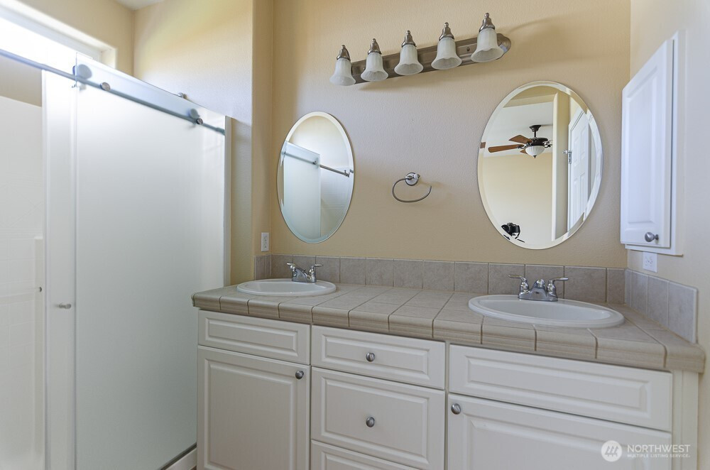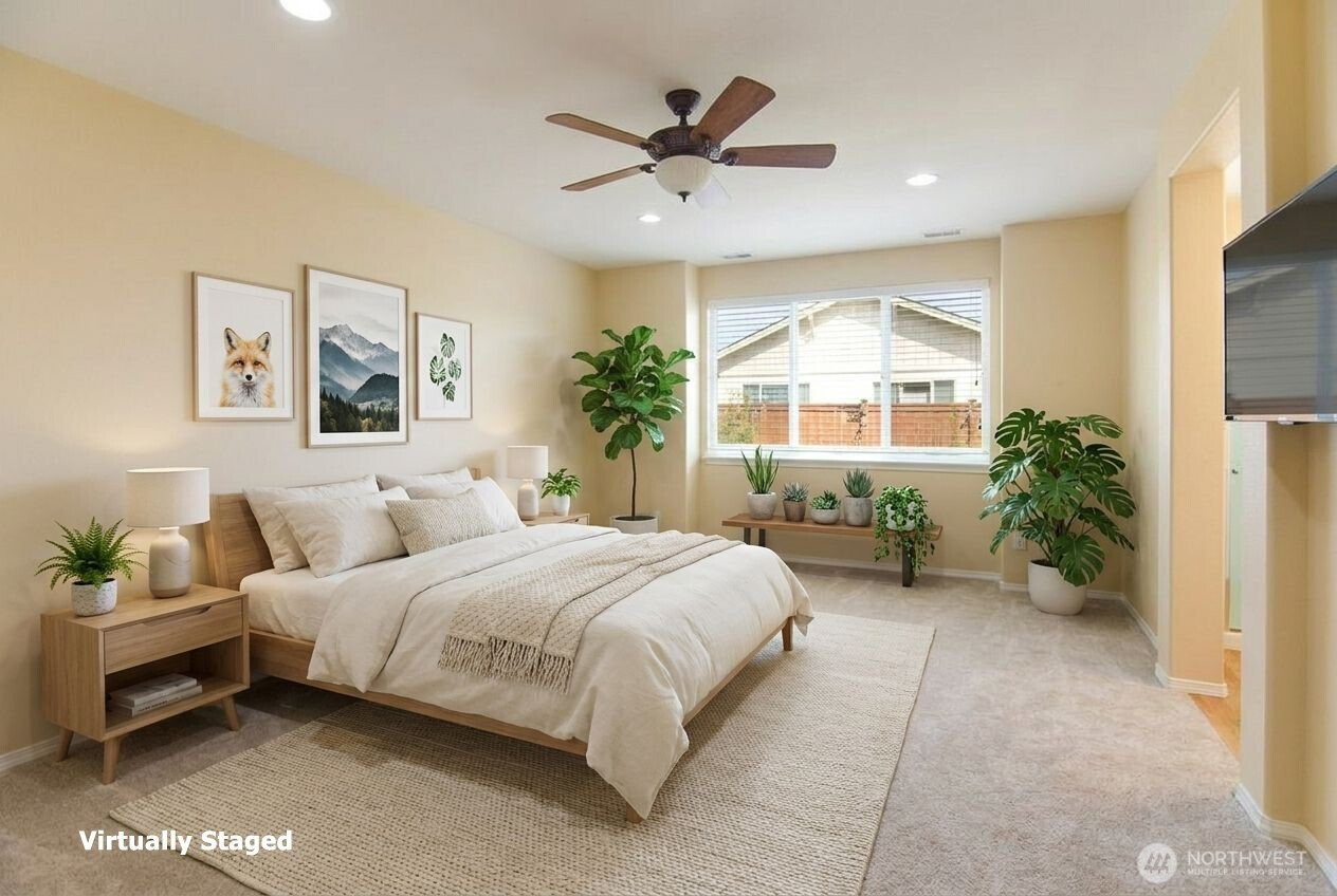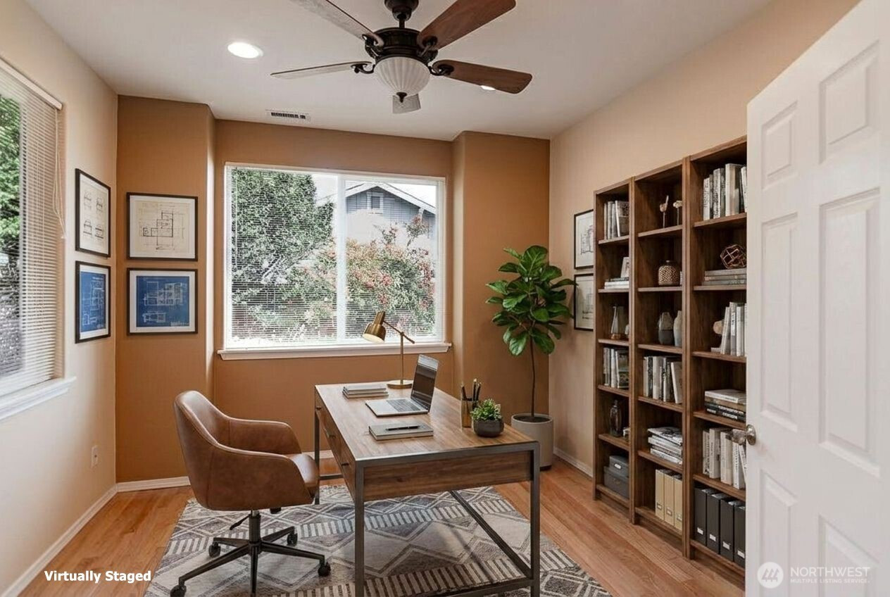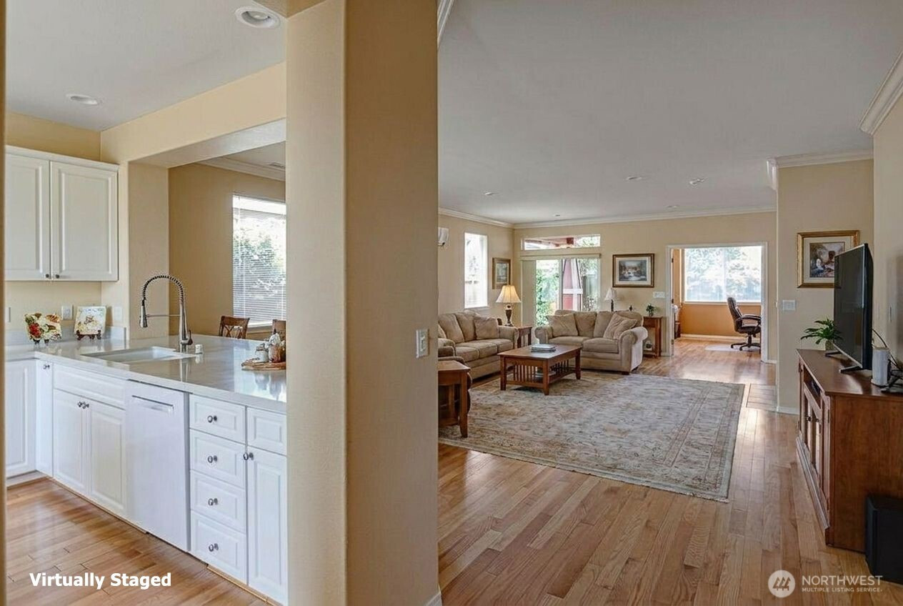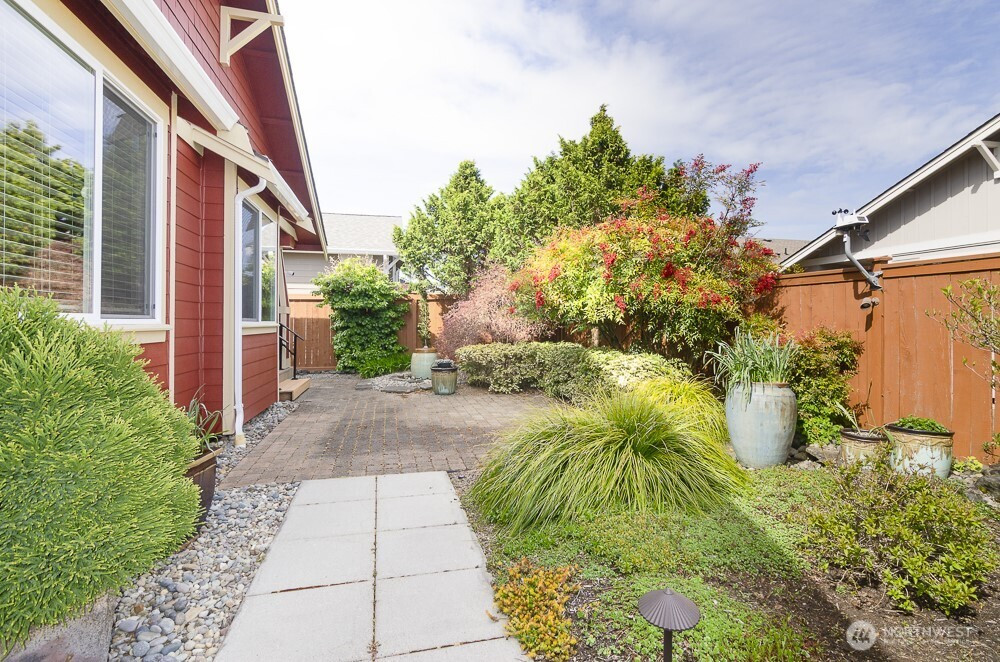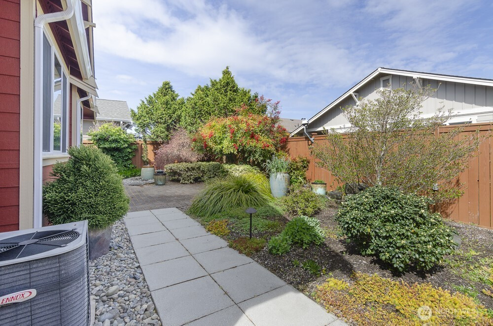 Come see this beautifully maintained, truly turnkey home in the heart of the highly desirable Jubilee 55+ community in Camano Village. Featuring newer solar panels for outstanding energy savings, this light-filled Woodlands model blends comfort, style, & efficiency in one exceptional package. Step inside to discover solid hardwood floors flowing through the main living areas, creating a warm & inviting atmosphere. The spacious kitchen is designed for both everyday living & entertaining, featuring crisp white cabinetry, Silestone countertops, a generous work island with additional storage, & an open breakfast bar adjoining the formal dining area. The welcoming living room offers a cozy gas fireplace, perfect for relaxing evenings. A private den with elegant French doors overlooks the serene backyard retreat, where you'll enjoy a peaceful water feature, extended paved patio, & mature landscaping that creates a private outdoor oasis. The spacious primary suite easily accommodates a sitting area & features an en-suite bath with double sinks, oversized shower, private water closet, & a large walk-in closet with upgraded shelving. A second bedroom & nearby full bath provide comfort & privacy for guests. Brand new carpet in both bedrooms adds a fresh finishing touch. Additional upgrades include a utility room with extra storage cabinets, garage cabinetry, generator wiring for peace of mind, a newer roof, & newer water heater. Residents of Jubilee enjoy resort-style at it's finest.