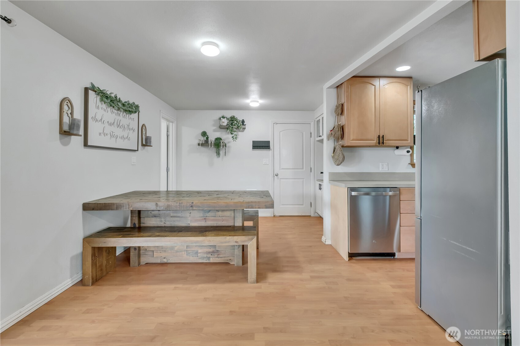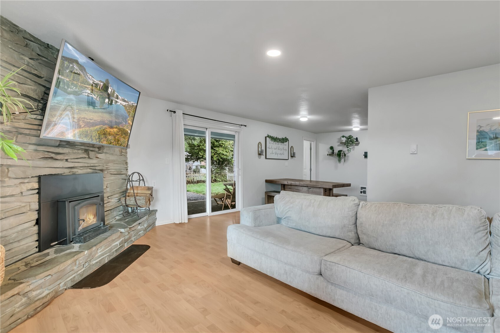 Fully UPDATED rambler on large lot in town! Living room has large fireplace with a wood-stove & laminate floors, with a slider that looks out to the fully fenced backyard. Kitchen offers newer cabinets, all new stainless steel appliances, new counters, a custom-built coffee bar/pantry area, dining space & nearby updated half bath. The 3 bedrooms have original hardwood flooring, & lots of windows for natural light. The full bath is updated with new flooring & an accent wall. This big lot offers lots of parking, including room for an RV or boat, a front deck, covered patio in the back, & 2 great sheds! Washer & dryer can stay. One shed is fully finished with power & water, would be a great home office! No HOA. Permanent lights installed for year round fun. Just shy of a 1/4 acre lot, & conveniently located minutes to town!