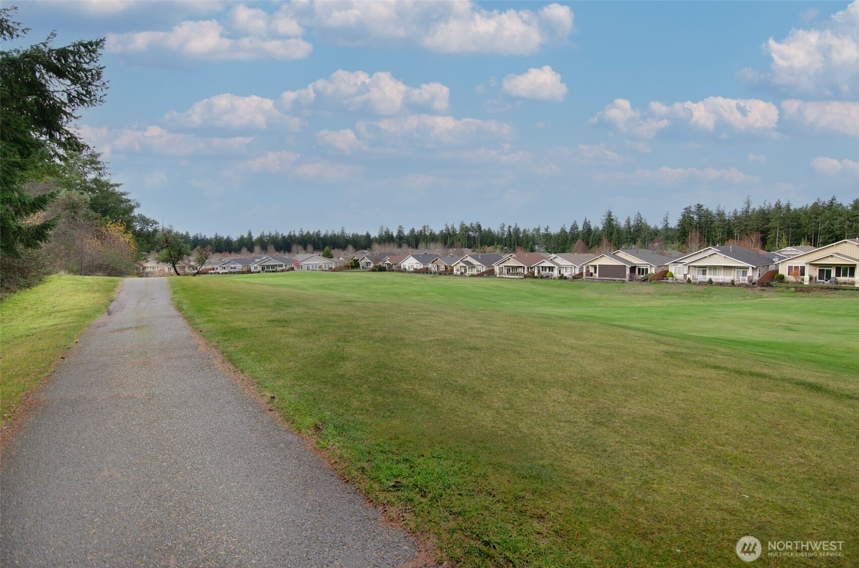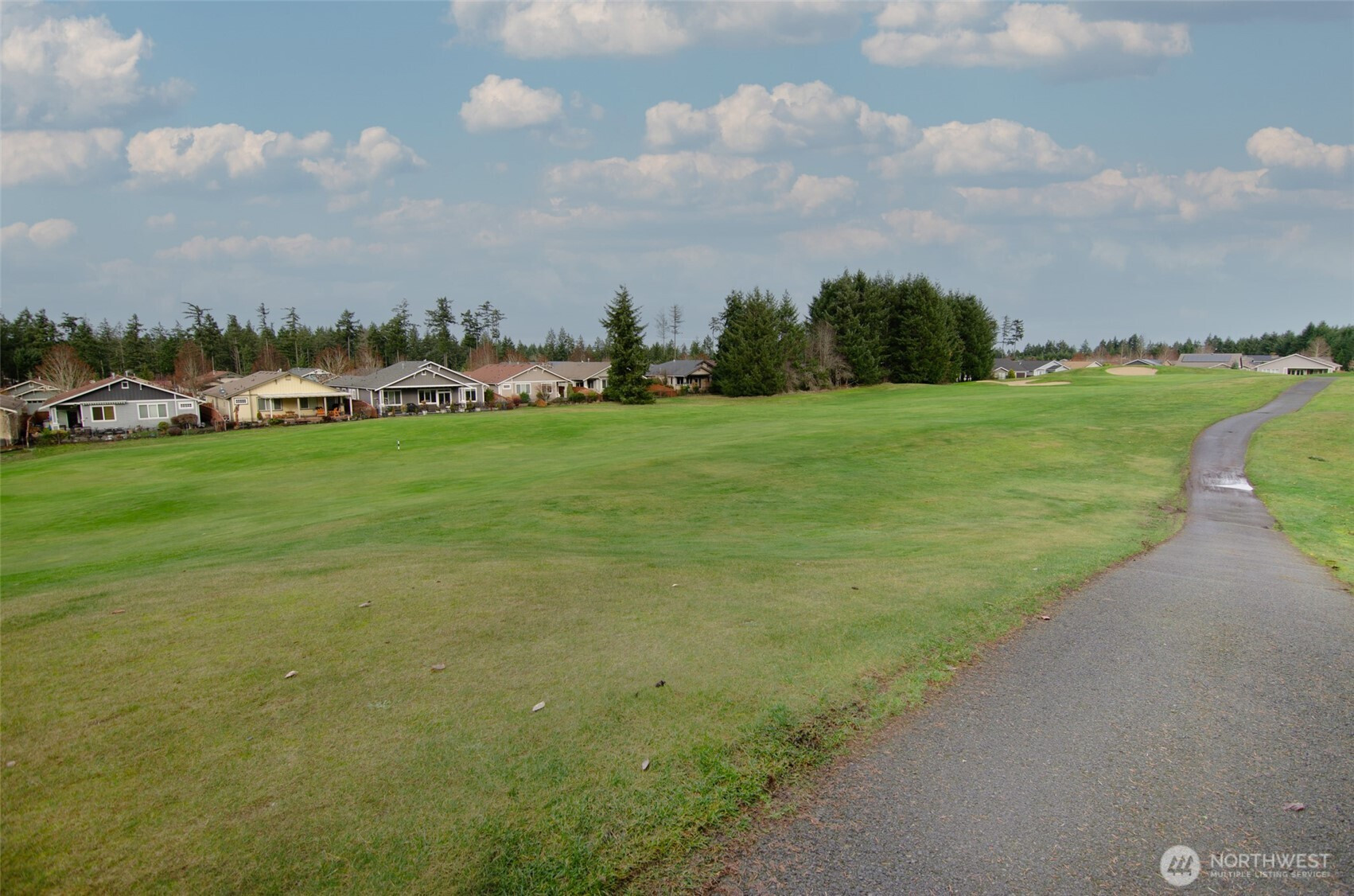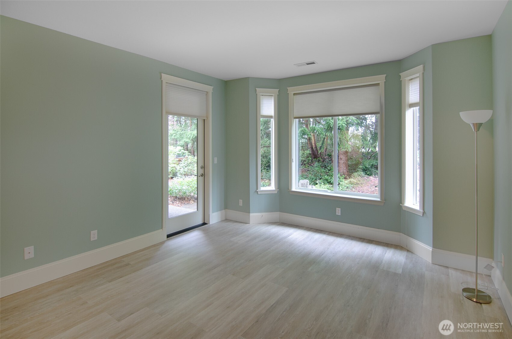 Discover an upgraded Shea-built Bainbridge floor plan positioned to feel at one with nature. This exceptional homesite backs to the Links Golf Course and a well maintained wooded backdrop with mature plantings, a tranquil water feature, extended paved patio, and a covered porch ideal for year-round enjoyment. The open kitchen, dining, and living areas are designed to showcase the views, featuring a gas fireplace with built-in shelving and a massive kitchen island offering added storage. A private den and an open dining area with skylights provide flexibility and natural light. The serene primary suite includes a large bay window and direct access to the covered patio. Brand-new vinyl plank floors. Solar panels offer energy savings.