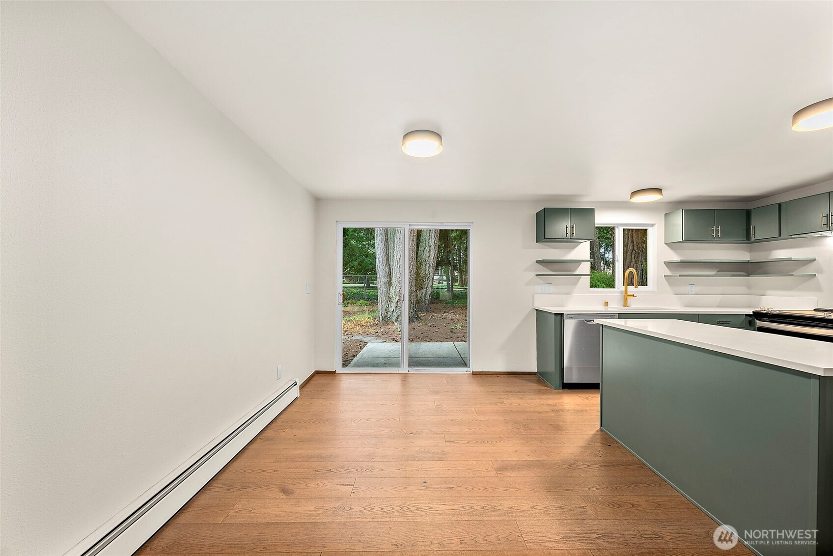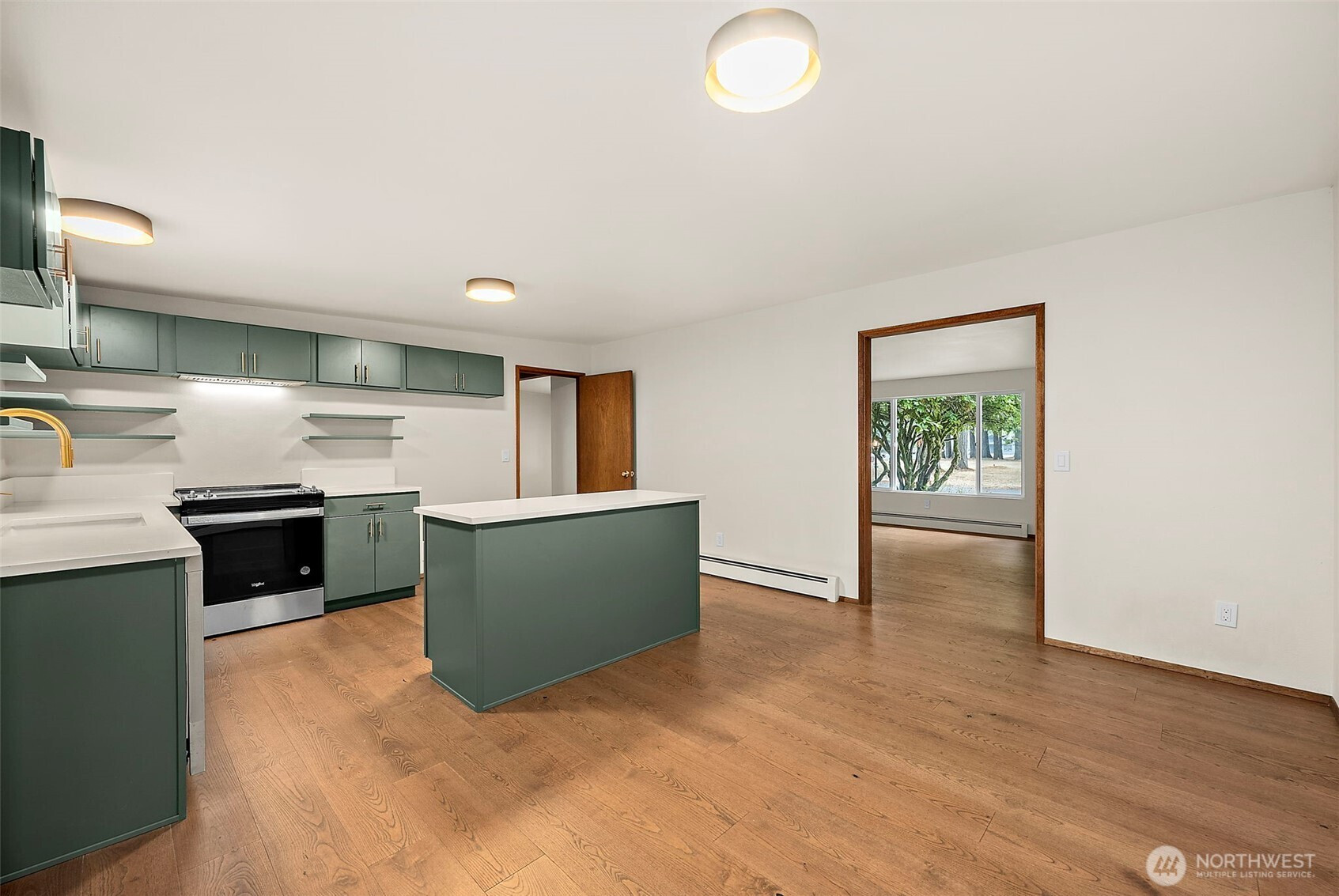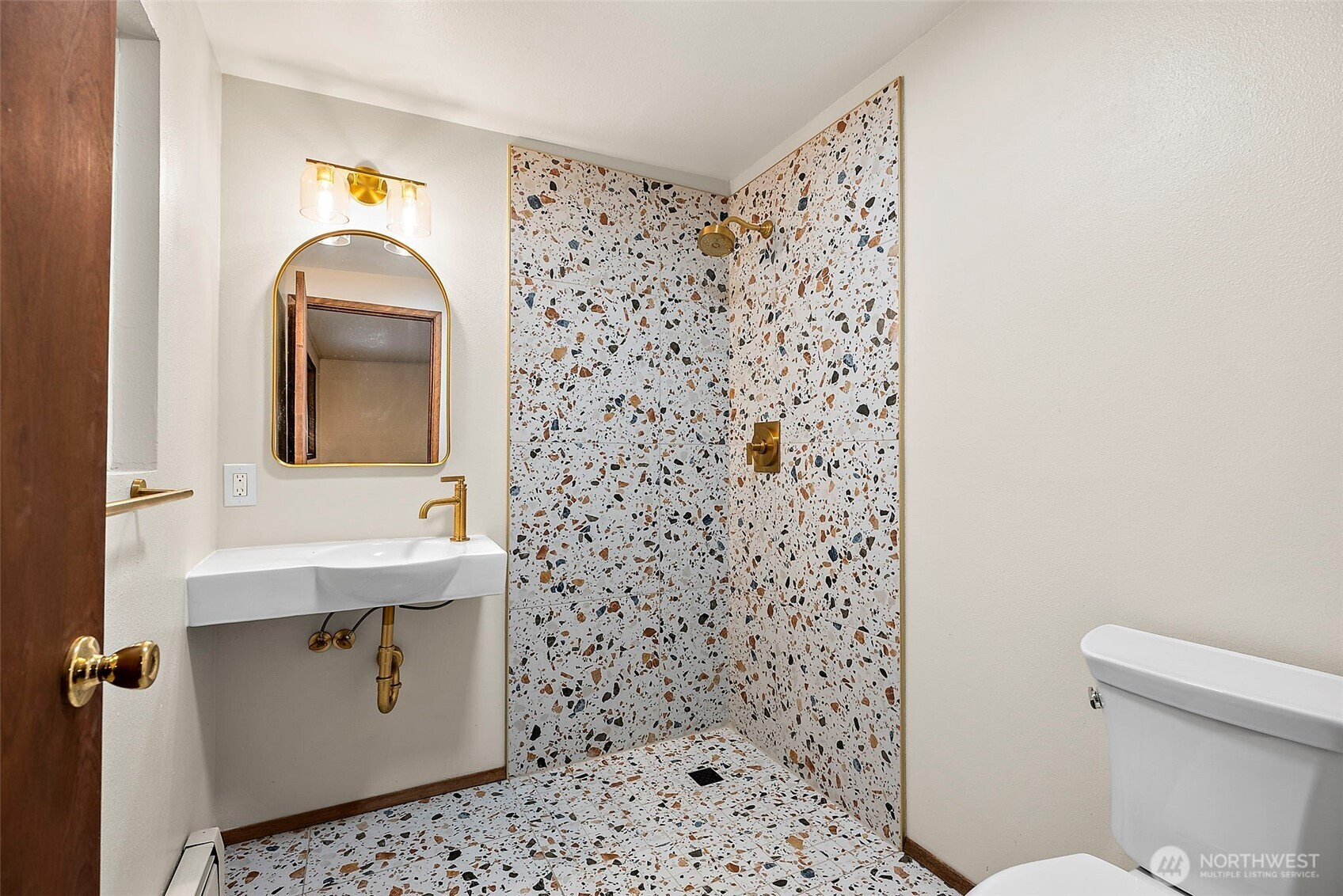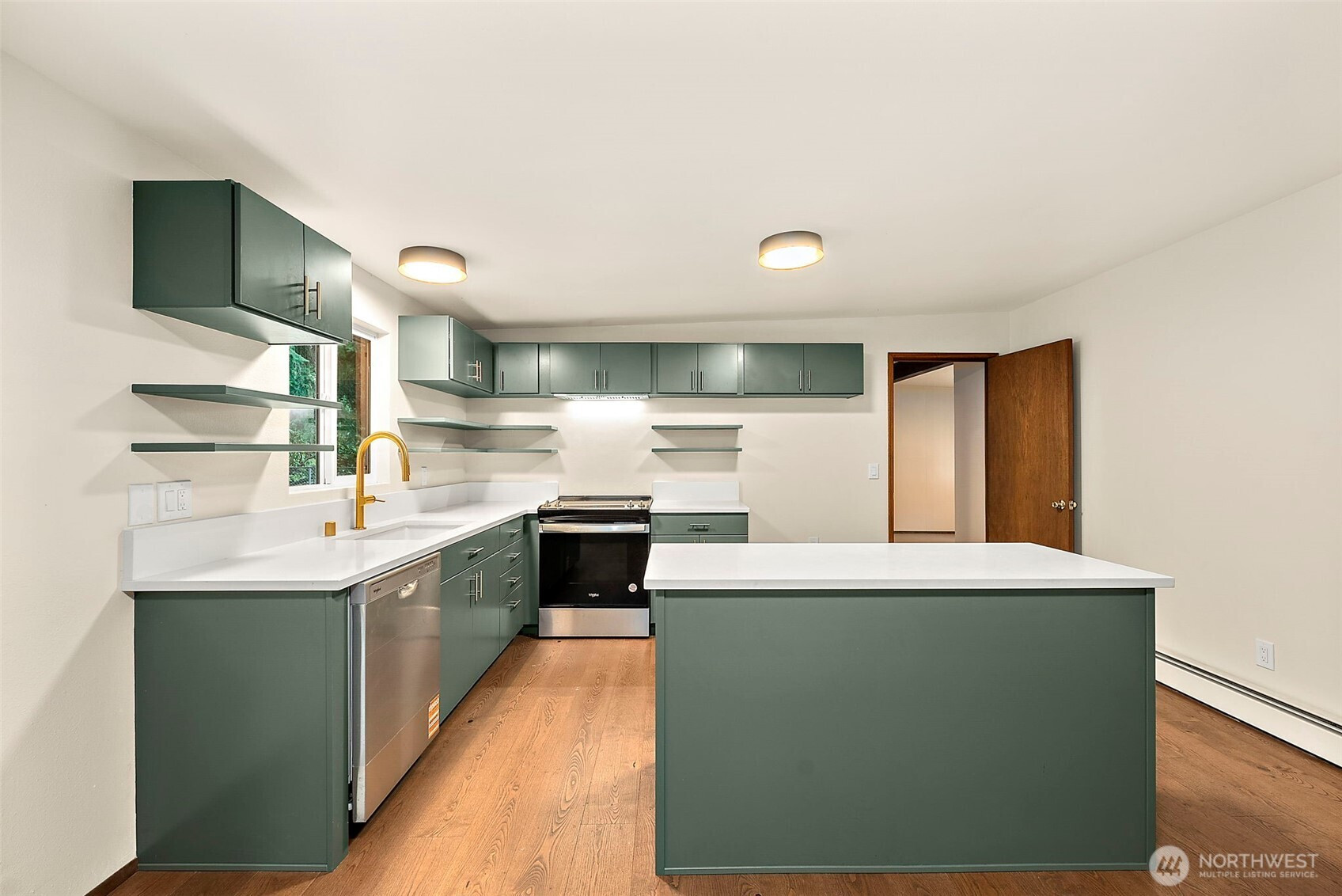 Elegantly updated rambler featuring 3 bedrooms, 1.75 baths, and a spacious den or home office. With 1,575 sq ft, a 1-car garage, RV parking, and no HOA dues, this home offers both style and convenience. Upgrades include engineered hardwood flooring, new carpet, designer terrazzo tile in both baths, and a chef’s kitchen with quartz countertops, farmhouse sink, island and hidden hood vent. The primary bath features a beautifully tiled, curbless walk-in shower.  The heating is by radiant water heat (Hydronic baseboard heater- extremely safe). Fresh paint, updated lighting, new ceilings, and code-compliant electrical throughout. Set on a large, fully fenced lot in a desirable location—this move-in ready gem is not to be missed.