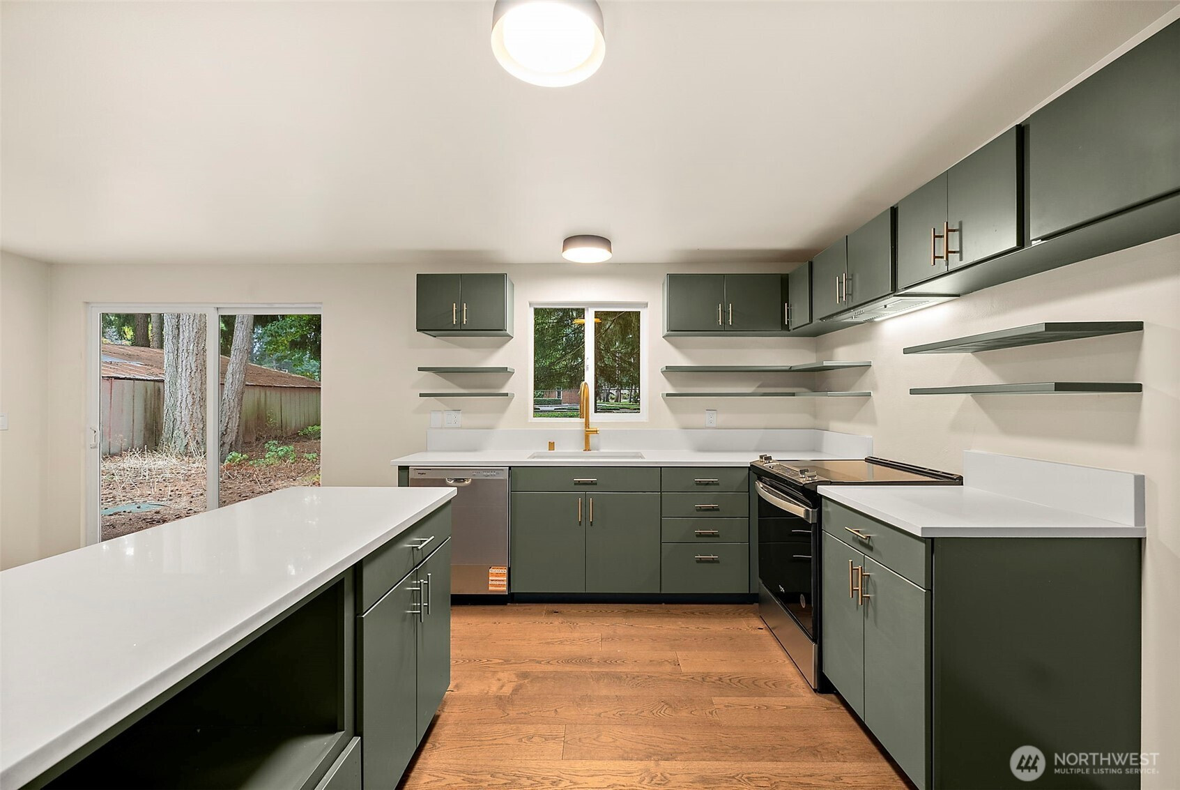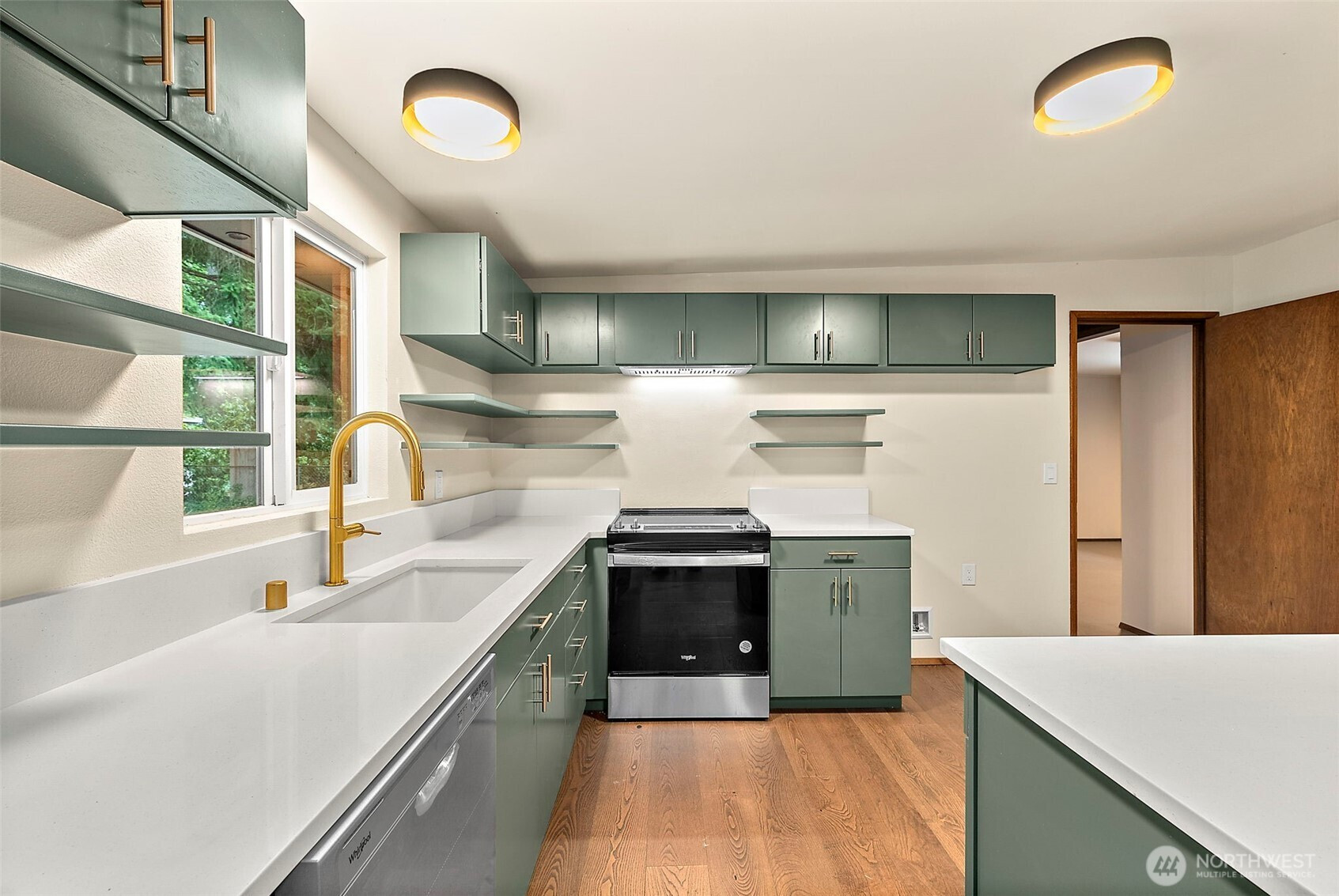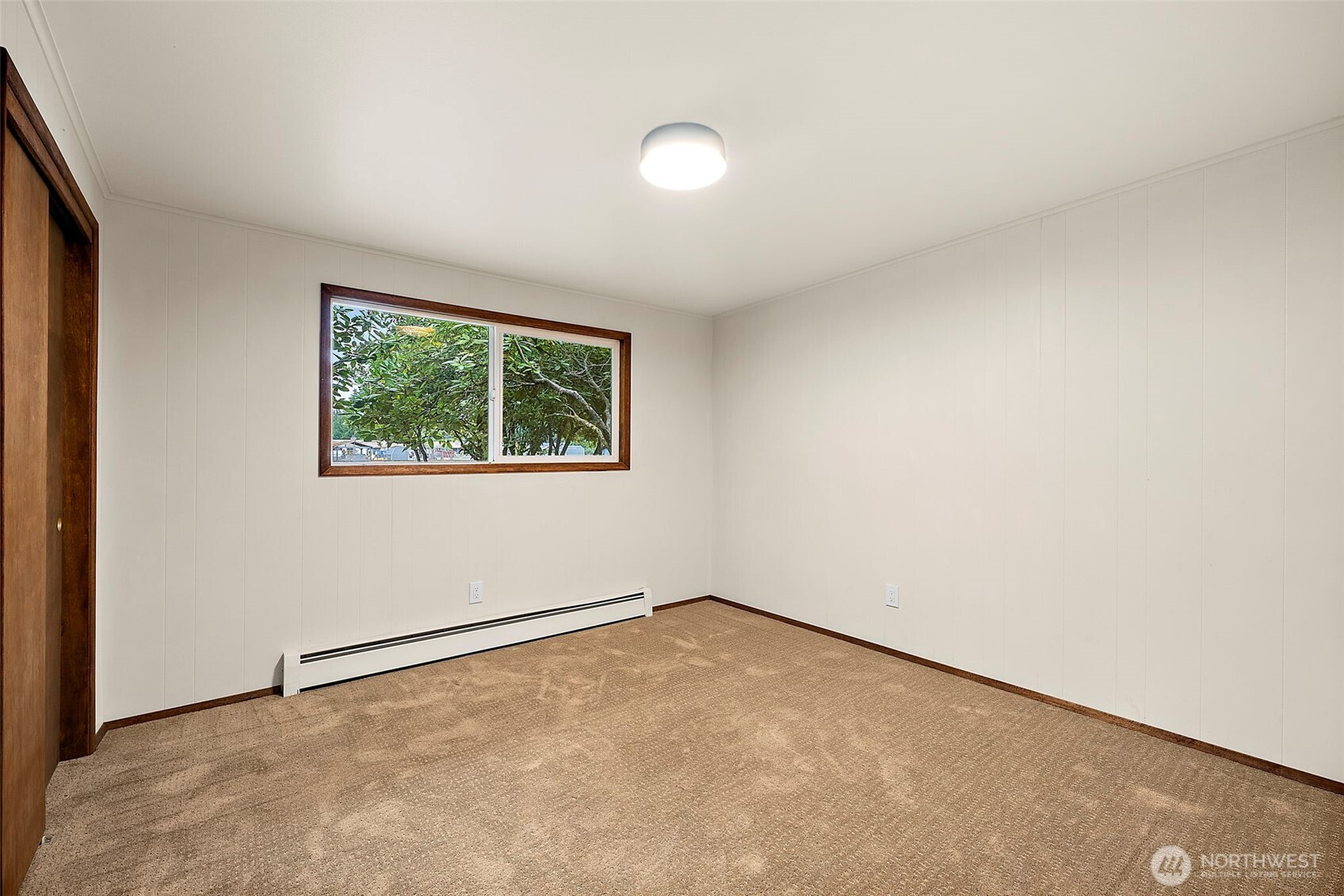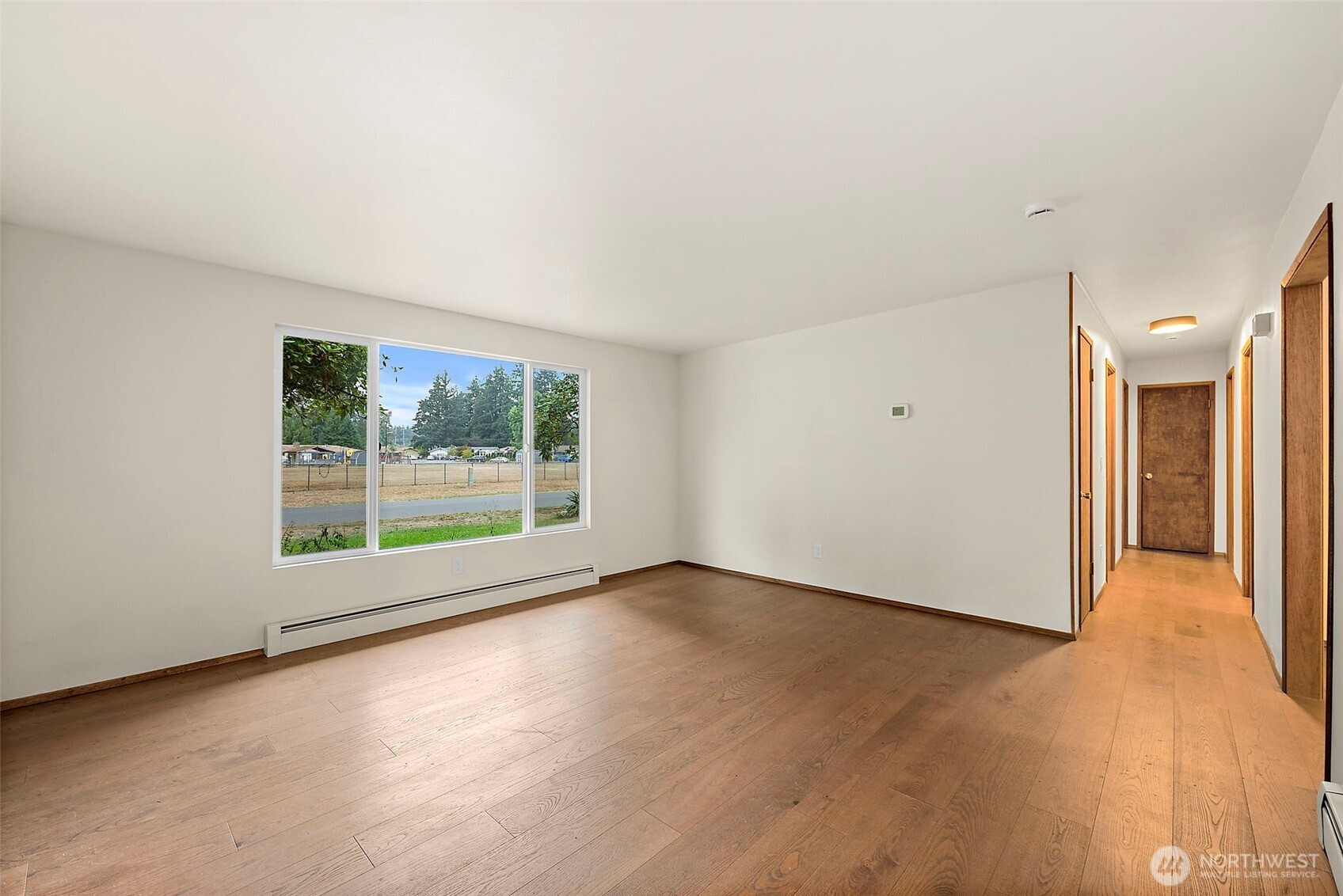 Elegantly updated rambler featuring 3 bedrooms, 1.75 baths, and a spacious den or home office. With 1,575 sq ft, a 1-car garage, RV parking, and no HOA dues, this home offers both style and convenience. Upgrades include engineered hardwood flooring, new carpet, designer terrazzo tile in both baths, and a chef’s kitchen with quartz countertops, farmhouse sink, island and hidden hood vent. The primary bath features a beautifully tiled, curbless walk-in shower.  The heating is by radiant water heat (Hydronic baseboard heater- extremely safe). Fresh paint, updated lighting, new ceilings, and code-compliant electrical throughout. Set on a large, fully fenced lot in a desirable location—this move-in ready gem is not to be missed.