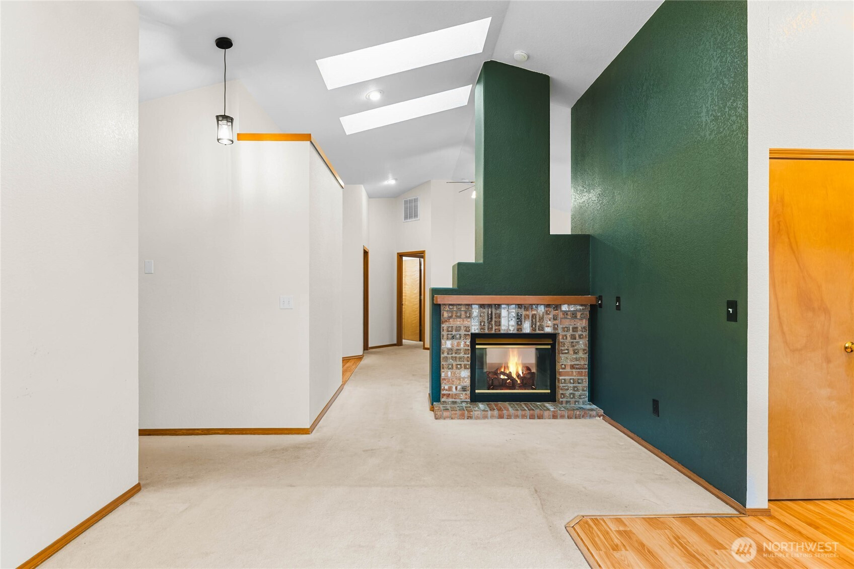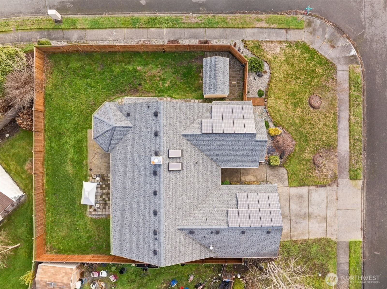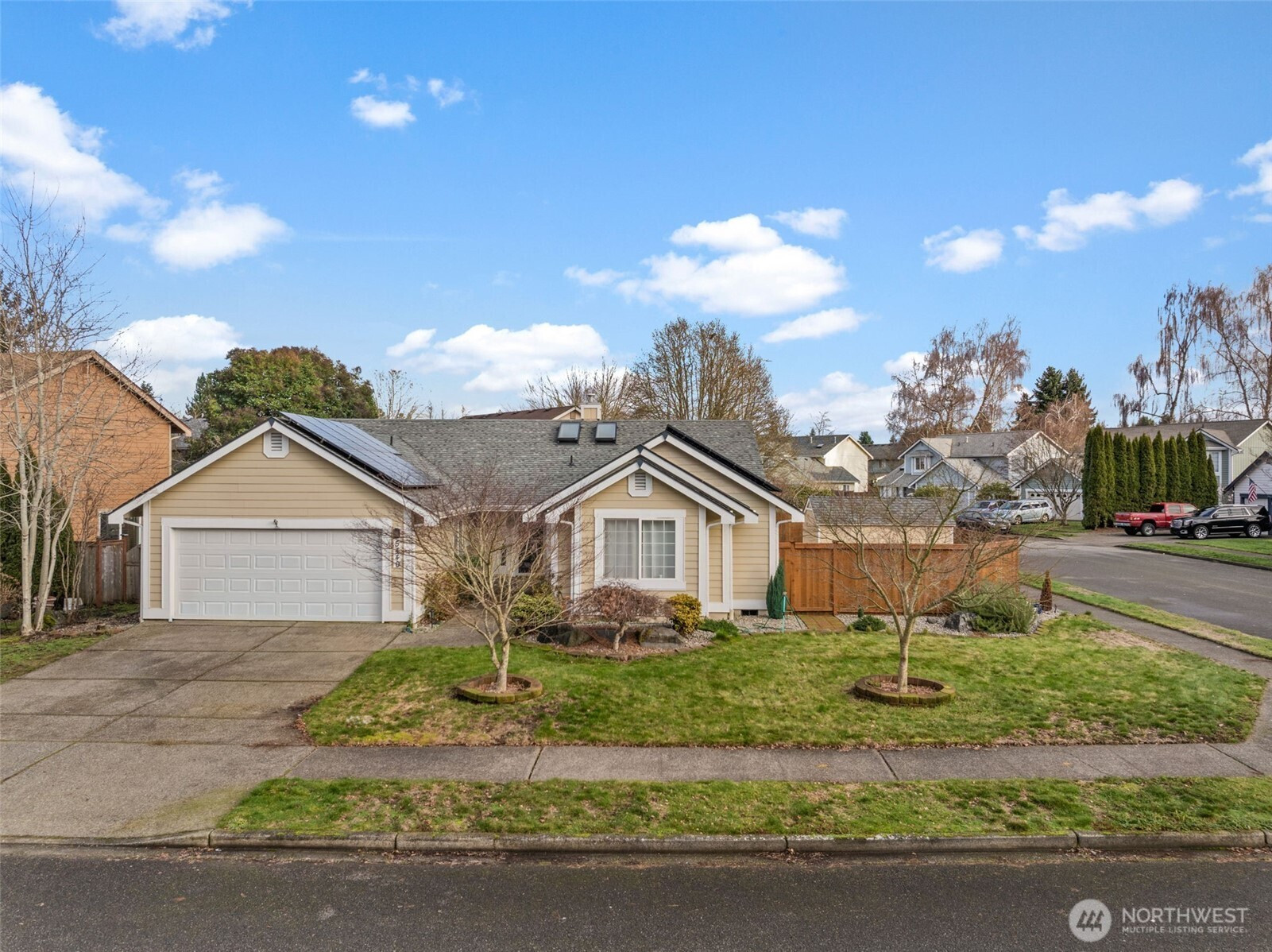 Welcome home to this Lacey rambler in the highly sought-after Park Place community! This beauty comes equipped with solar panels and a large fully fenced yard with a shed and a patio that's perfect for enjoying in the warm summer months! As you enter the home, you can't help but notice the vaulted ceilings with skylights, which ushers in tons of natural light! The double-sided, see-through fireplace is convenient for the winter months as it's central to the living and eating space. This home's kitchen is updated with stylish cabinets, a gas stove, an overhang with room for barstools, and a nice-sized pantry! The favorable split-bedroom floor plan offers a spacious primary suite with walk-in closet and a 5-piece bath complete with garden tub, water closet, and abundant counter and cabinet space. Solar panels plus generator-ready setup add efficiency and peace of mind. Just minutes from Rainier Vista Park with walking trails, recreation, and Mt. Rainier views. Close to shopping, dining, and commuting routes—this location, neighborhood, and home check all the boxes. This home is move in ready and close to JBLM. Do not miss out!