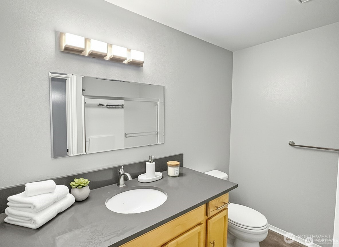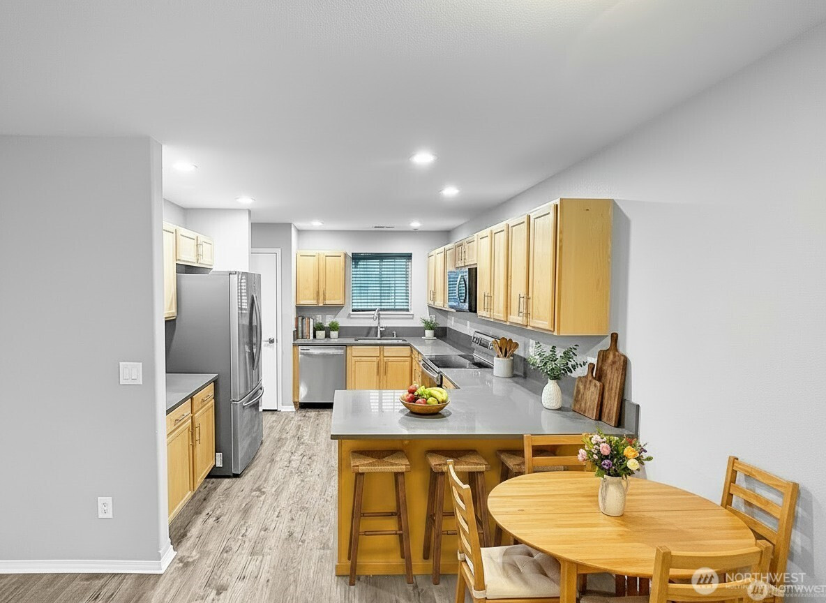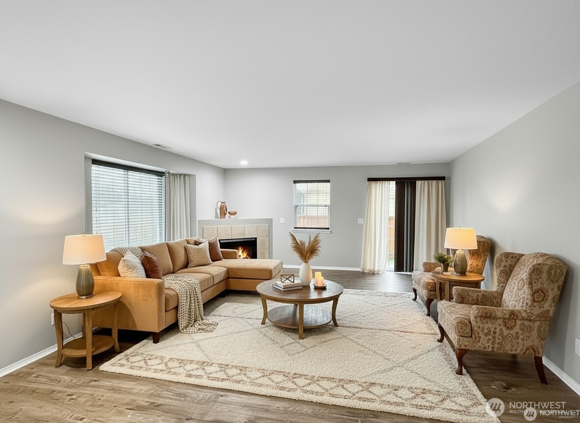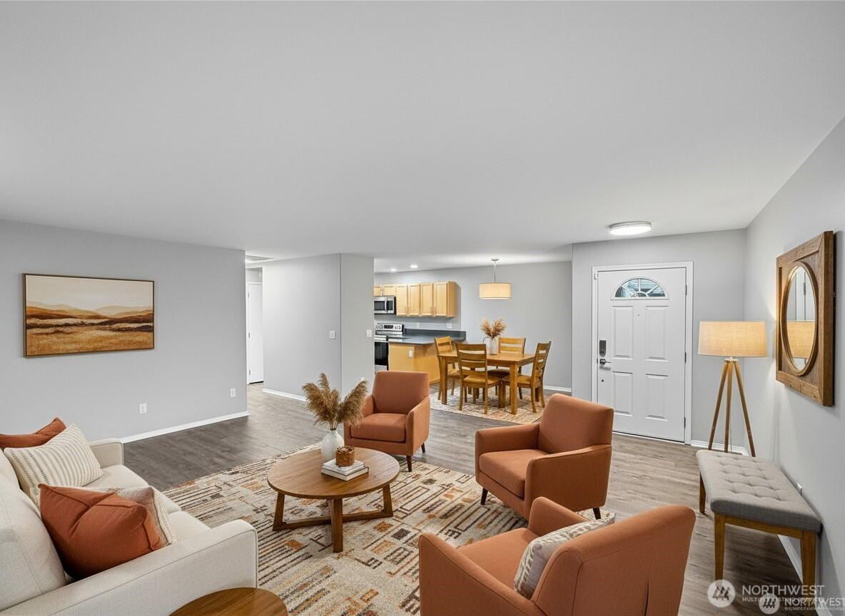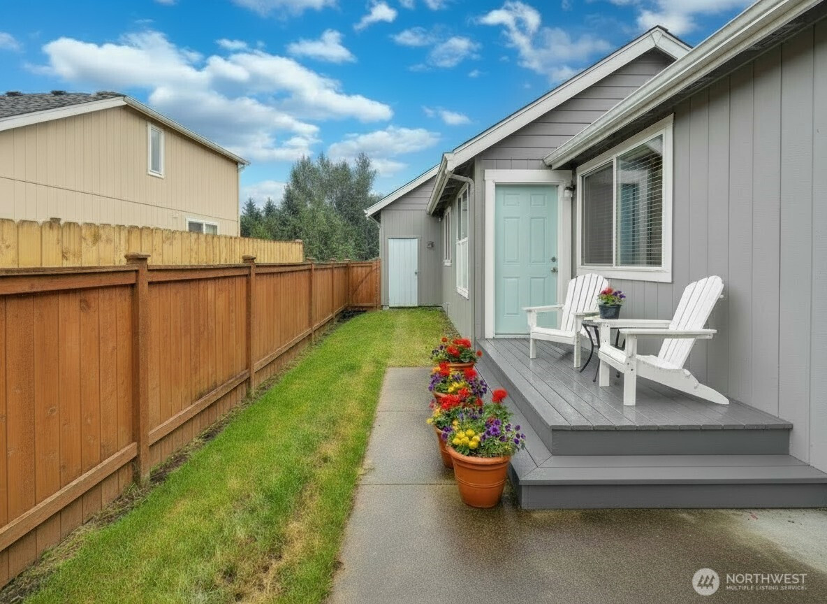 Welcome home to this super cute and cozy rambler off Yelm Hwy and close to all amenities. Open your door to a large Living Room with FP and Sliding Glass door to side yard. All trim molding in house has been redone, touch up paint to all walls, front deck, side deck and railings have all been painted as well as the side fence. Two new doors and locks will be put on the back bedroom and bathroom door (4/21) so truly turn key! All windows have Levolor Blinds for privacy. Make sure to hit light switches once for a dimmer and again for a full light. Vinyl Flooring on all living areas. Dining Room and Kitchen are open with eating bar between. Kitchen has quartz countertops with SS appliances (included), lots of cabinet space and picture window above the sink. Primary has double doors to enter and large walk-in closet and bathroom. Primary also has door which leads to side yard as well. Laundry room has above washer and dryer cabinets, and W/D convey. Bathroom and 2nd bedroom at the end of the hall rounds out this great home. Large two car garage and side yard and front are fenced. Super cute home and ready or you! Carpet allowance for bedrooms also included!