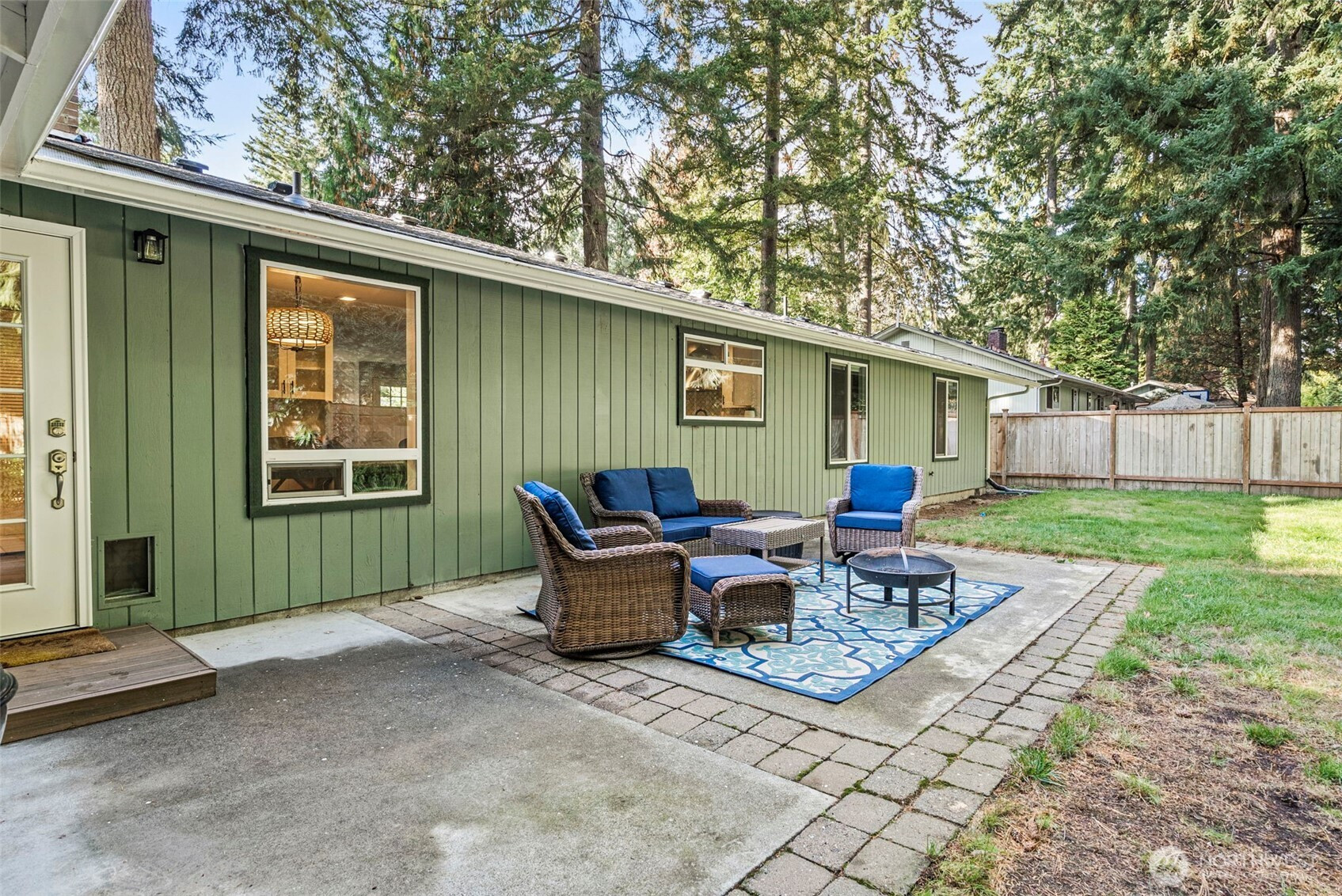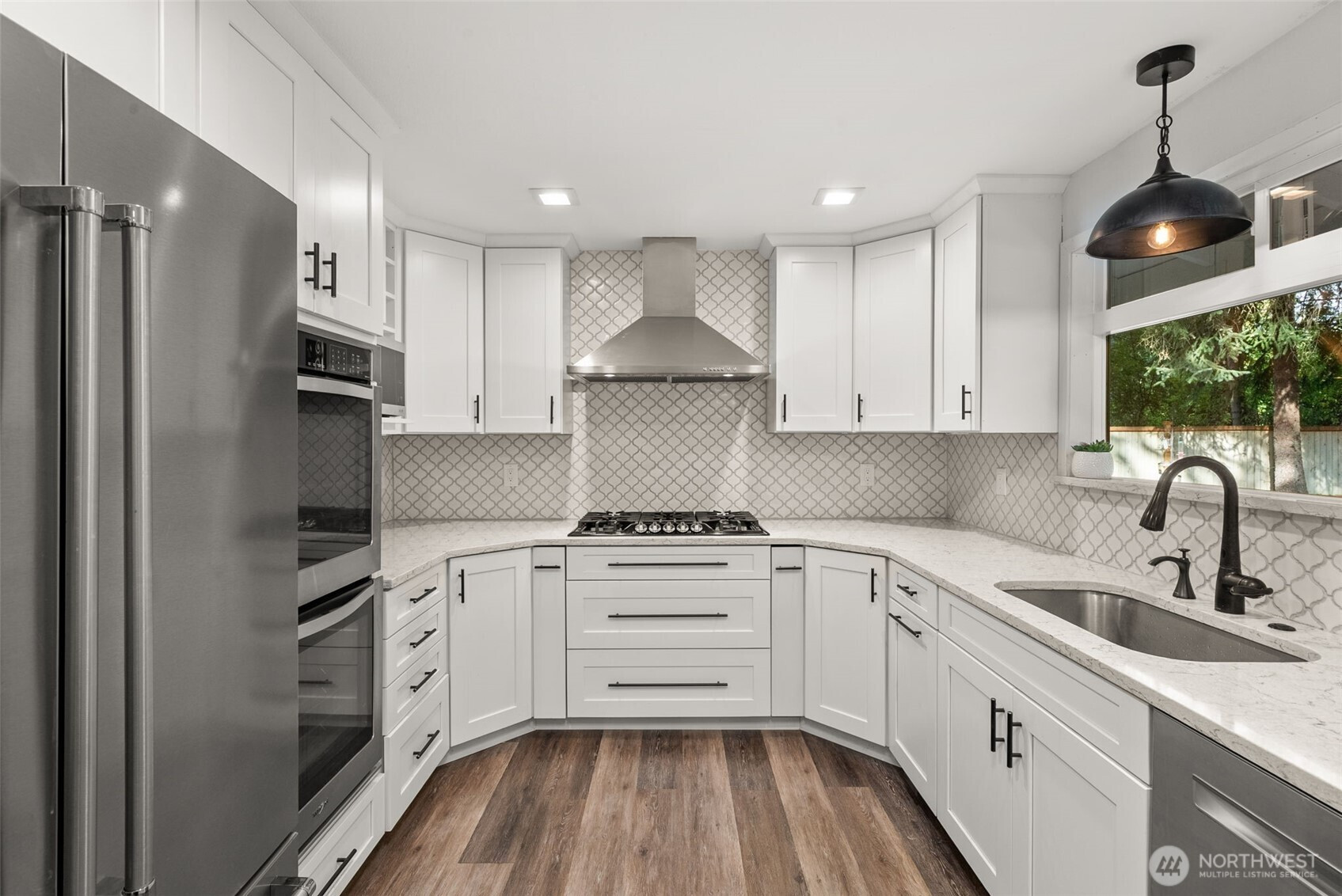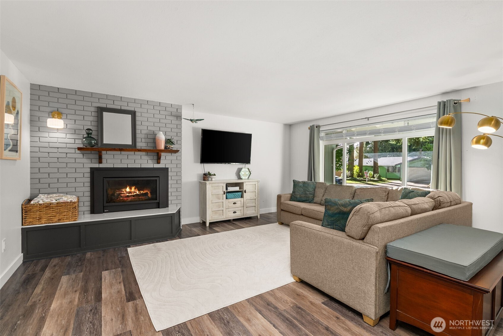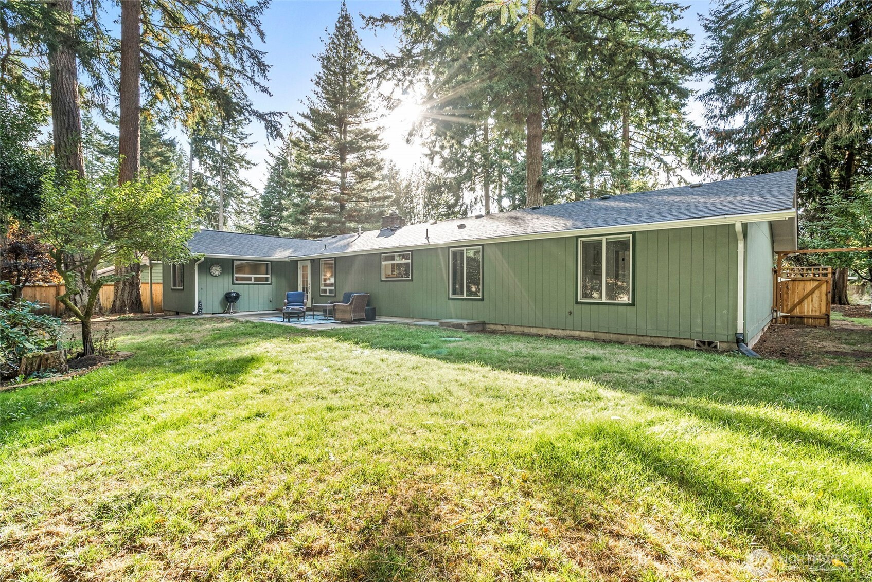 Stylishly remodeled turn-key rambler leaves little to be desired! Stunning kitchen features custom cabinetry, quartz countertops, tiled backsplash, stainless appliances and a convenient built-in buffet bar in dining area. Large primary suite w/walk-in closet and beautiful tile shower w/glass surround. Flexible over-sized bonus room can be used as an office, rec room or a guest suite w/adjacent ¾ bath. Generous ¼ acre lot w/fenced backyard that backs up to a greenbelt offers privacy and room to play. Well-equipped 2 car garage has a workbench, built in shelving, sink and additional storage bay. Nestled in the quiet Woodsmuir neighborhood among mature evergreens, this home provides easy access to LBA park, schools, trails and amenities.