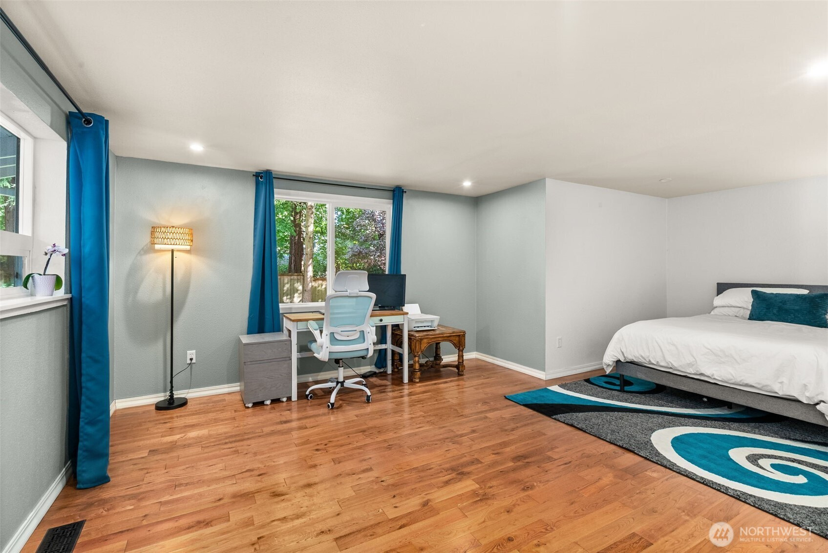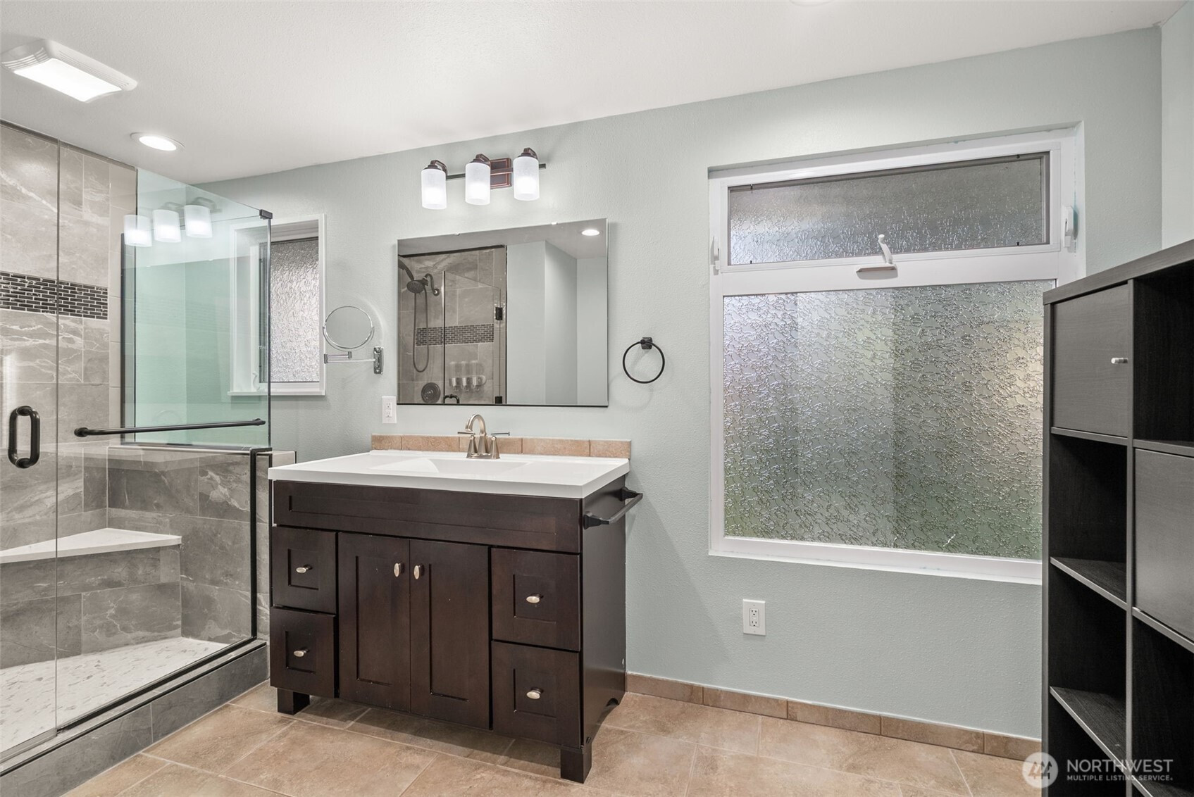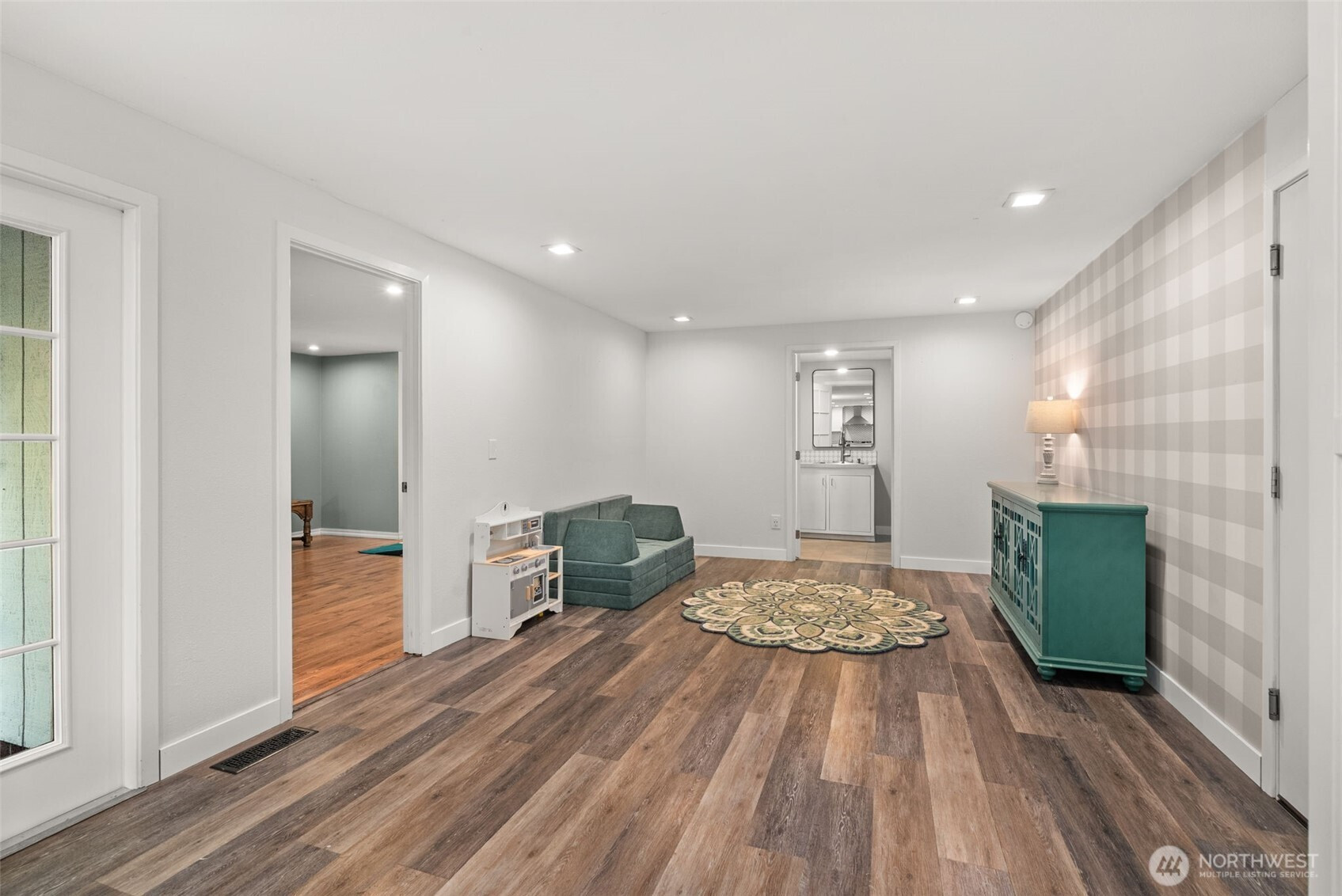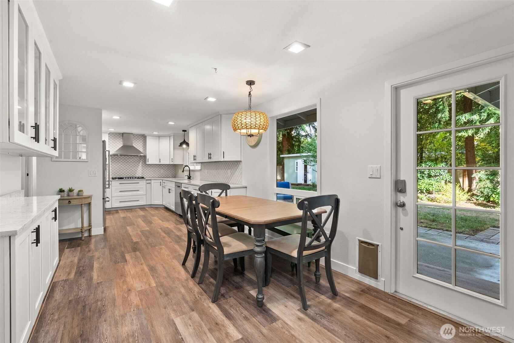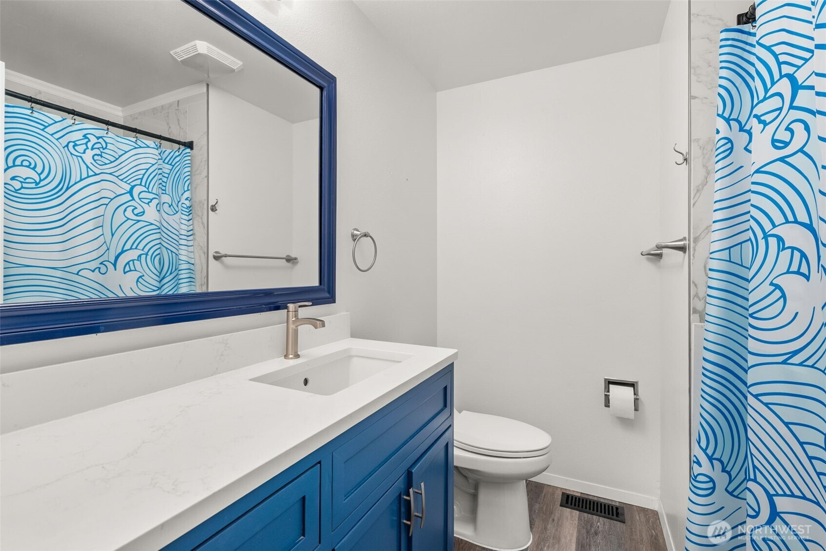 Stylishly remodeled turn-key rambler leaves little to be desired! Stunning kitchen features custom cabinetry, quartz countertops, tiled backsplash, stainless appliances and a convenient built-in buffet bar in dining area. Large primary suite w/walk-in closet and beautiful tile shower w/glass surround. Flexible over-sized bonus room can be used as an office, rec room or a guest suite w/adjacent ¾ bath. Generous ¼ acre lot w/fenced backyard that backs up to a greenbelt offers privacy and room to play. Well-equipped 2 car garage has a workbench, built in shelving, sink and additional storage bay. Nestled in the quiet Woodsmuir neighborhood among mature evergreens, this home provides easy access to LBA park, schools, trails and amenities.