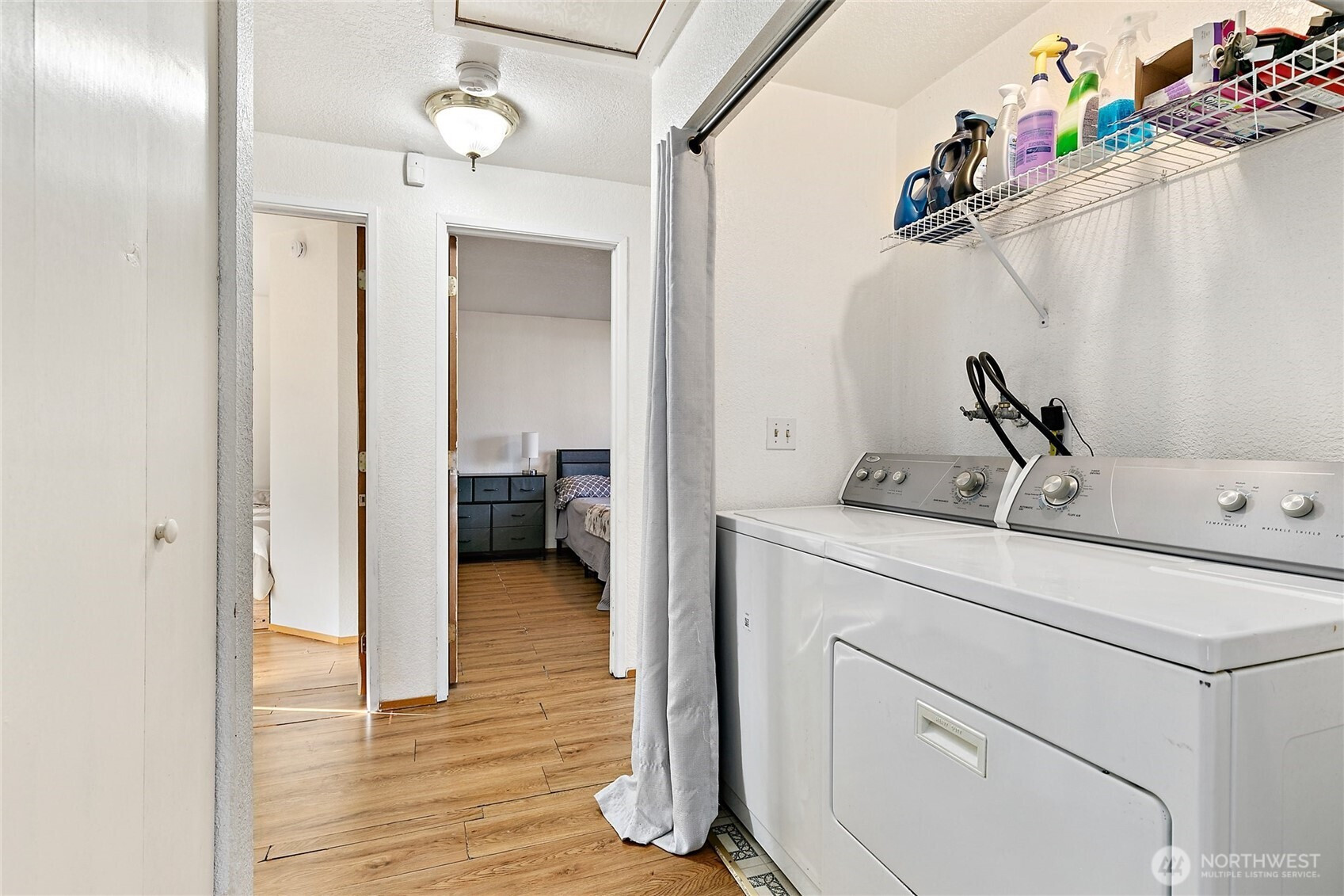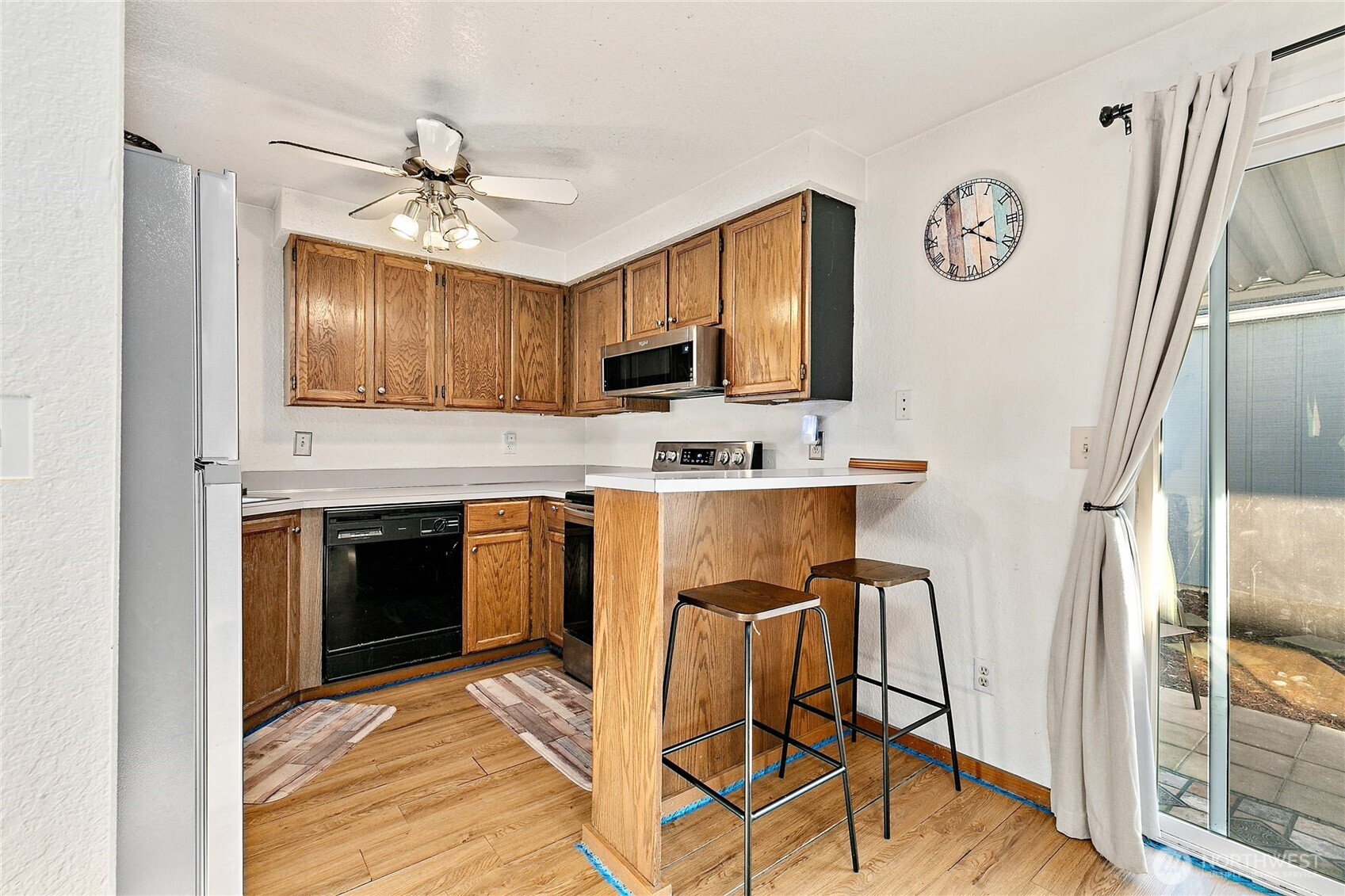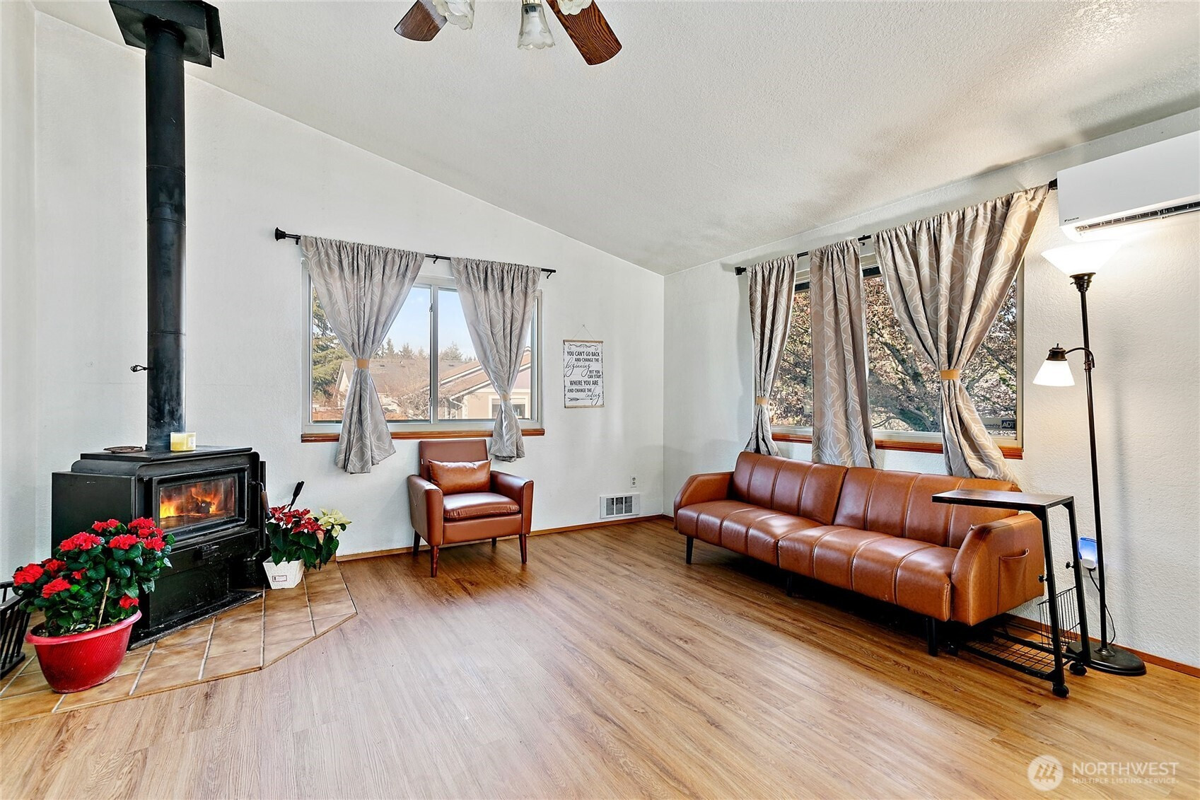 This charming home offers a comfortable, efficient layout with Energy Star heating and cooling. It features 3 bedrooms, 1 full bathroom, and a welcoming living room with a wood-burning stove and vaulted ceilings. The kitchen includes an eat-in area and has been updated with a new fridge, stove, smart microwave, and smart lock. A spacious walk-up attic provides extra storage or flex space. Enjoy the low-maintenance yard and covered back patio. Updates include a new heat pump, freshly painted exterior, new siding, improved retaining wall, and a transferable warranty. Corner lot close to I-5, shopping, JBLM, and Meadows Elementary.
