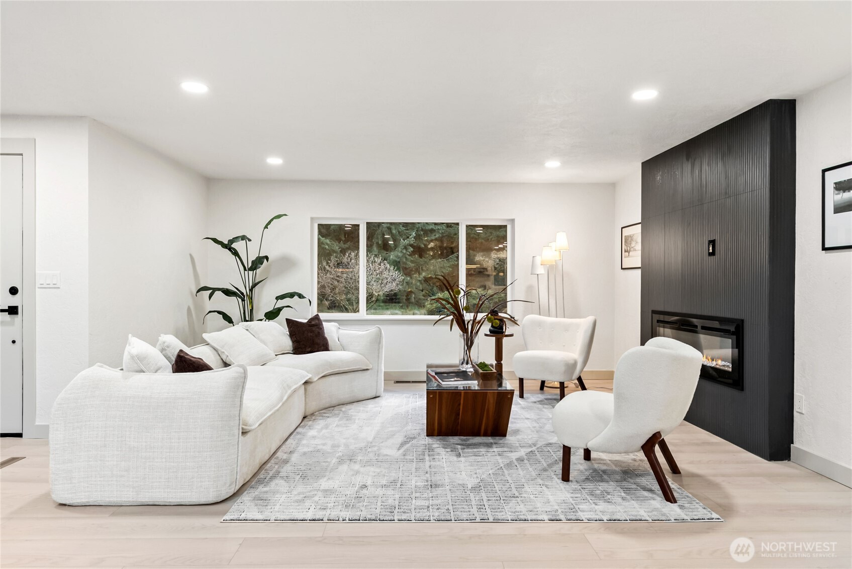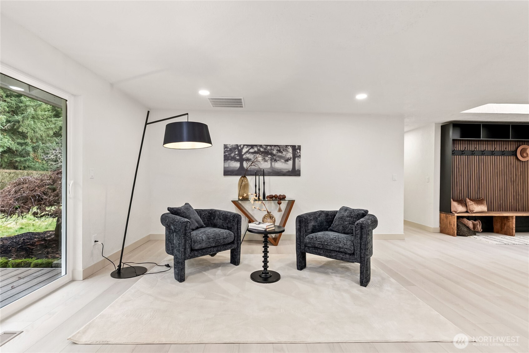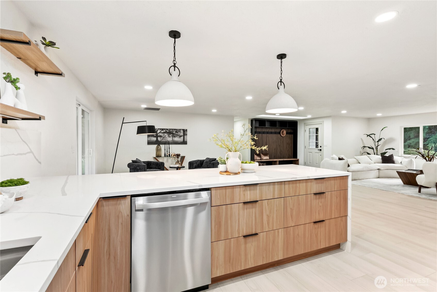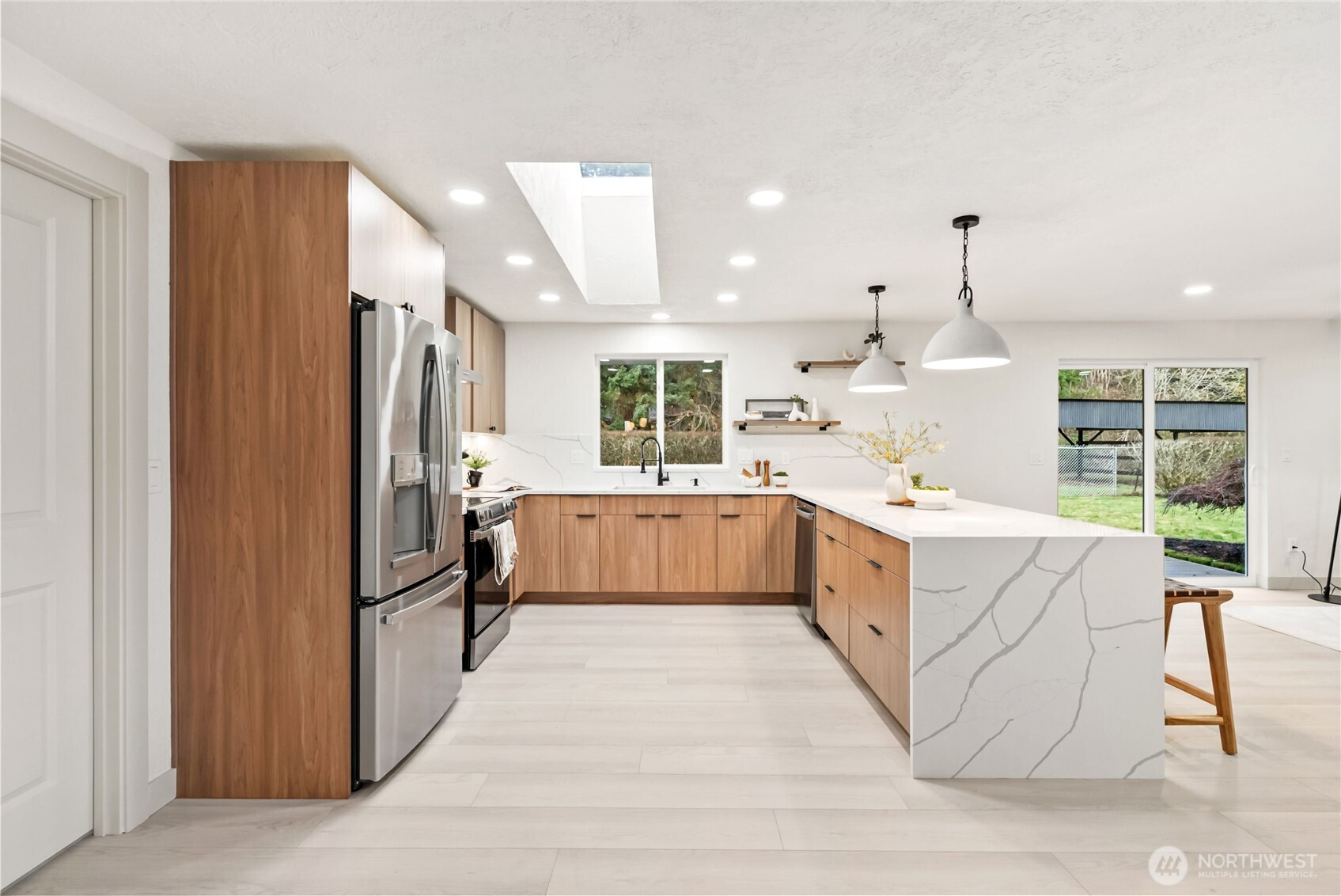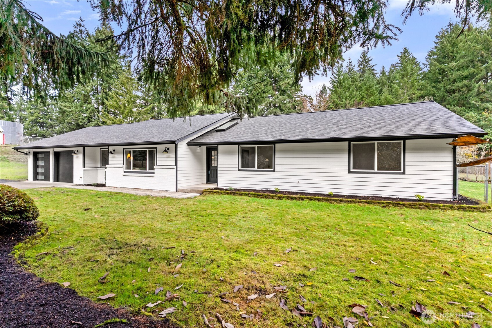 Rare opportunity to own over 2 private acres in desirable Olympia, featuring a beautifully updated farmhouse-style rambler designed for comfort and effortless living. This single-story 4-bedroom, 3-bath home truly checks every box. Thoughtfully upgraded with a new roof, heat pump, and sprinkler system, the property offers peace of mind along with exceptional functionality. A spacious 3-car garage plus an additional garage for lawn equipment provides abundant parking and storage for all your needs. Inside, the open-concept layout is warm and inviting. Enjoy both a generous family room and living room centered around a cozy electric fireplace, plus a formal dining room perfect for gatherings. The custom kitchen is a standout, showcasing soft-close cabinetry, stainless steel appliances, a waterfall-edge island, and a skylight that fills the space with natural light. The well-appointed laundry room includes a folding counter, sink, and ample storage, along with an additional powder room for convenience. Three oversized secondary bedrooms offer flexibility, while the stunning primary suite features a designer accent wall, barn doors, walk-in closet, and a beautifully finished custom bath. Fully fenced for pets and ideally located near Mud Bay, schools, and easy freeway access, this exceptional property blends privacy, space, and everyday convenience.