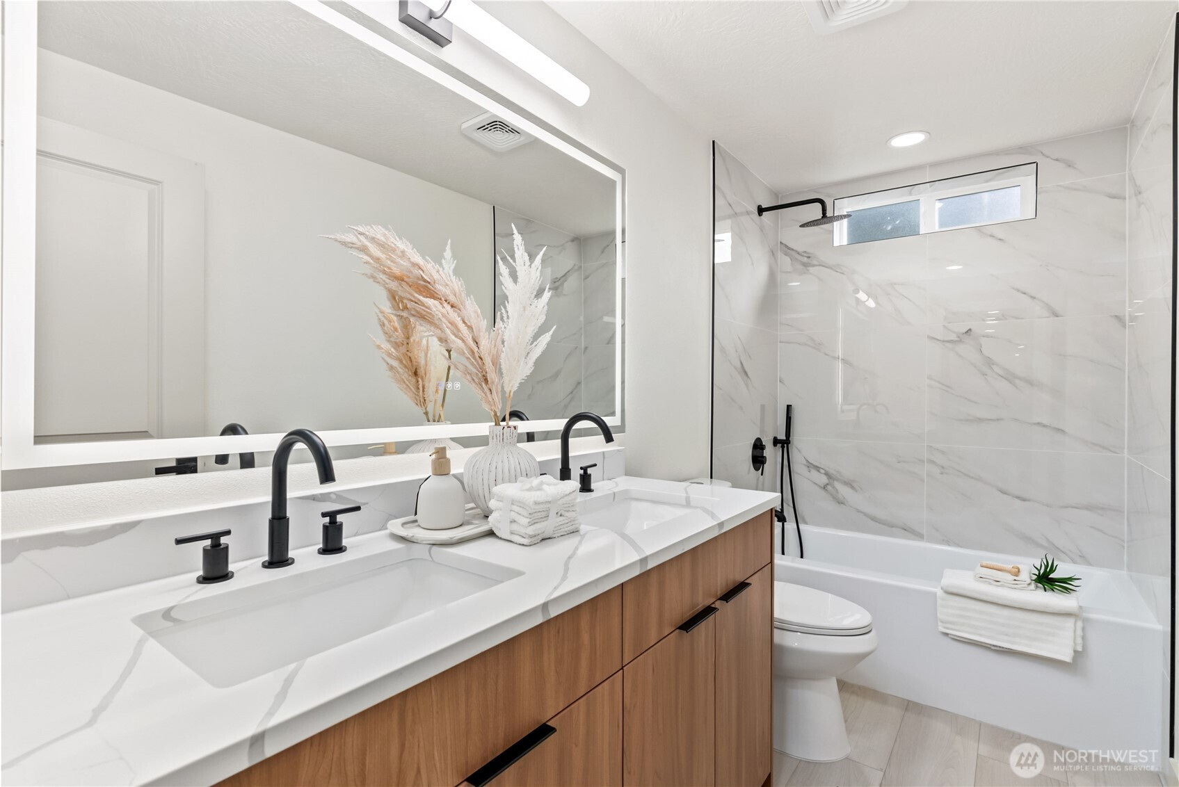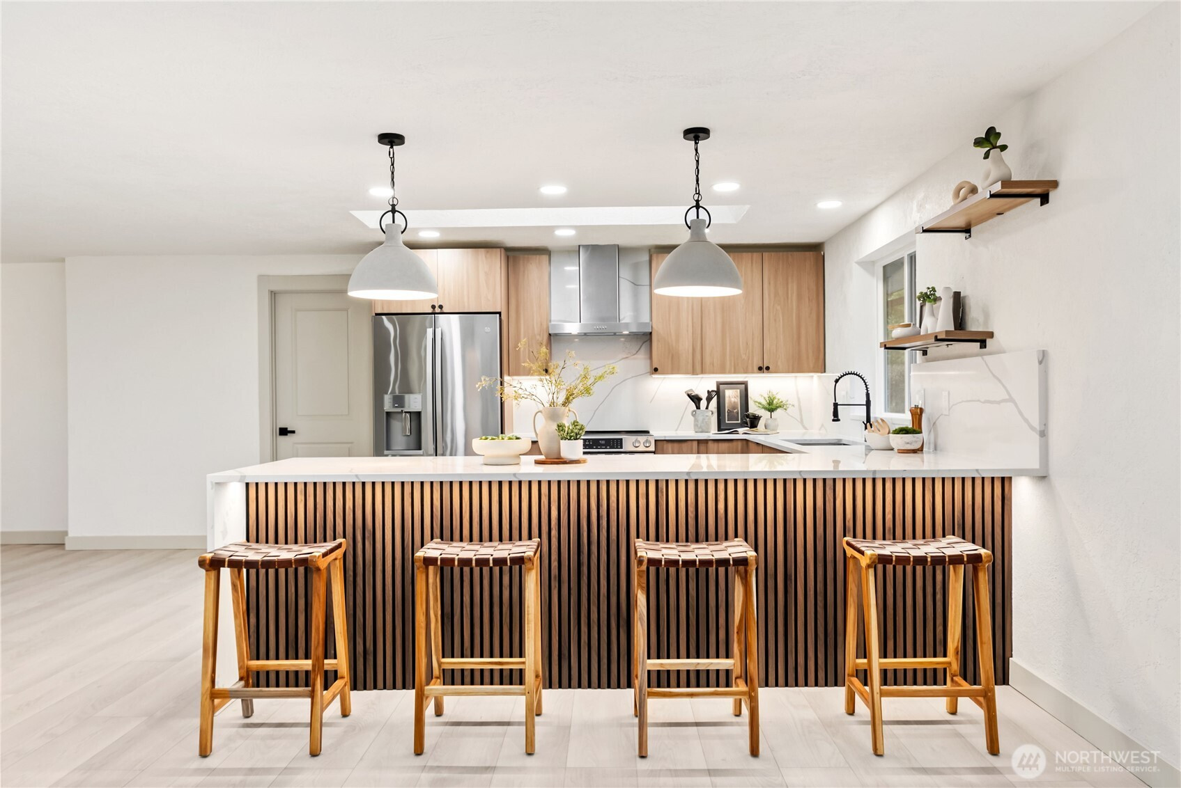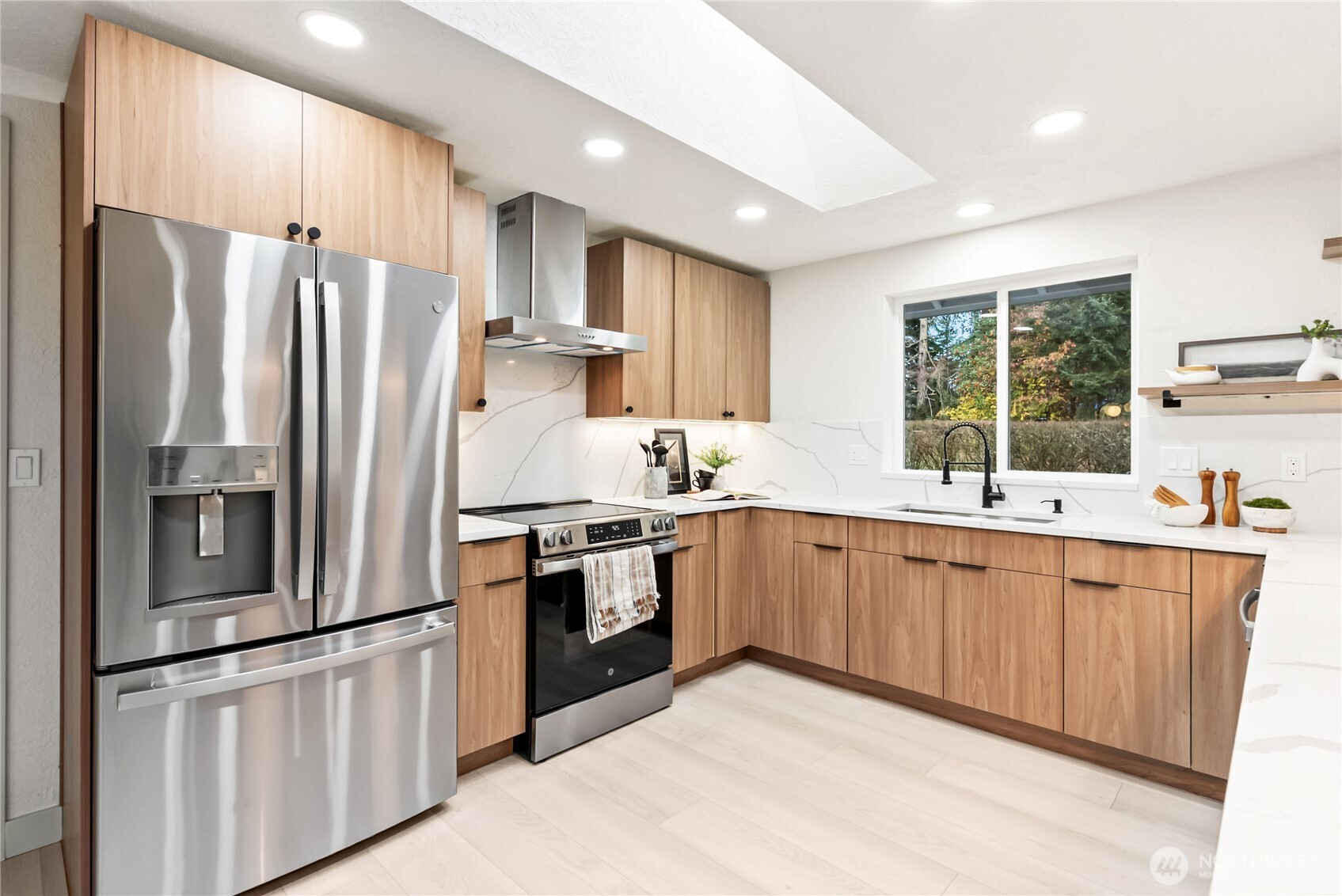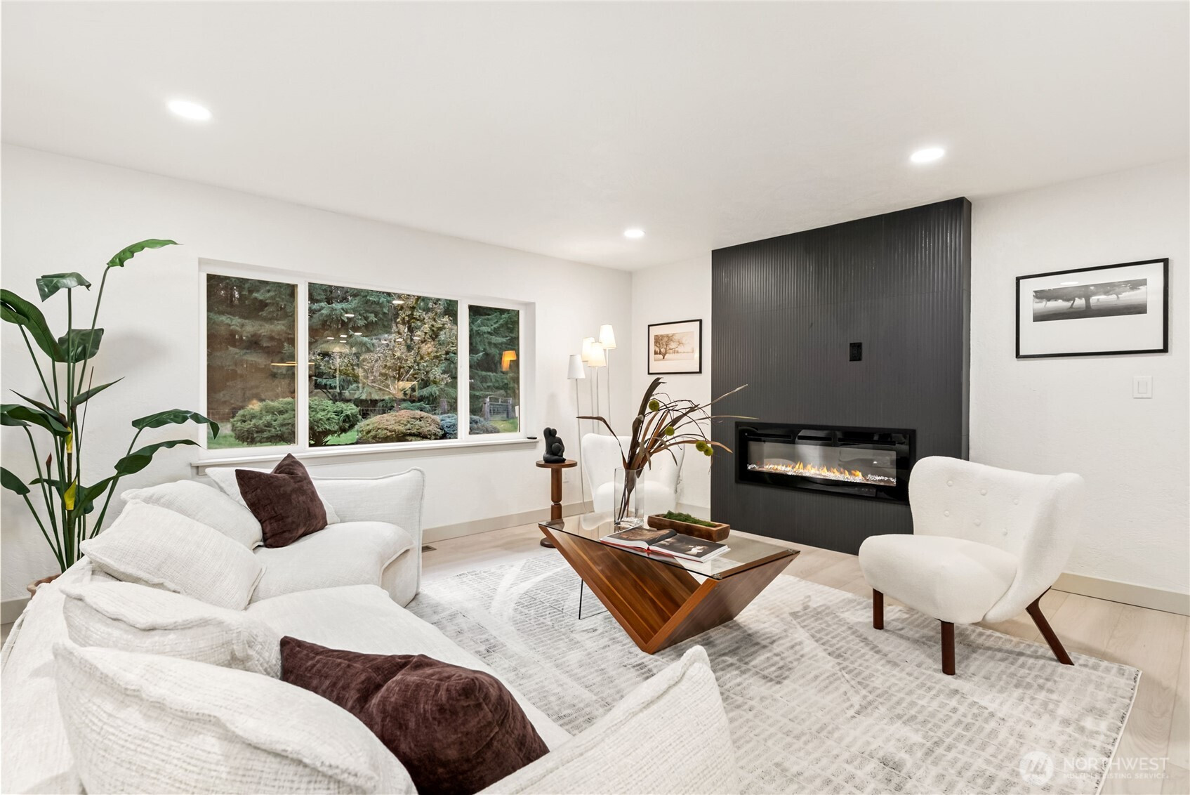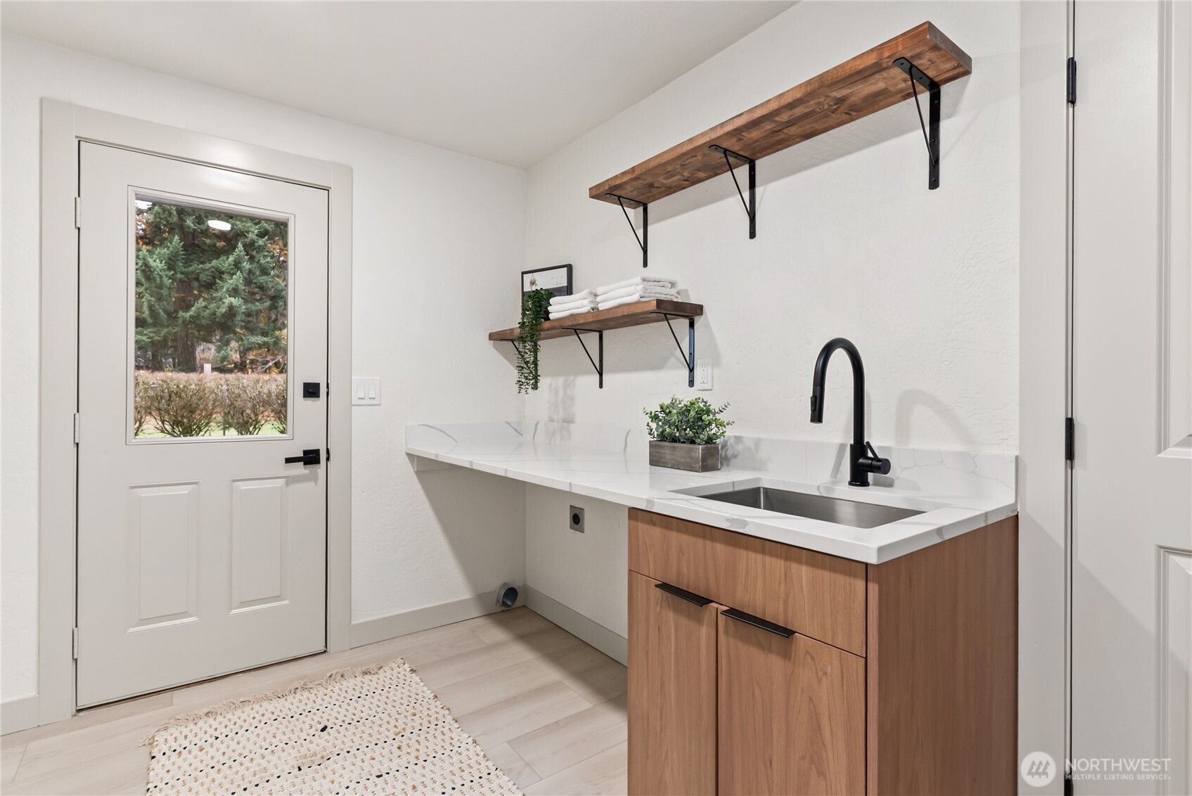 Rare opportunity to own over 2 private acres in desirable Olympia, featuring a beautifully updated farmhouse-style rambler designed for comfort and effortless living. This single-story 4-bedroom, 3-bath home truly checks every box. Thoughtfully upgraded with a new roof, heat pump, and sprinkler system, the property offers peace of mind along with exceptional functionality. A spacious 3-car garage plus an additional garage for lawn equipment provides abundant parking and storage for all your needs. Inside, the open-concept layout is warm and inviting. Enjoy both a generous family room and living room centered around a cozy electric fireplace, plus a formal dining room perfect for gatherings. The custom kitchen is a standout, showcasing soft-close cabinetry, stainless steel appliances, a waterfall-edge island, and a skylight that fills the space with natural light. The well-appointed laundry room includes a folding counter, sink, and ample storage, along with an additional powder room for convenience. Three oversized secondary bedrooms offer flexibility, while the stunning primary suite features a designer accent wall, barn doors, walk-in closet, and a beautifully finished custom bath. Fully fenced for pets and ideally located near Mud Bay, schools, and easy freeway access, this exceptional property blends privacy, space, and everyday convenience.