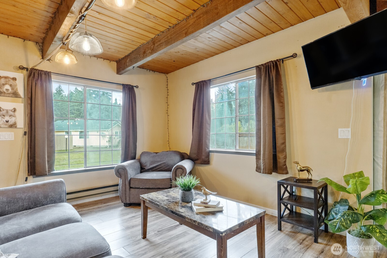 Fantastic and unique townhouse in the perfect Lacey location. This home is full of character! With wood-beam ceilings on the main floor, a wood-burning fireplace, and an open-concept living space, you will feel immediately at home. The kitchen is complete with a breakfast bar, and all appliances stay. On the upper level, you will find two bedrooms and a full bath. Step outside to your own fenced-in space ready for you to relax or entertain. Enjoy the community amenities, nearby restaurants, and shopping!