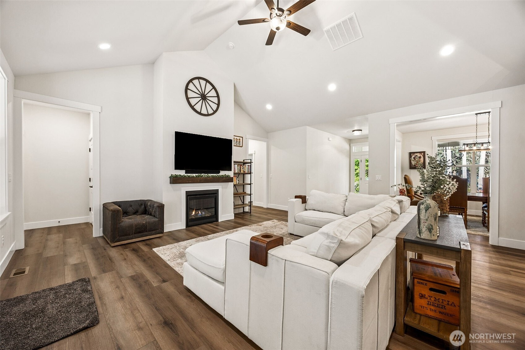Experience Pacific Northwest living in this 2023 modern farmhouse, on 1.75 acres in the desirable NE Olympia area. Surrounded by towering evergreens & natural beauty, this home offers the space, serenity, & lifestyle the Northwest is known for, yet remains just minutes from recreation, shopping & dining in Hawks Prairie. Designed for comfort & connection to the outdoors, the home welcomes you with a covered front porch & invites year-round enjoyment on the covered back patio overlooking the fenced yard. Harvest your own blueberries, raspberries, plums, apples & nectarines, plant a garden, park your RV; there’s room for it all. With an individual well & no HOA, you’ll enjoy true independence & privacy. Inside, this 4-bedroom, 3-bath home features a thoughtful split floorplan & abundant storage throughout. Luxury vinyl plank flooring flows through the main living areas & carpet in most bedrooms. The vaulted family room, anchored by a cozy gas fireplace, creates a warm & inviting gathering space. The kitchen is beautifully appointed with quartz countertops, double ovens, a large island, dining nook, a butler’s pantry & separate dining room; ideal for entertaining & everyday living. The primary suite offers a spa-like ensuite retreat, while two secondary bedrooms share a convenient double-entry bath. Modern systems include heat pump HVAC, an 80-gal. heat pump water heater with recirculation pump, built-in generator, & a 500-gal. propane tank. Private. Peaceful. Pure Northwest.