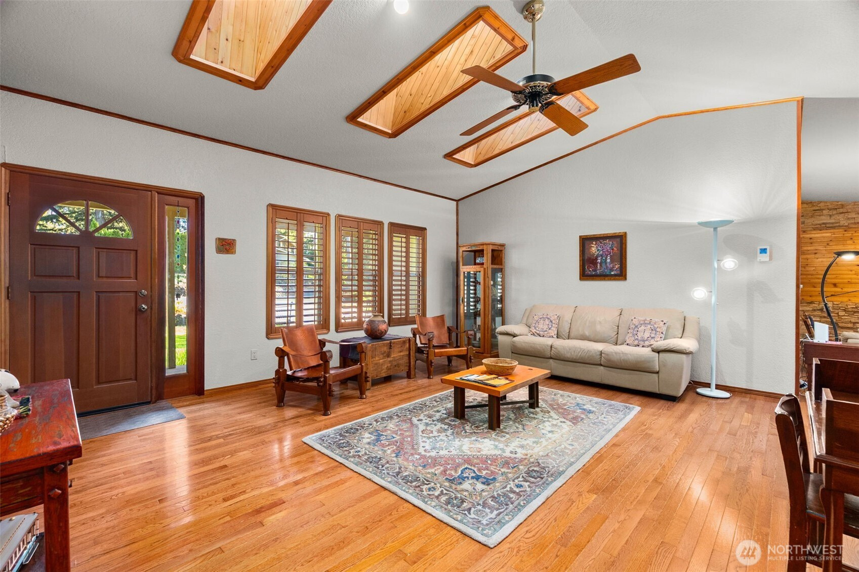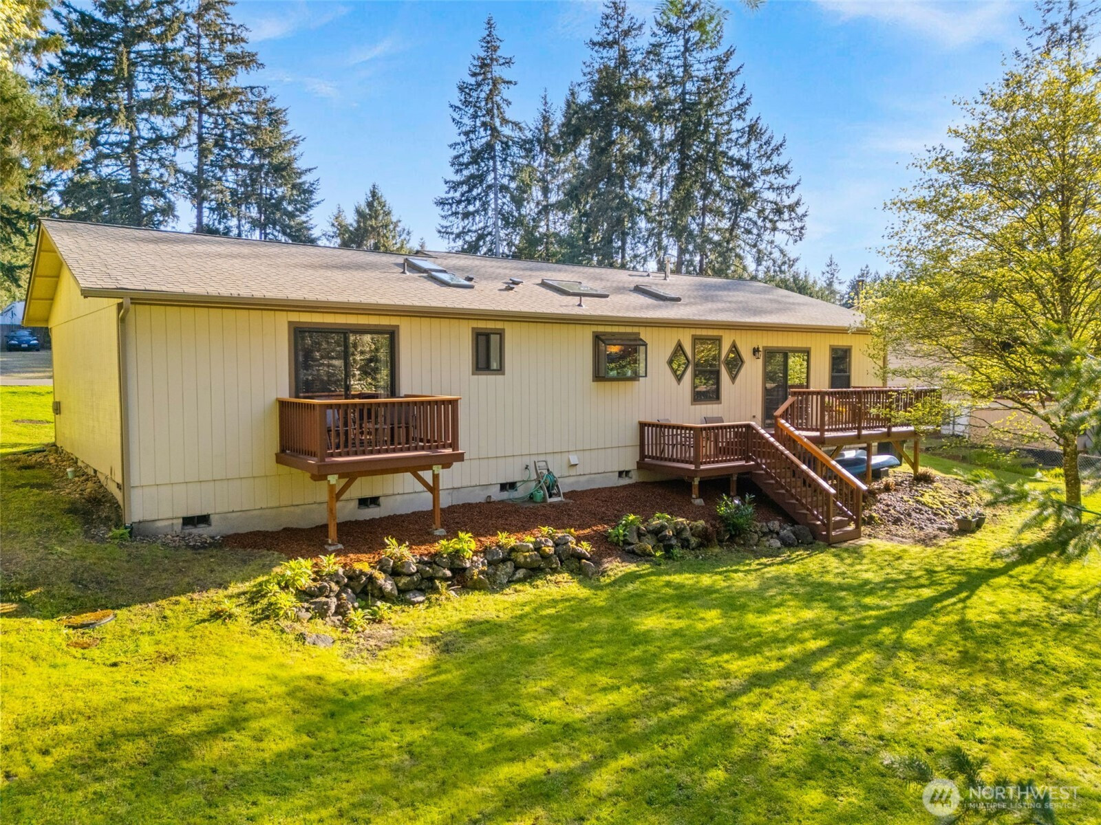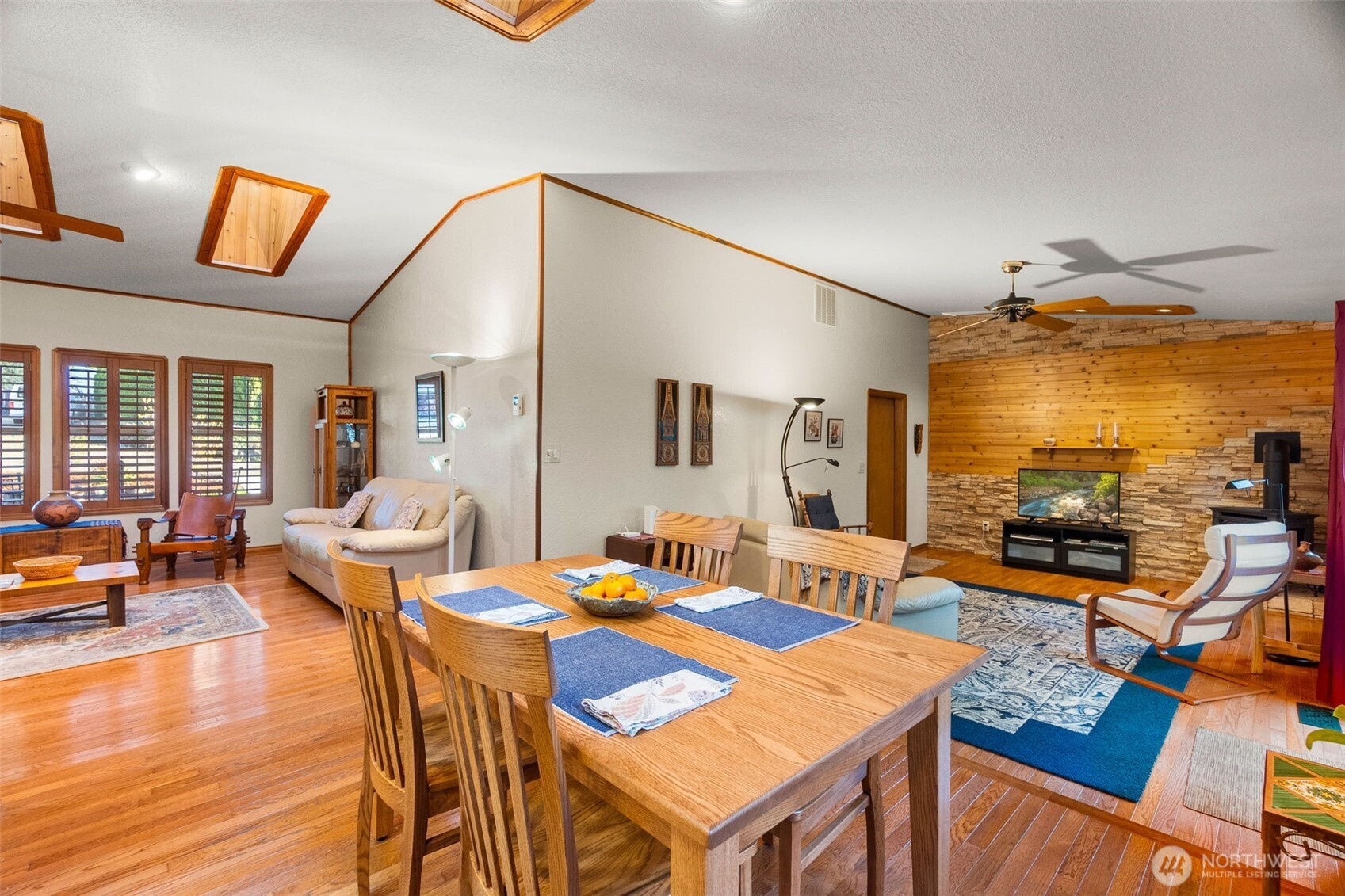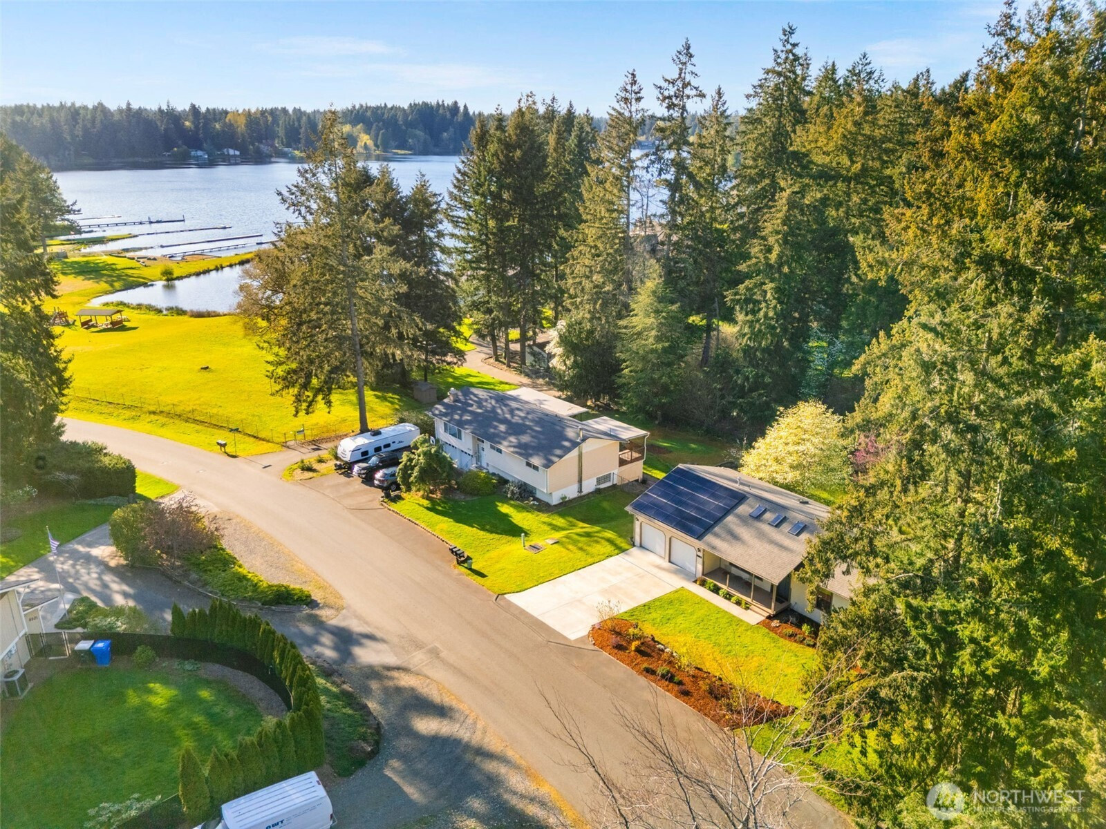 You don’t find many homes maintained as well as this one! Features ornate woodwork throughout, 3-BR, 2 -BA, 1568 SF, primary bedroom with ensuite bath and jetted tub, kitchen with custom tiled backsplash, stainless appliances, all overlooking the great room with a new gas fireplace and a stone wall back splash. Hardwood floors and tile throughout the entire home, 7 wood lined skylights, vaulted ceilings, plantation shutters, & ceiling fans. Owned solar system, installed in 2022, to keep those utility bills in check! 30-year architectural comp. roof installed in 2022 and the driveway replaced in 2024. Multiple rear decks look over the back yard with lots of mature flowering trees. All just a short walk to gated private access of Hicks Lake w/dock, boat launch, cabana and a play area! Minutes to I-5, shopping and schools.