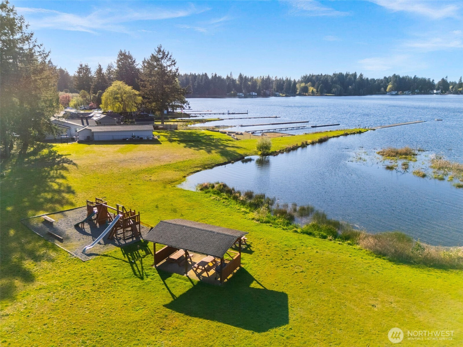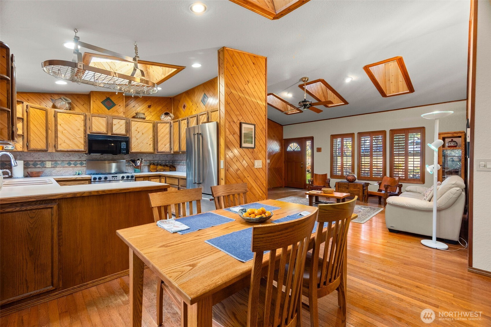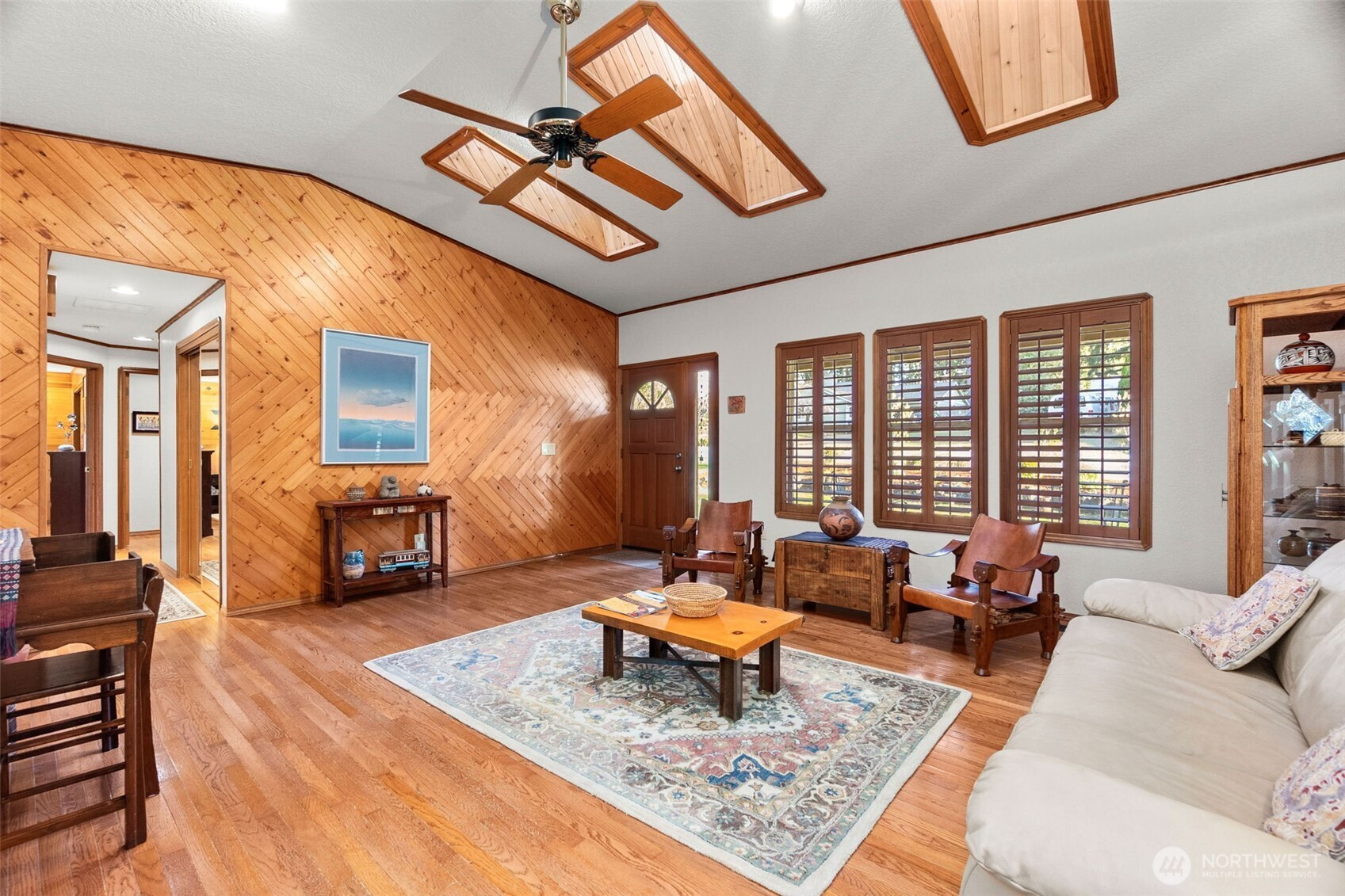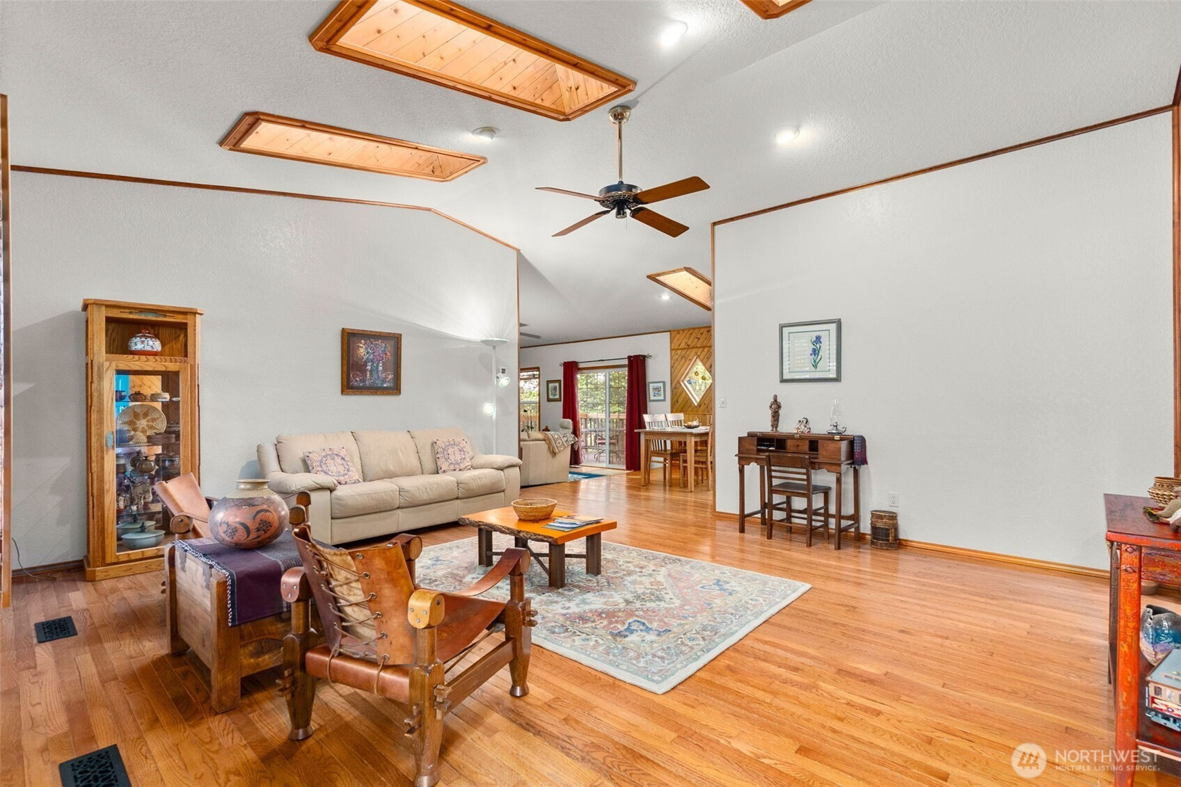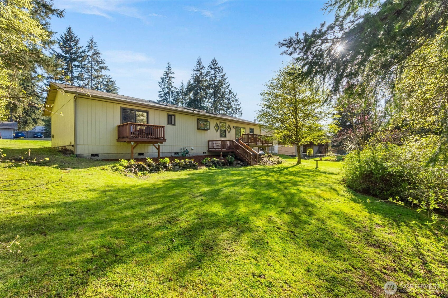 You don’t find many homes maintained as well as this one! Features ornate woodwork throughout, 3-BR, 2 -BA, 1568 SF, primary bedroom with ensuite bath and jetted tub, kitchen with custom tiled backsplash, stainless appliances, all overlooking the great room with a new gas fireplace and a stone wall back splash. Hardwood floors and tile throughout the entire home, 7 wood lined skylights, vaulted ceilings, plantation shutters, & ceiling fans. Owned solar system, installed in 2022, to keep those utility bills in check! 30-year architectural comp. roof installed in 2022 and the driveway replaced in 2024. Multiple rear decks look over the back yard with lots of mature flowering trees. All just a short walk to gated private access of Hicks Lake w/dock, boat launch, cabana and a play area! Minutes to I-5, shopping and schools.